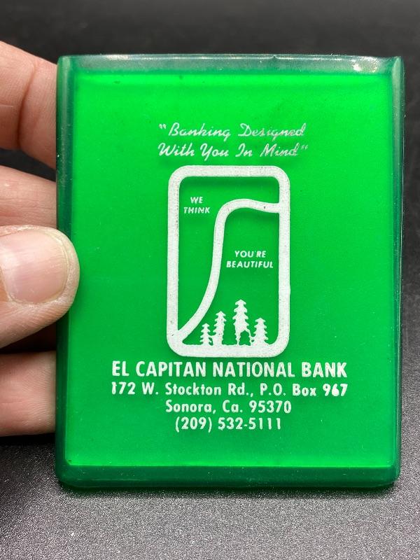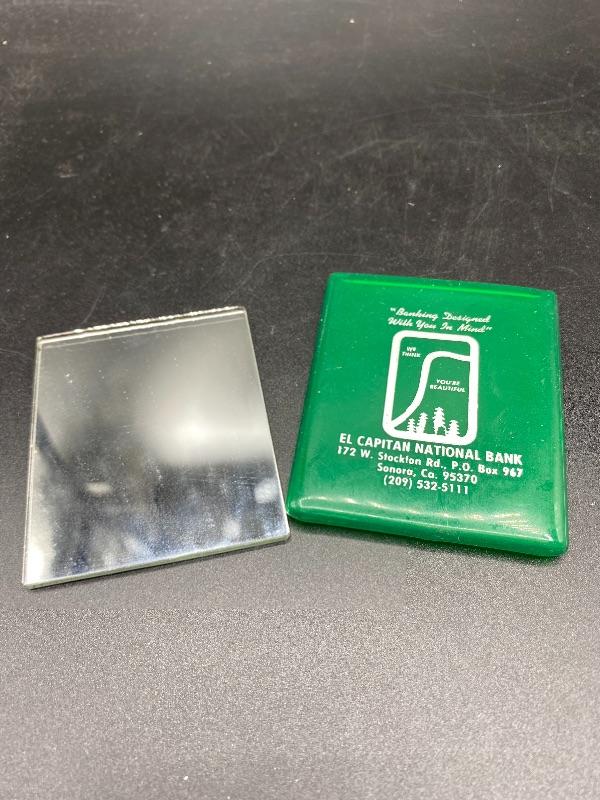 Advertisement pocket mirror in rubber sleeve. Given out by El Capitan National Bank. In good condition.