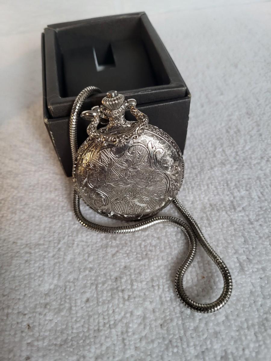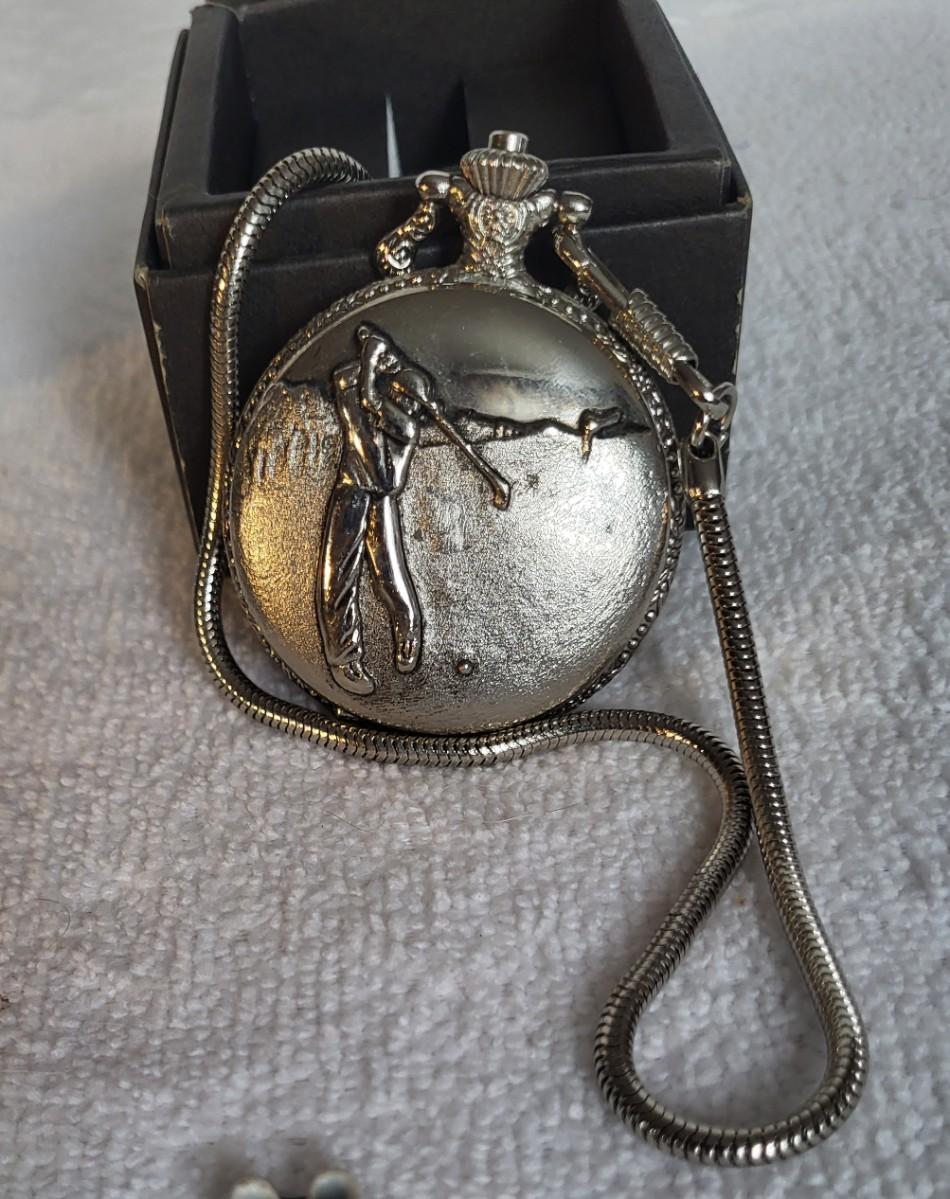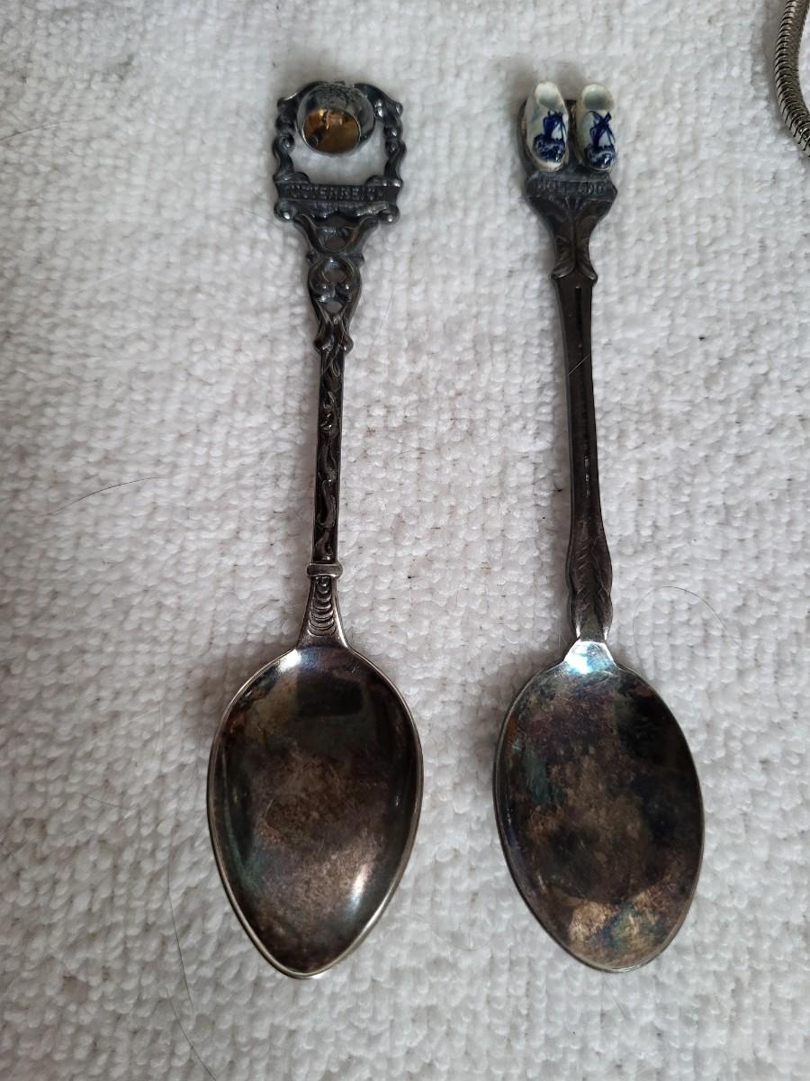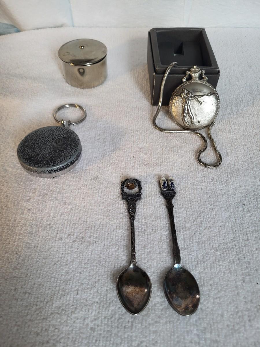 POCKET WATCH, SILVER PLATED BOX AND SPOONS PLUS RETRACTABLE KEYCHAIN