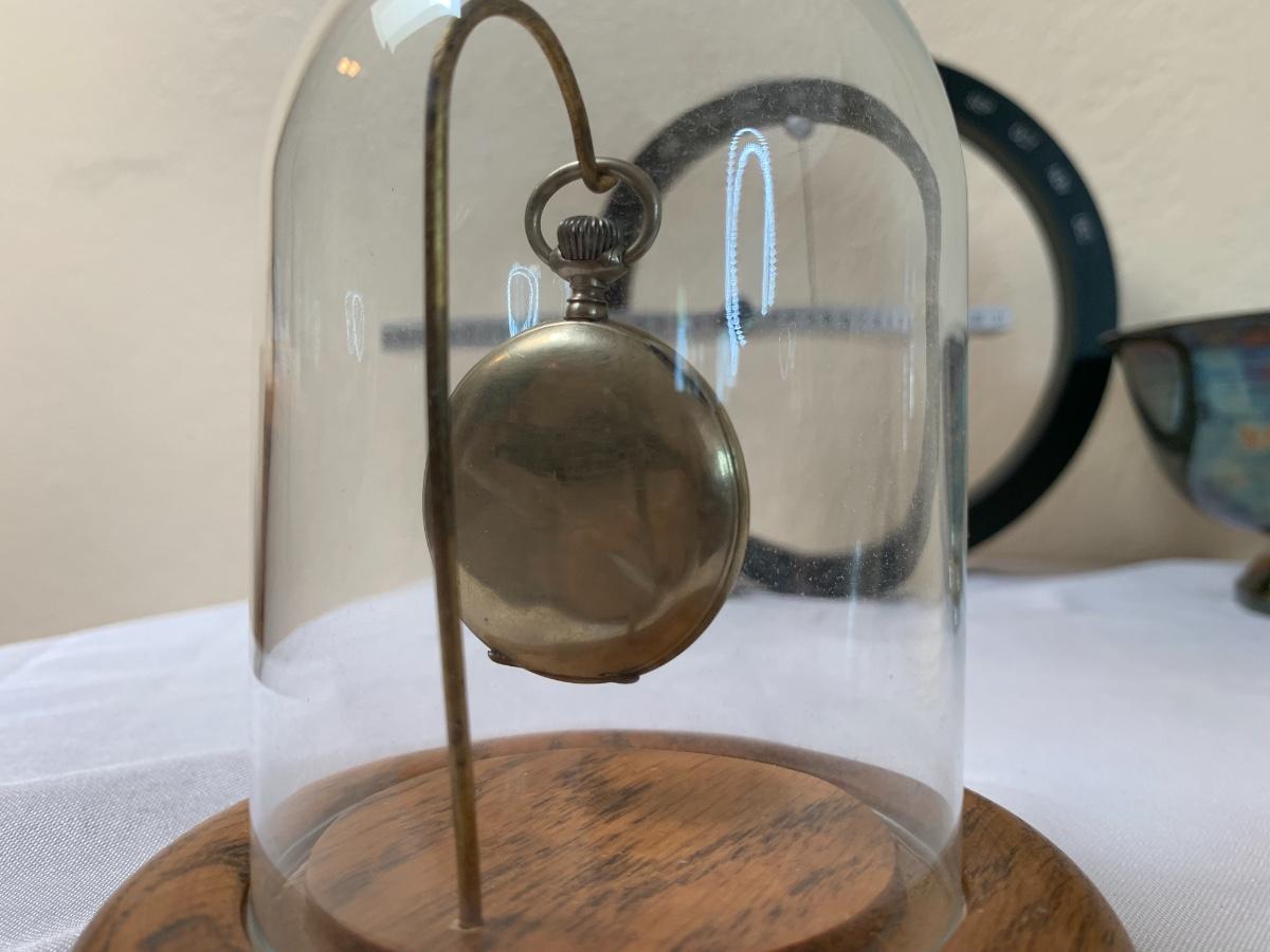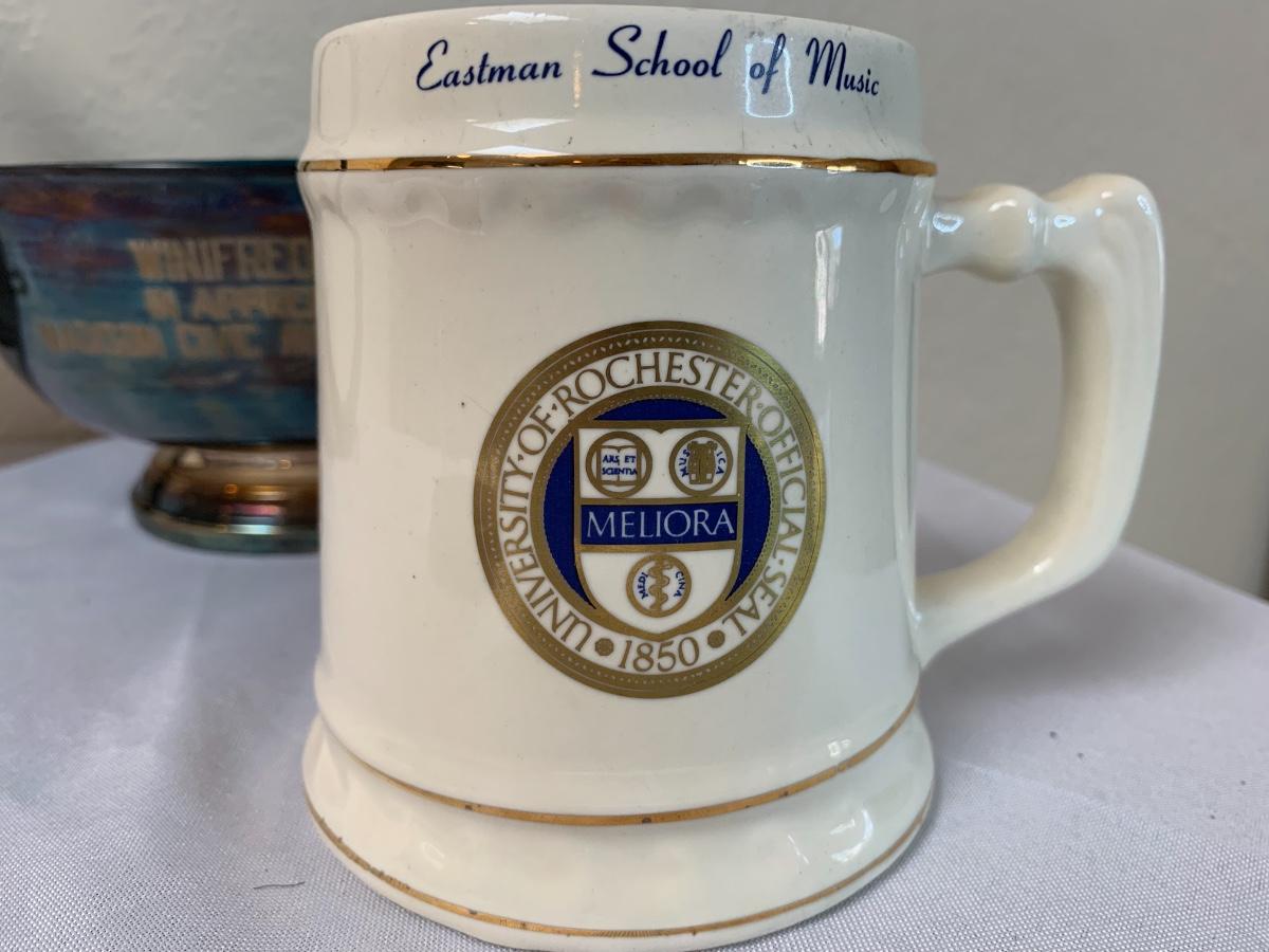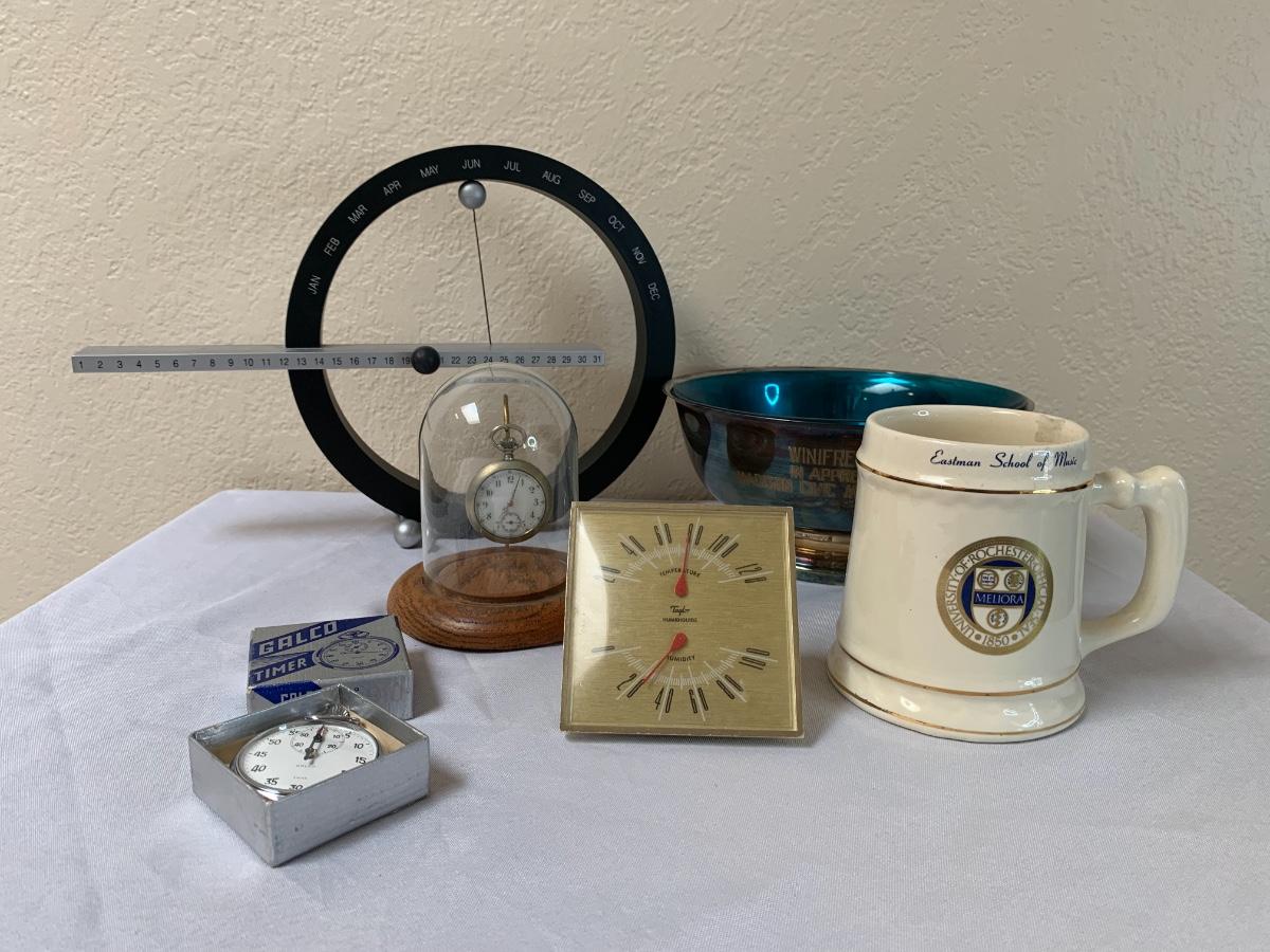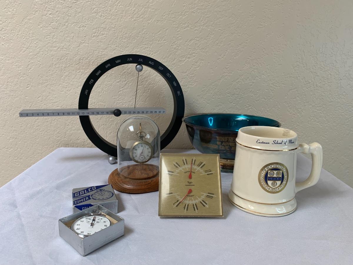 Assortment of one gold tone case pocket watch, one eternal calendar, one Gorham silver bowl with a blue glass insert *engraved*, one Eastman school of music mug made in USA and one Taylor humidity gage. All in good condition
