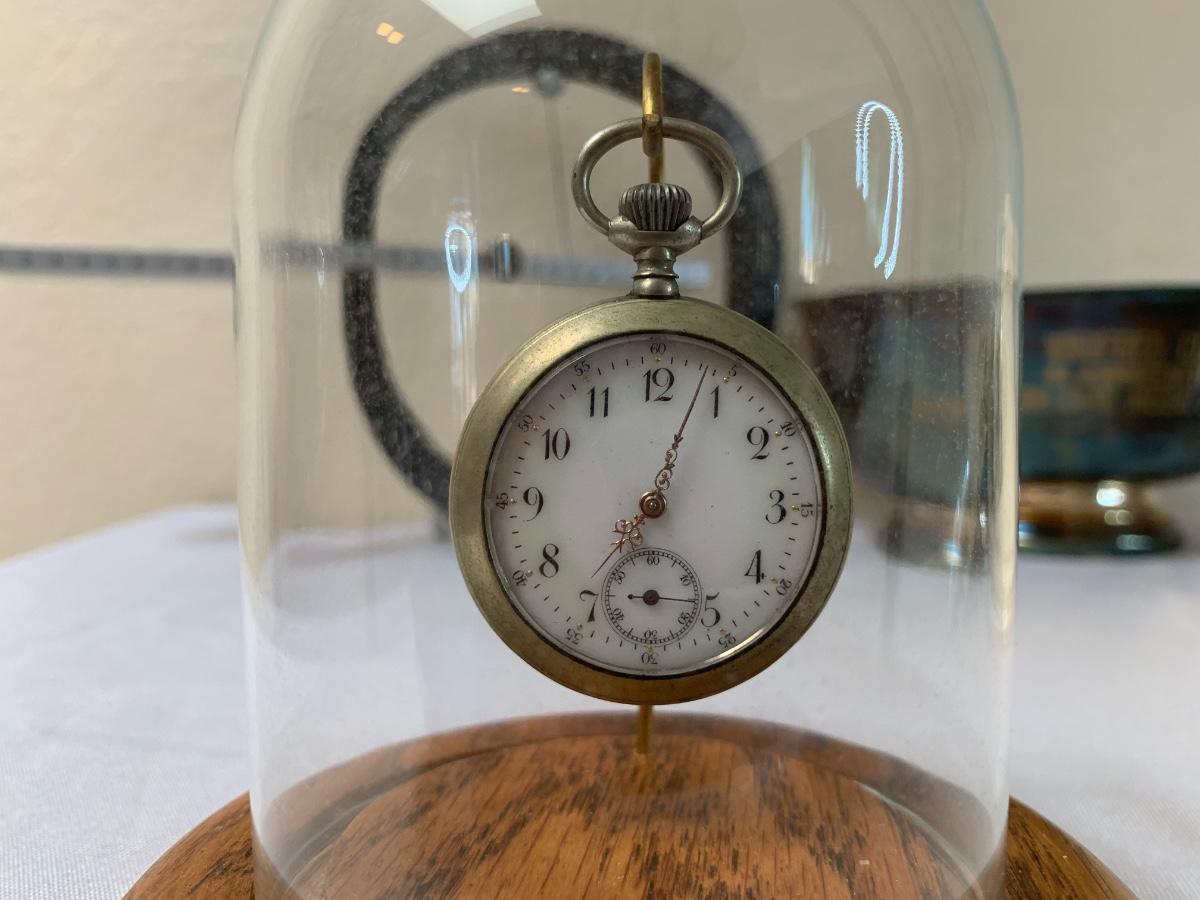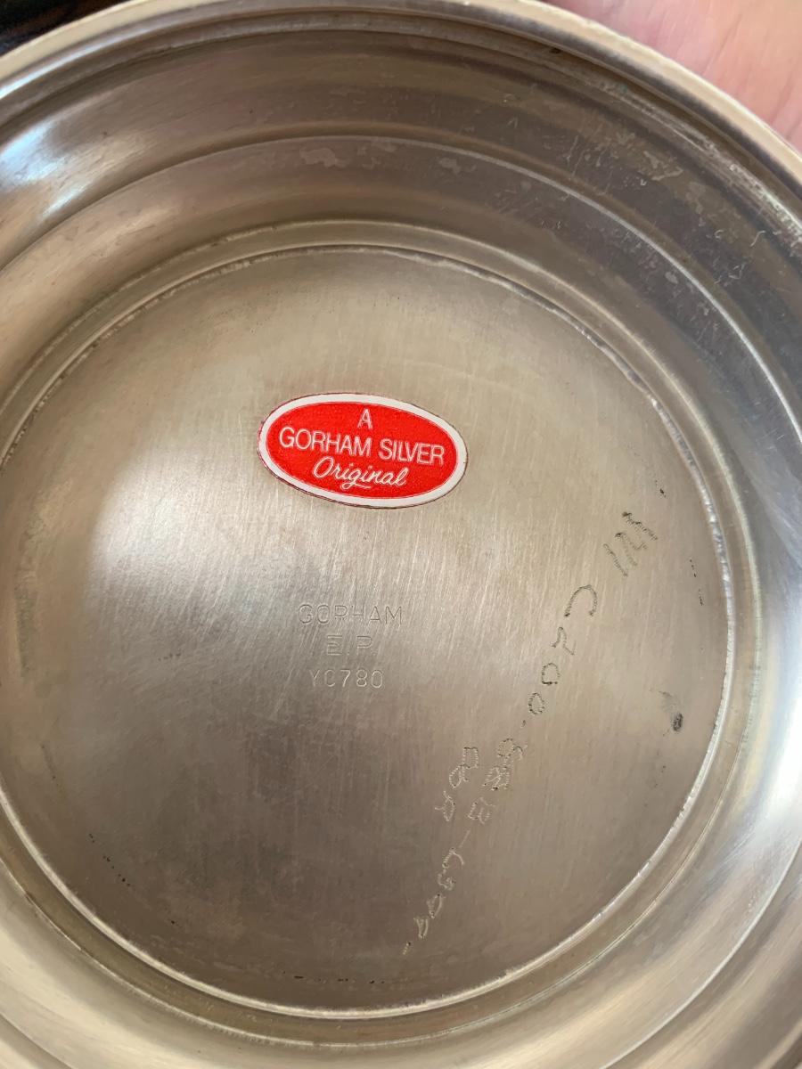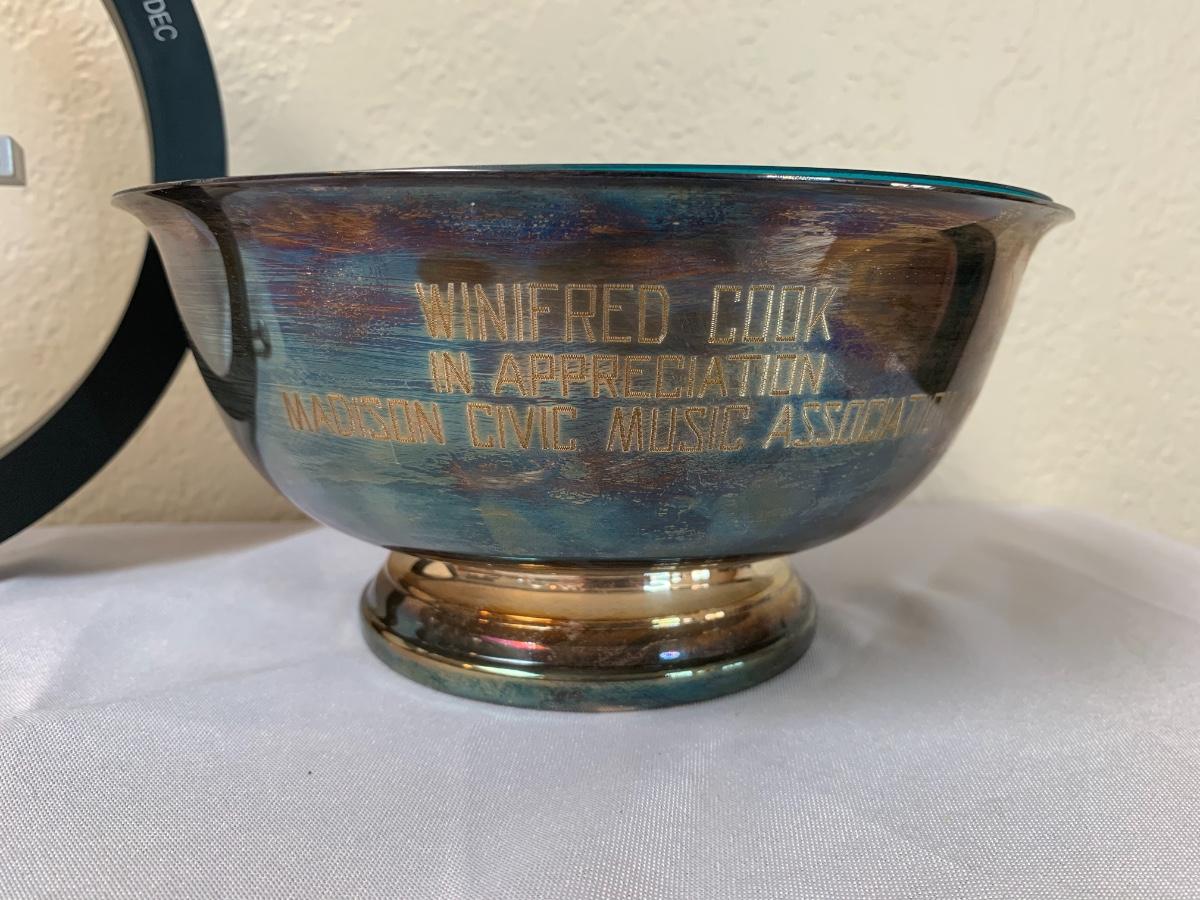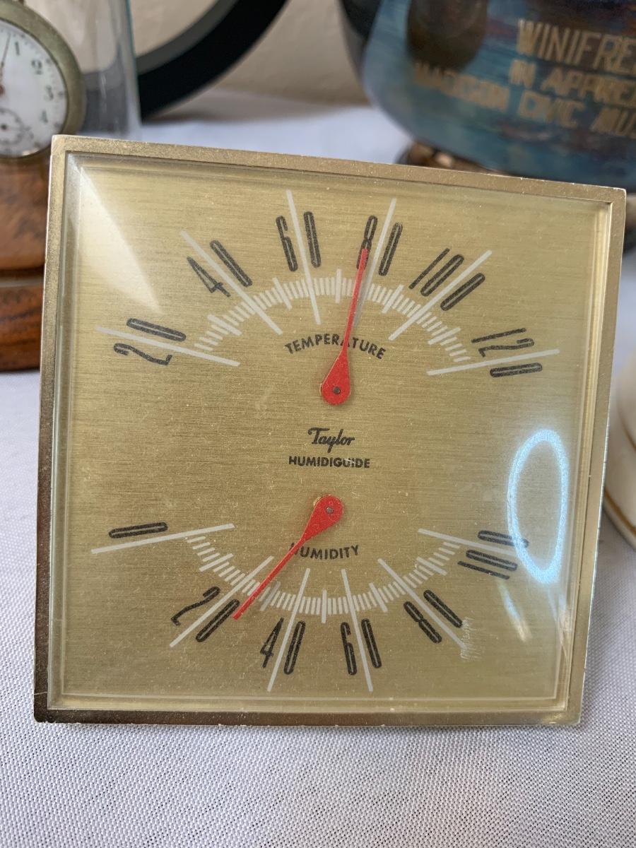 Assortment of one gold tone case pocket watch, one eternal calendar, one Gorham silver bowl with a blue glass insert *engraved*, one Eastman school of music mug made in USA and one Taylor humidity gage. All in good condition