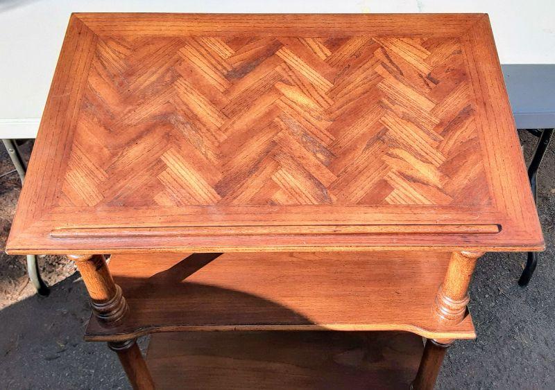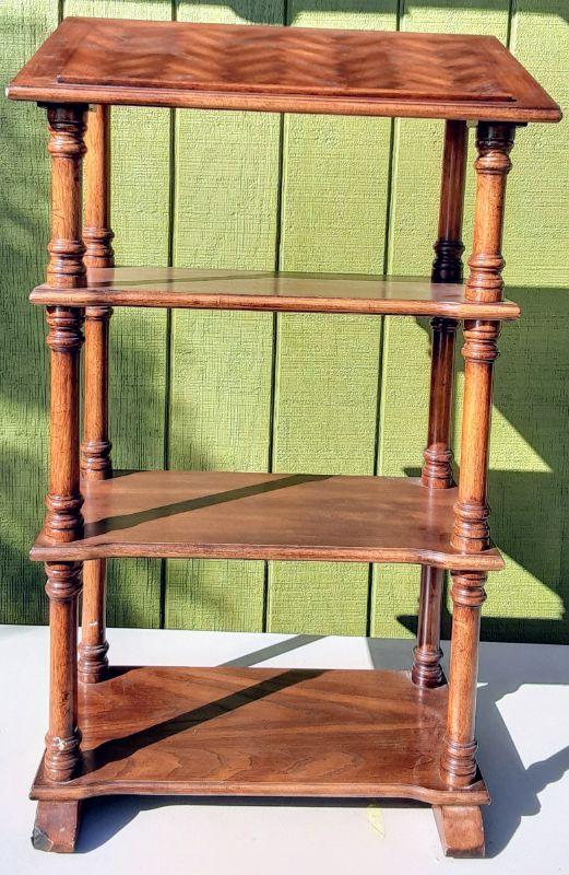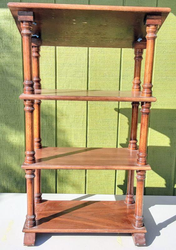 The top is slanted for with a lip at one end designed to hold an open book or papers in place. The shelves can hold knickknacks or more books. Measures 40in. tall and 14in. wide