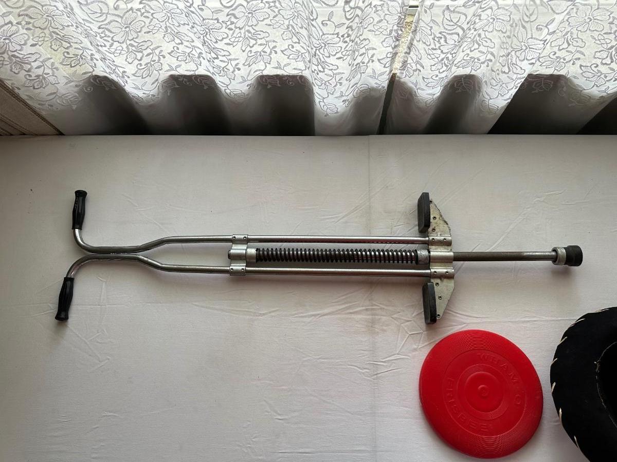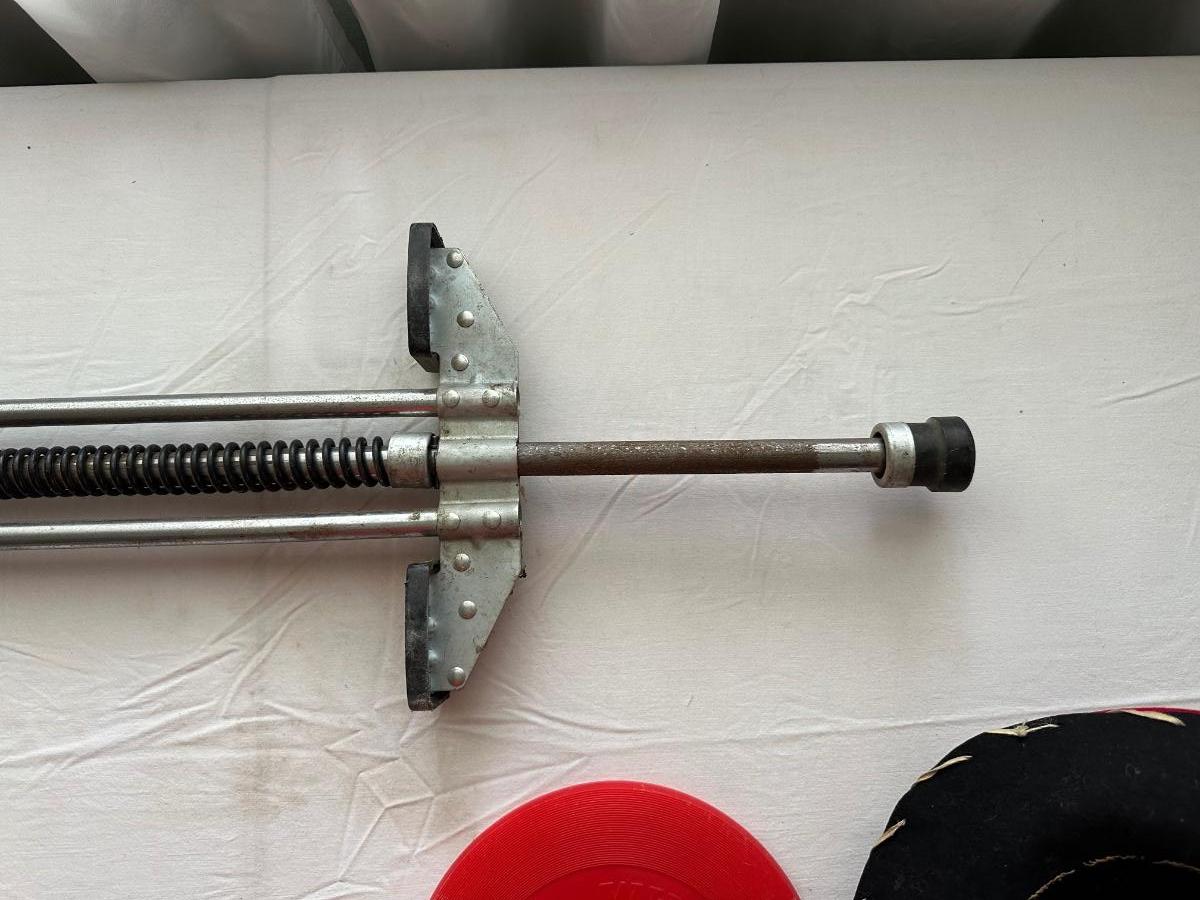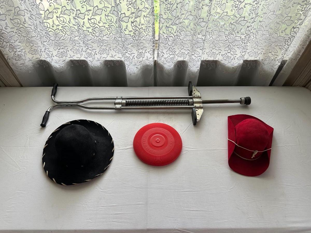 POGO STICK, CHILD'S HATS AND A FRISBEE