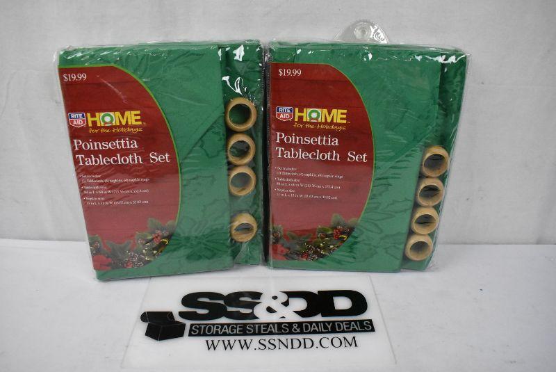 Poinsettia Tablecloth Sets, Qty 2: Green Tablecloths w/ Napkins & Rings - New