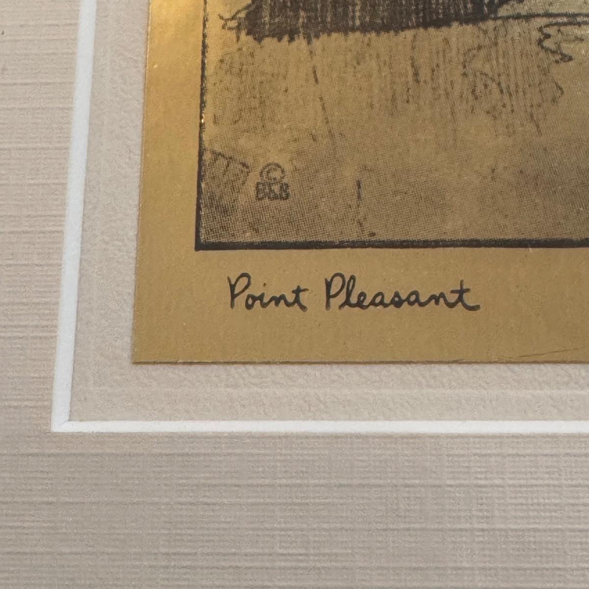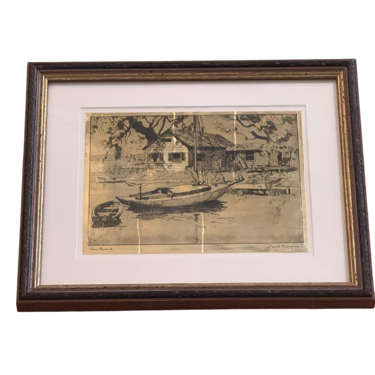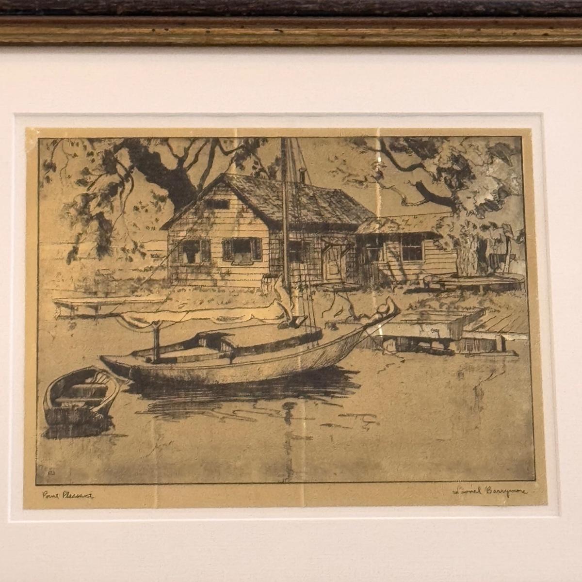 Lot includes two gold foil etchings titled “Point Pleasant” and “San Predro” - both by Lionel Barrymore. Each foil etchings is signed in the bottom right corner. The prints are matted and protected with glass in a wooden frame. The frames individually measure 12” x 10”H. Shipping available.