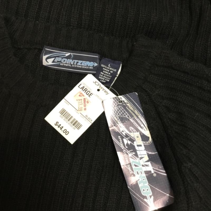 Here we have a Black ribbed sweater new with tags. This item is an adult size large in great condition, no stains or snags. This sweater is a nice thickness, and is sure to keep you warm. See pictures