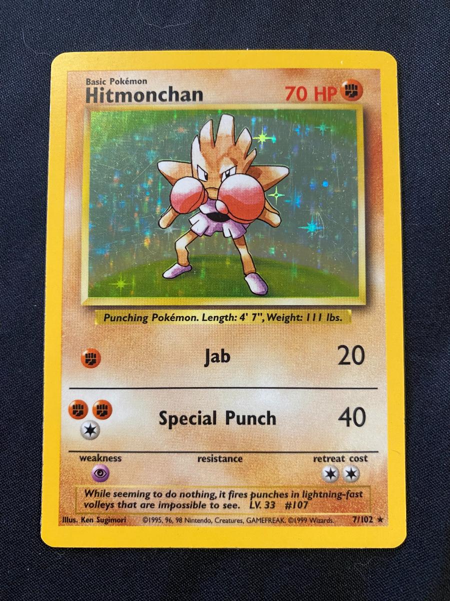 Pokemon Trading Card Game Base Set Holo Hitmonchan card, #7/102. Features holographic artwork with 70 HP. Manufactured by Wizards of the Coast in 1999. Condition is classified as light play with signs of minimal use. Iconic card from the original Base Set edition.