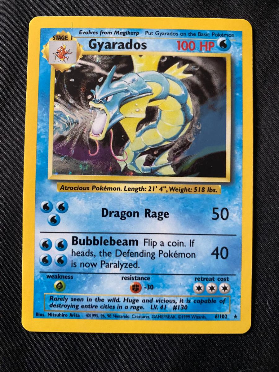 This listing is for a holographic Gyarados card from the Pokemon TCG Fossil set. The card is numbered 6/62 and has a light play condition. It features the classic Gyarados artwork by Ken Sugimori and includes the iconic holographic finish. Manufactured by Wizards of the Coast in 1999.