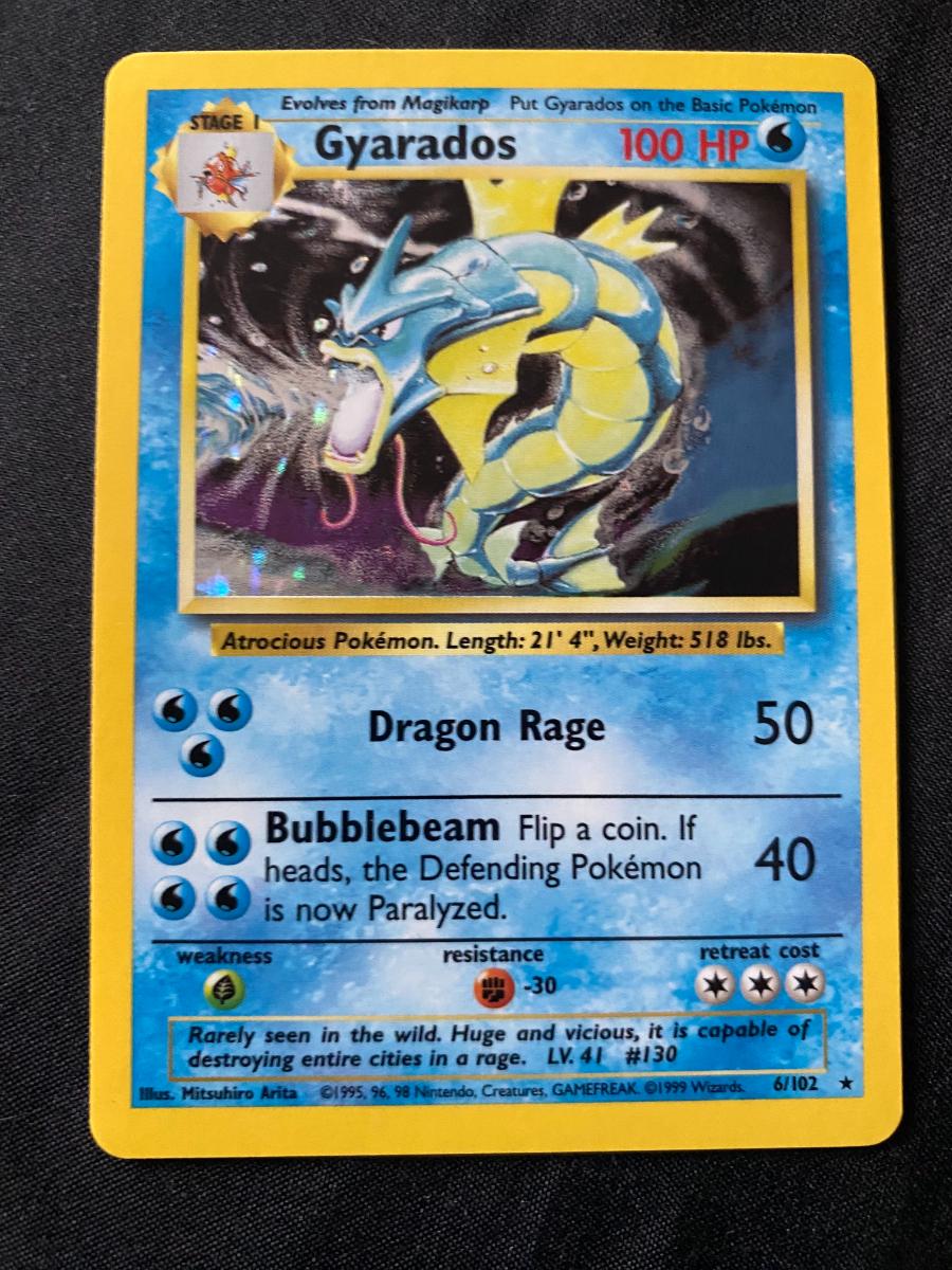 This listing is for a Pokemon Gyarados 6/102 holofoil card from the original Base Set. The card features a holographic image with a light play condition. It has 100 HP and includes the Dragon Rage and Bubblebeam attacks. This card displays the trademark Wizards of the Coast design and is a classic collectible.