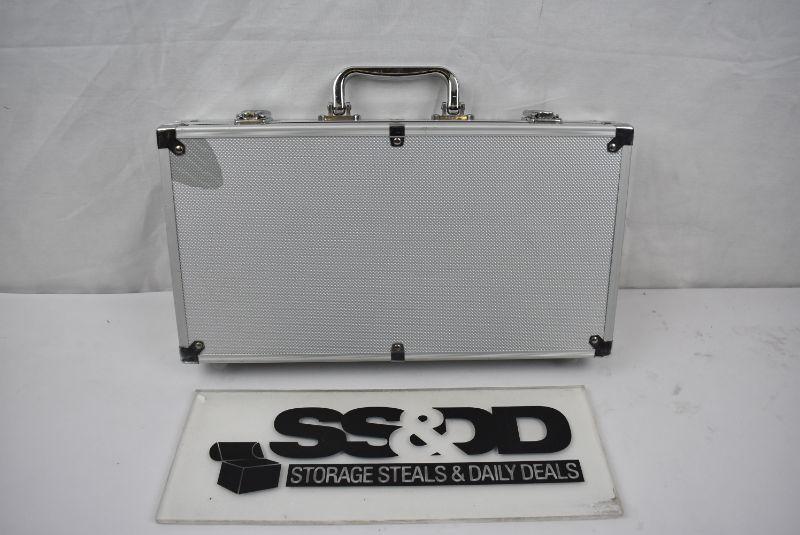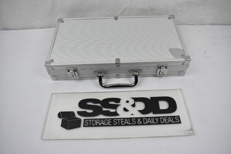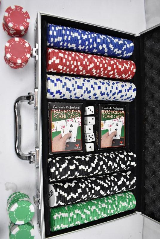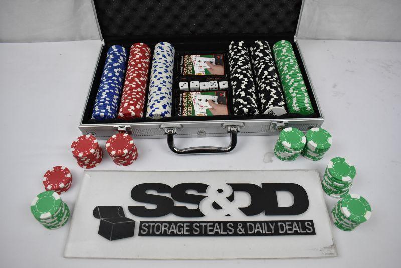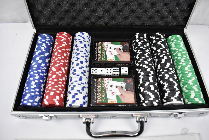 Poker Chip Set with Case. approx 385 Clay chips, 2 decks of cards, 5 dice