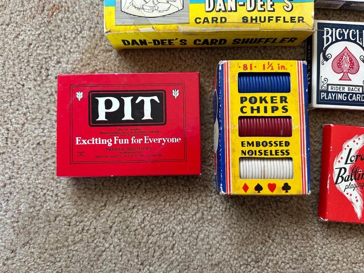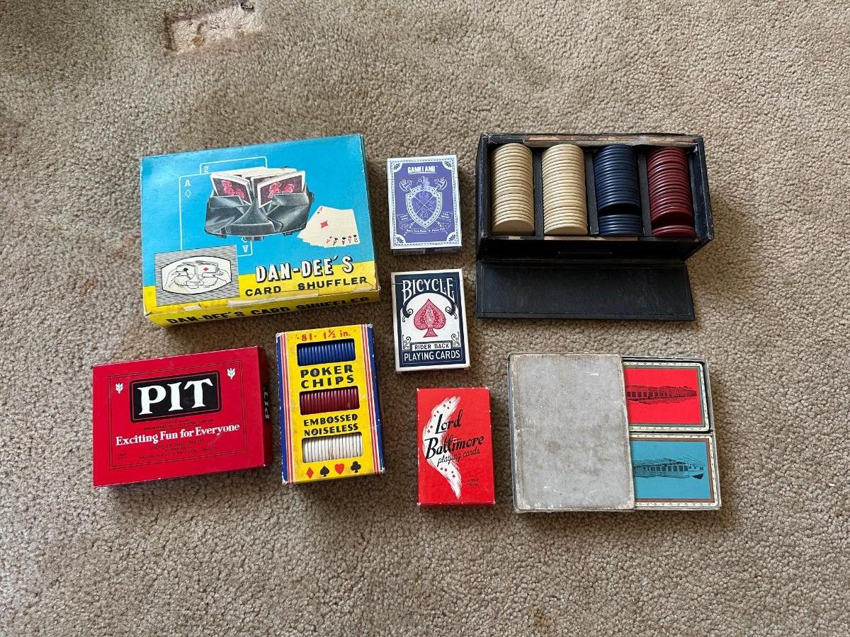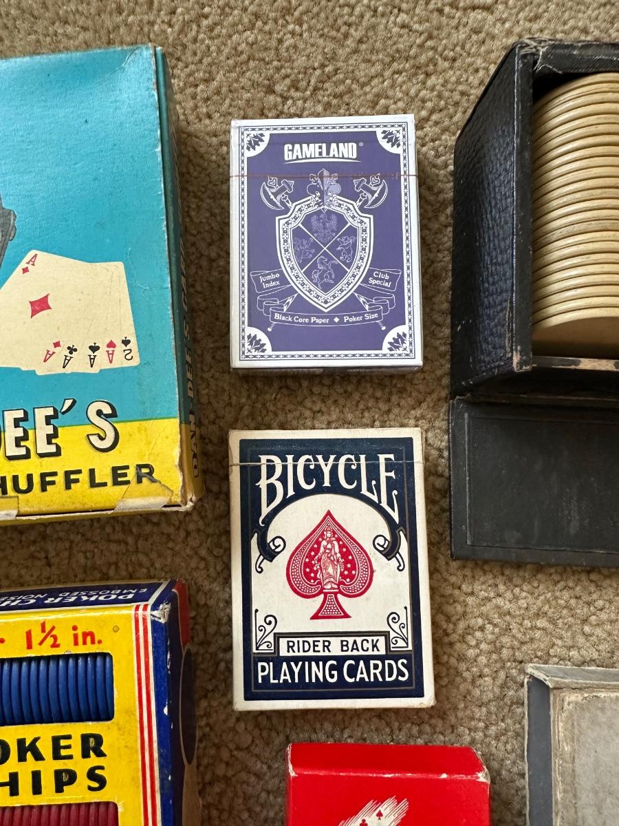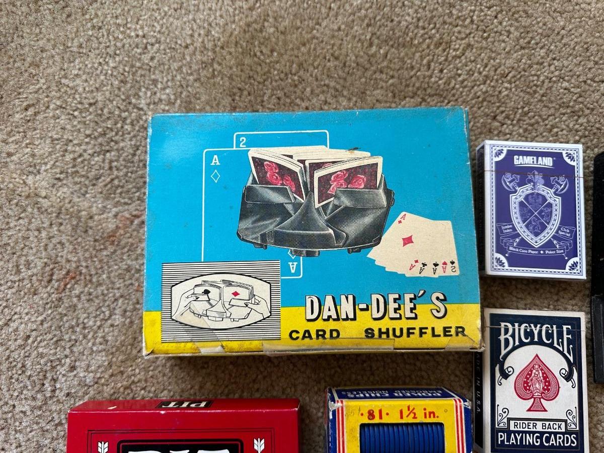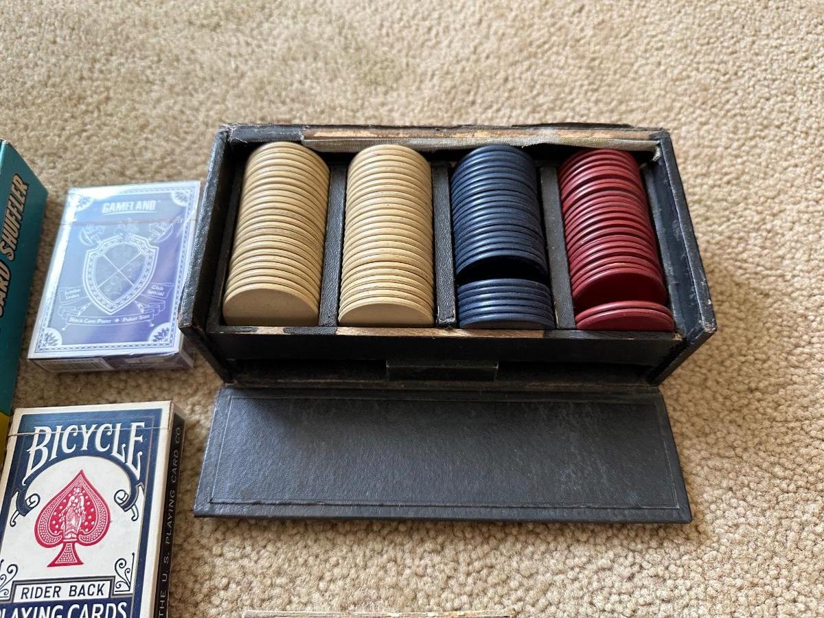 POKER CHIPS, DECKS OF CARDS AND A CARD SHUFFLER