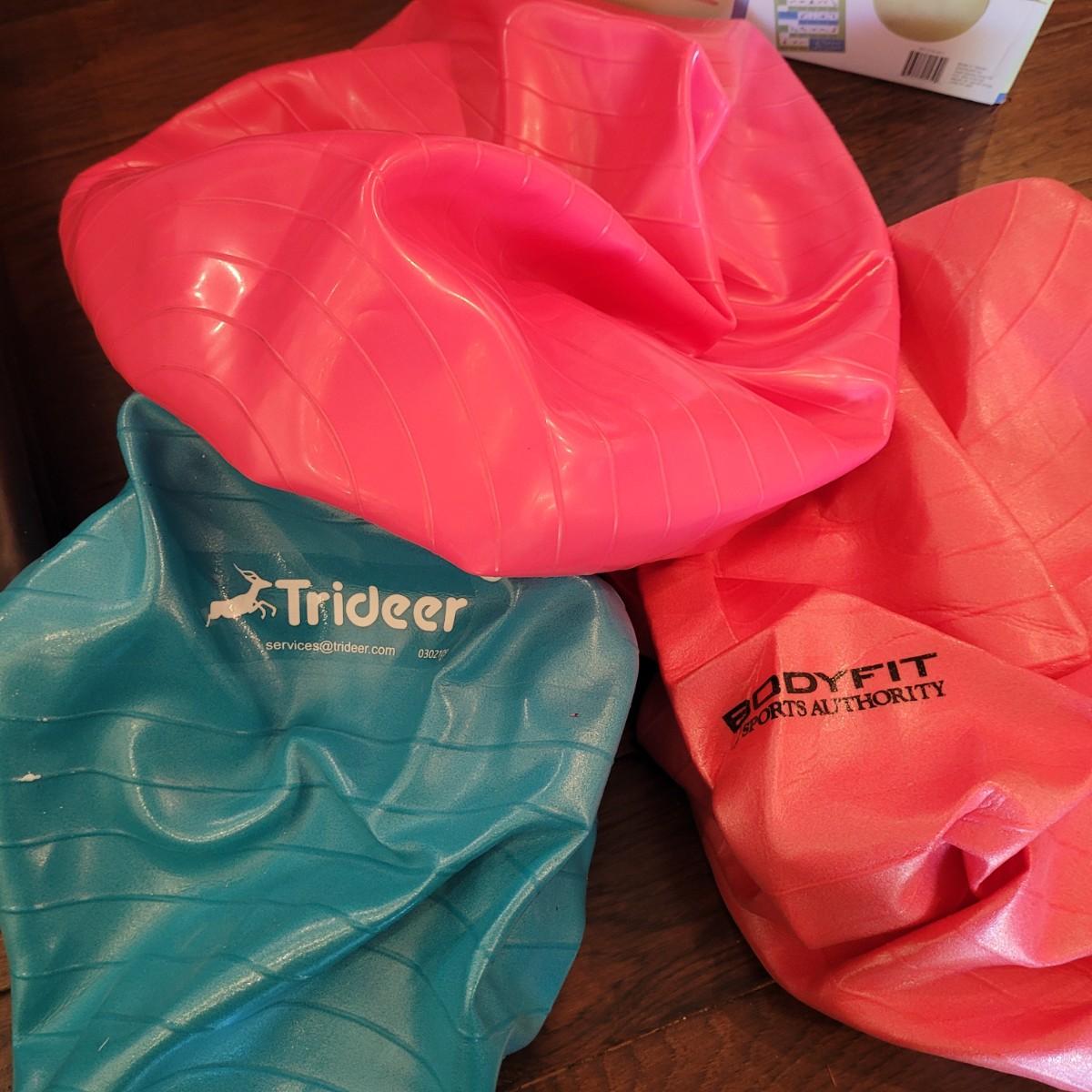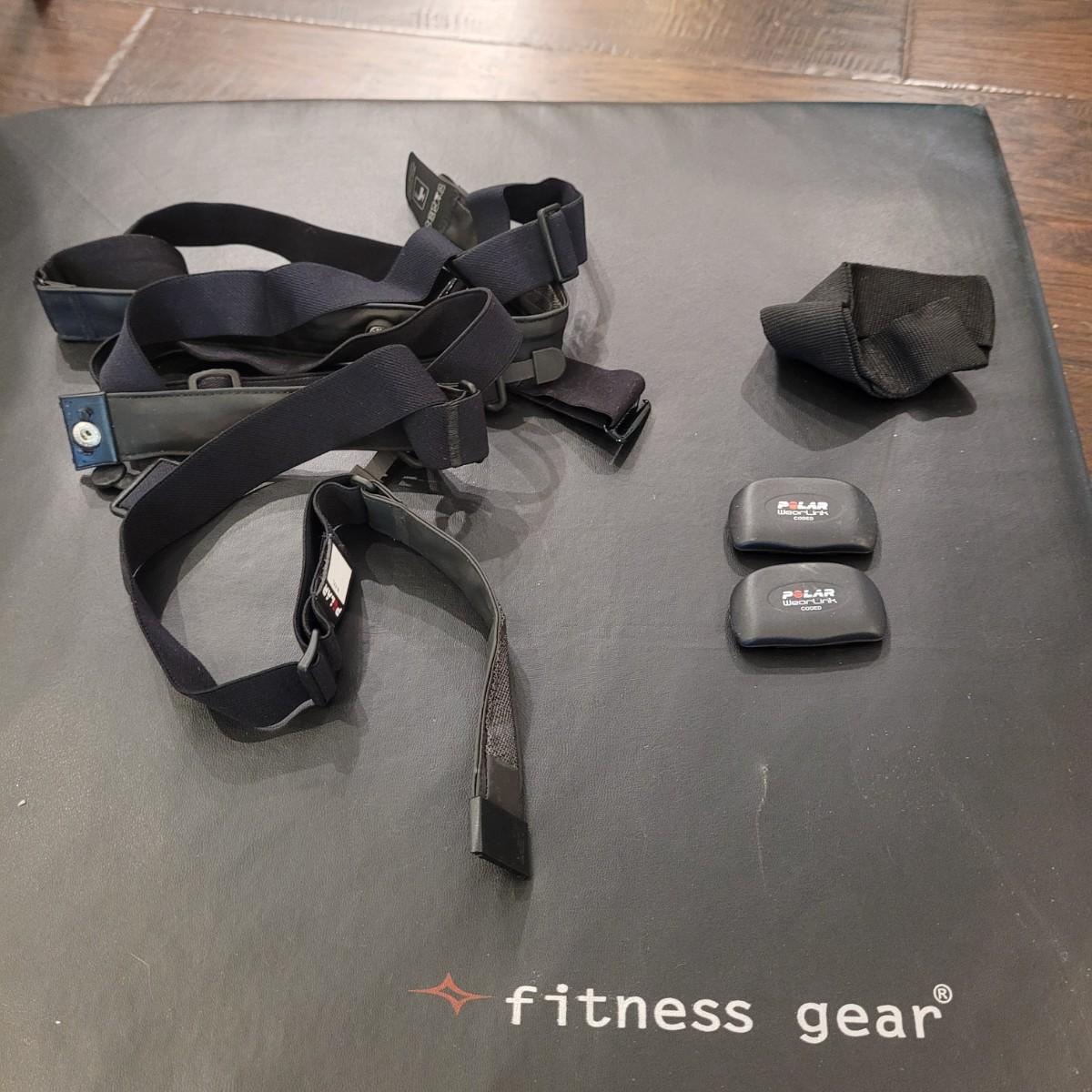 This lot of exercise equipment and accessories includes a variety of Polar heart rate monitors in bands and watches, small weights, stability balls, medicine balls, mats and more. Trifold mat measures approximately 11" x 67.5". Watches were not tested. Shipping available.