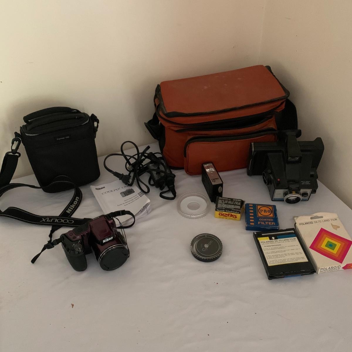 Lot includes a Polaroid Colorpack 3 with expired film, Nikon Coolpix L840, Capri FL3 flash, camera bags and more. Shipping Available