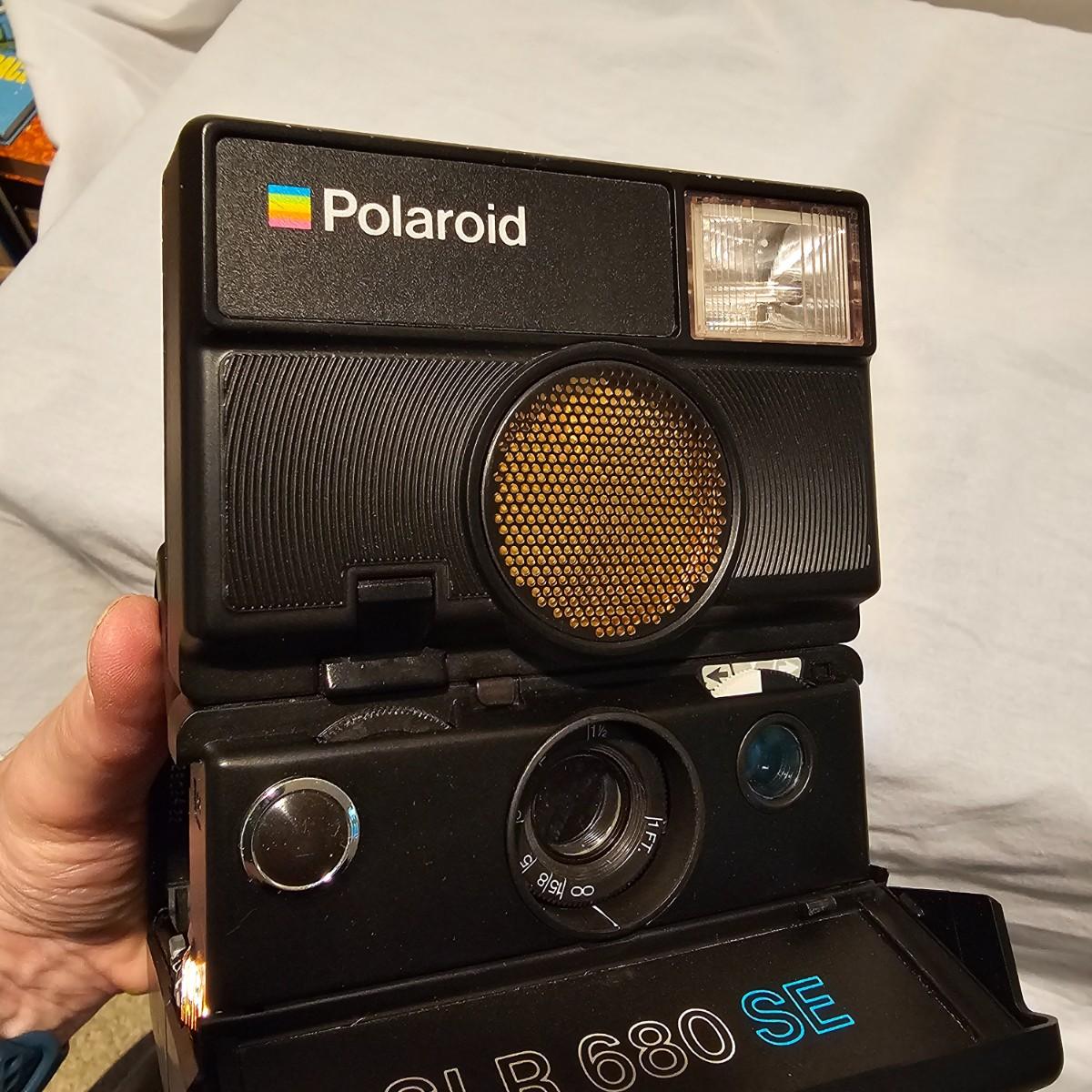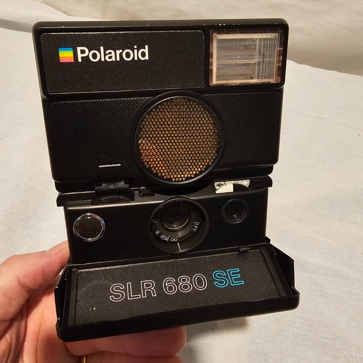 A vintage Polaroid camera first released in 1982. This SLR 680 SE has advanced circuitry and capability over its predecessors. Camera has some cracking in outside case, has not been tested, may still have film in it. See photos for details. Shipping available.