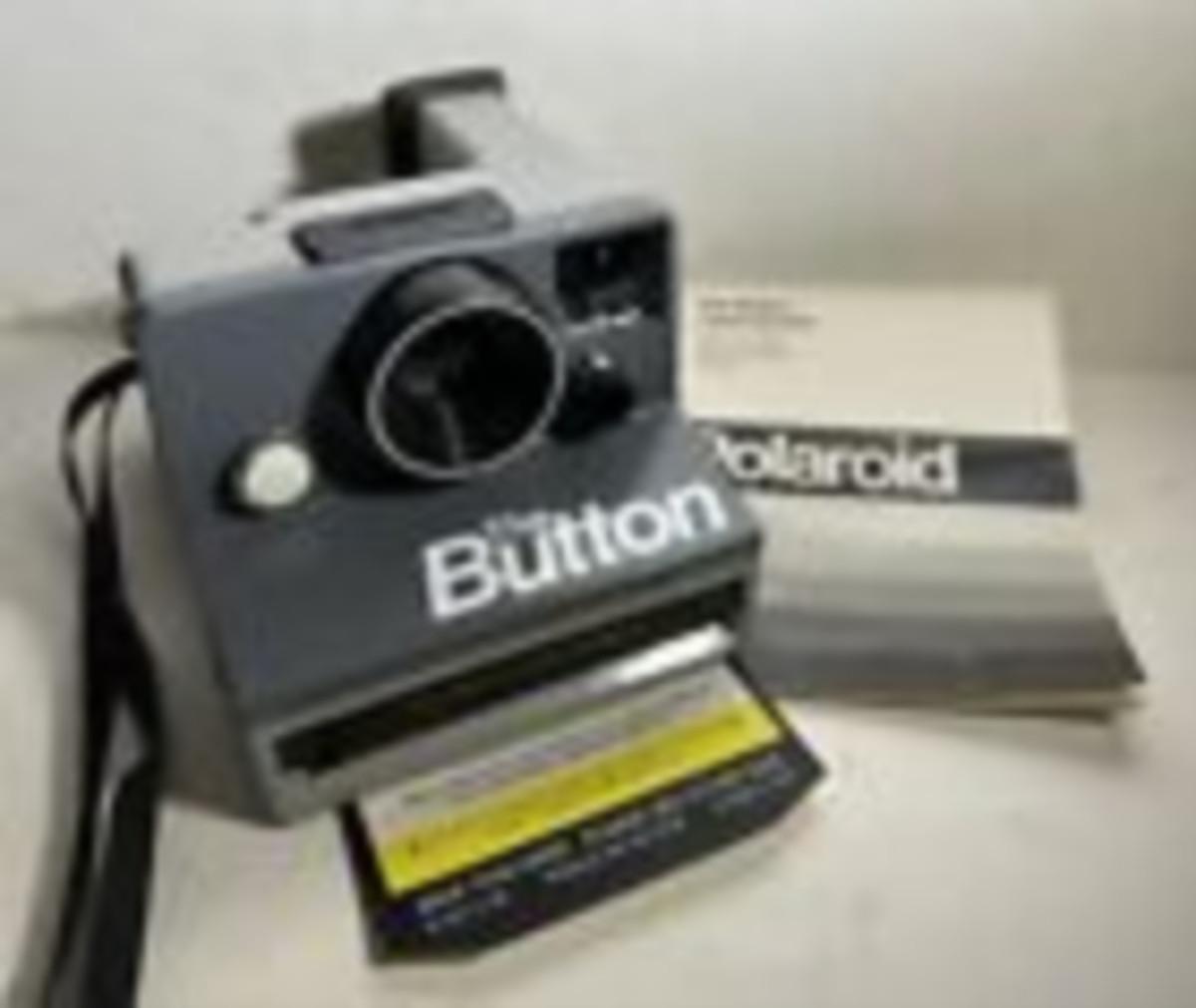Found with its original box and instruction booklet here is a vintage instant film camera circa 1981..."The Button" one of Polaroid’s first plastic SX-70 cameras ever produced..Easy to use..Exposure adjustment knob..built in neckstrap.