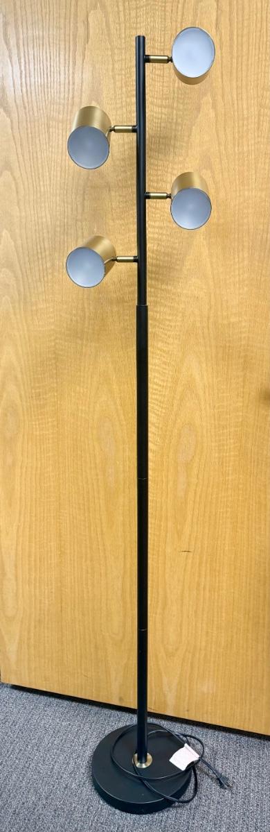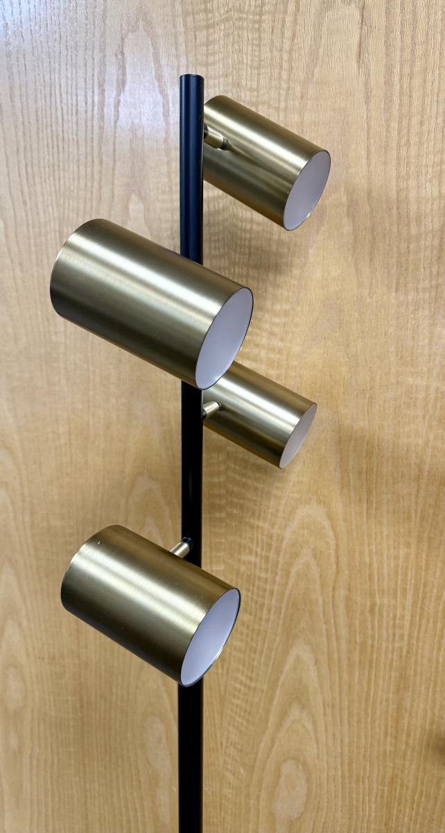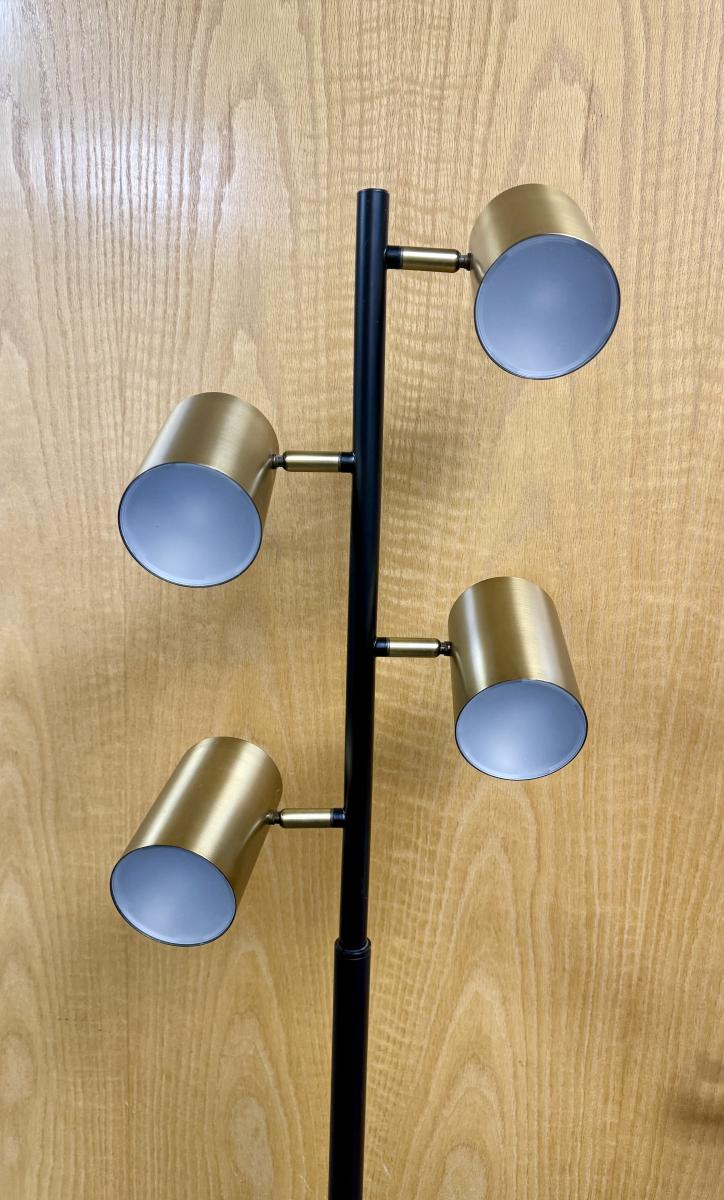 Four individual lights, each can be pointed in a different direction. Each light is turned on and off by touching it. Pole is telescopic, can be raised and lowered as desired.