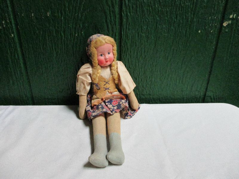 Polish Celluloid Face Doll with Braids-Cloth Body Poland-11"