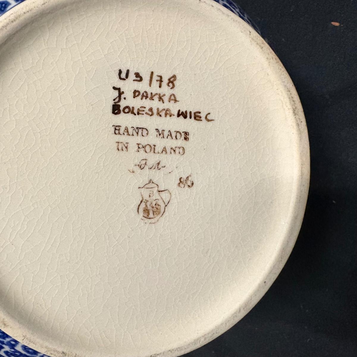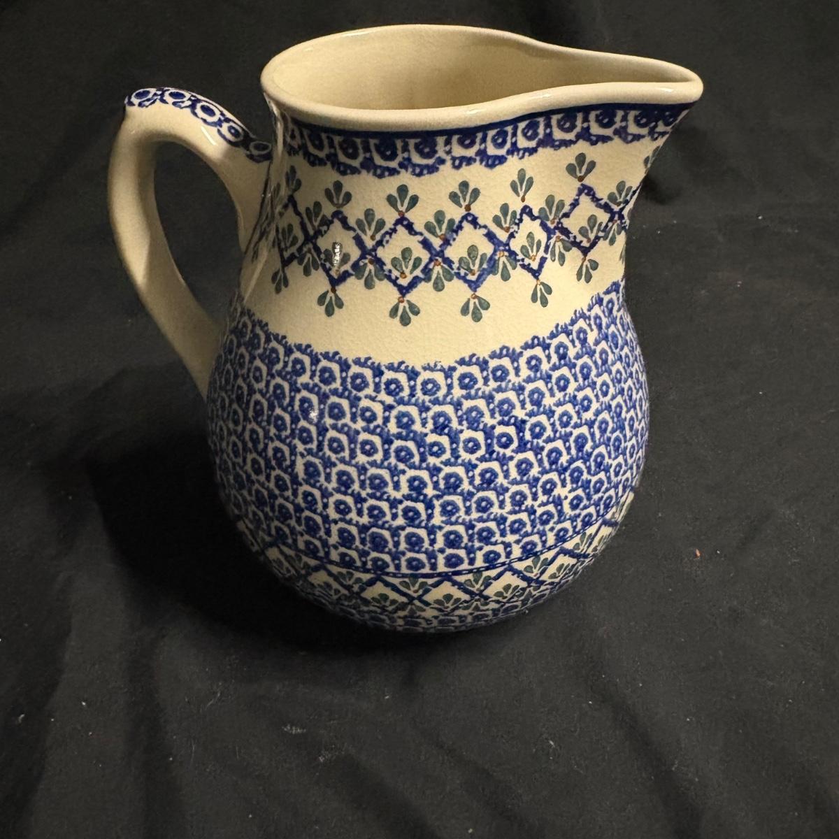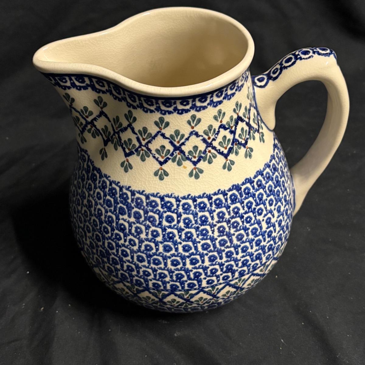 Handmade in Poland, this gorgeous Boleskawiec pitcher measures 8” x 7” at widest points, 8.75”H.