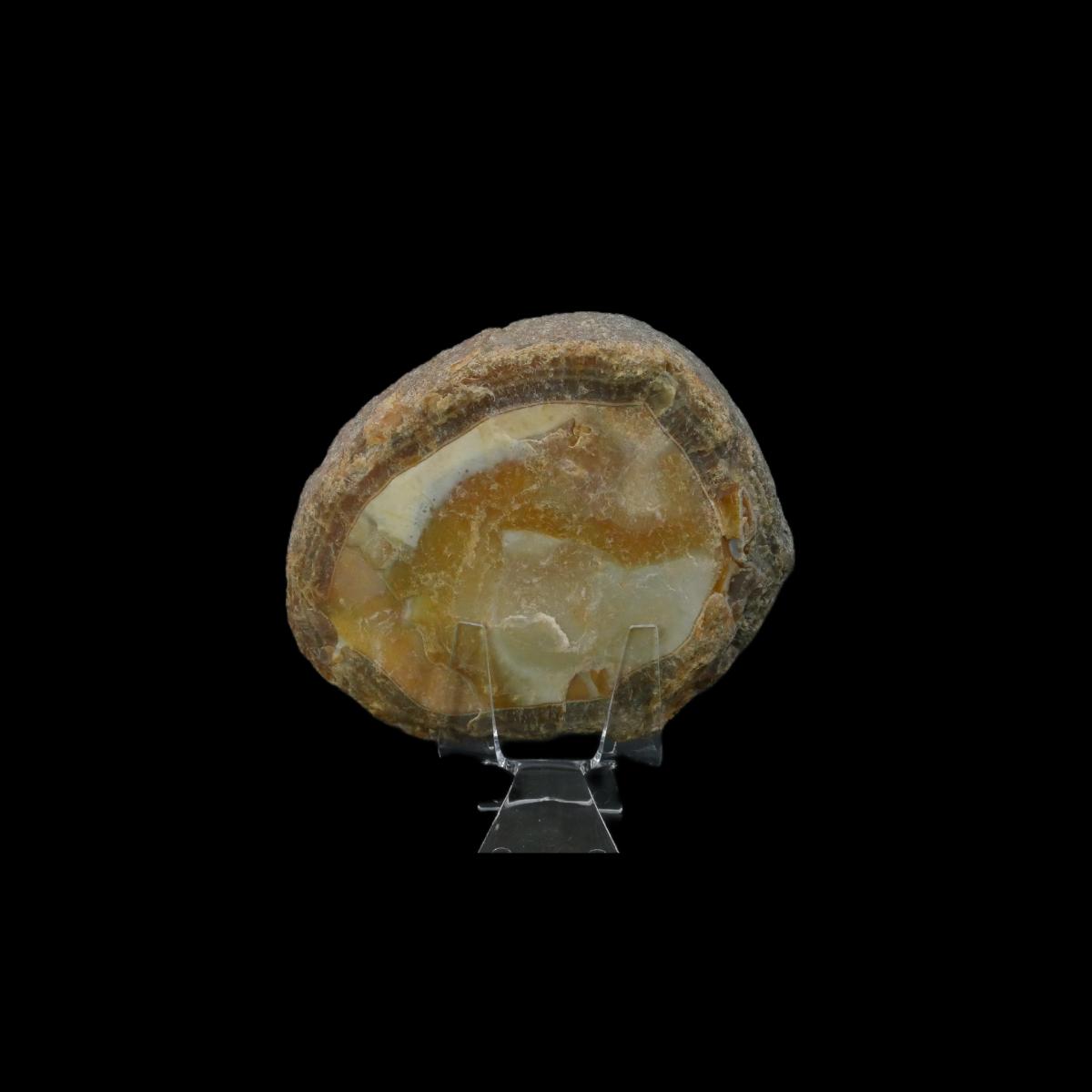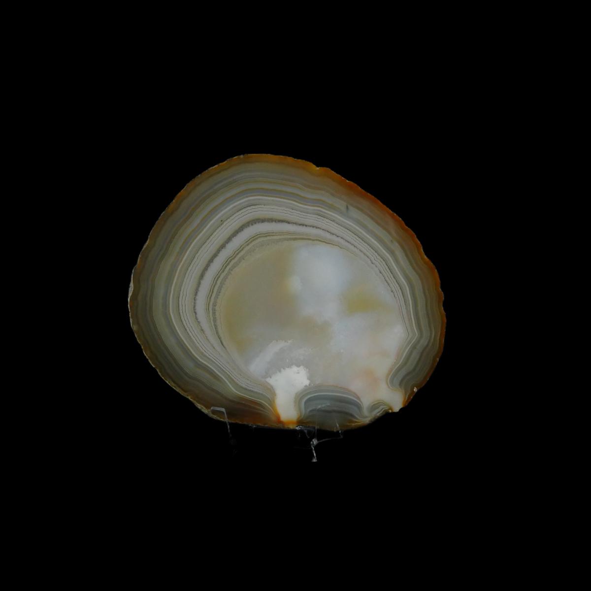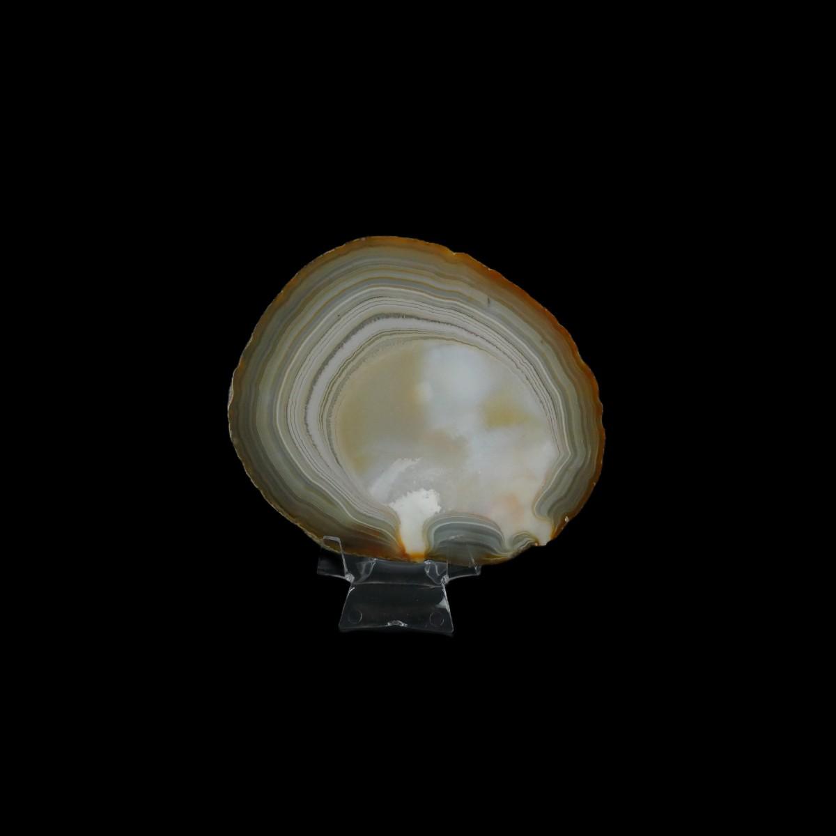 Beautiful agate slab with green, grey, tan, and yellow colorings and striations. Polished on one side, in excellent condition! Stand not included. Measures L 5" x H 4" x W 0.75". Weighs 1 lb 1 oz/486g. (R23)