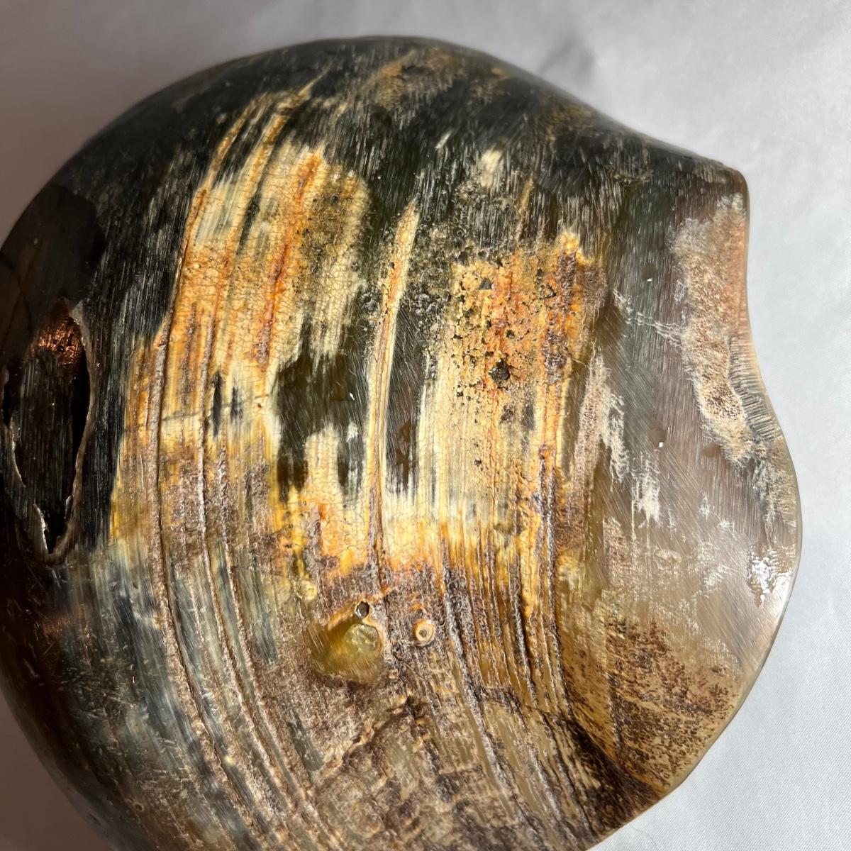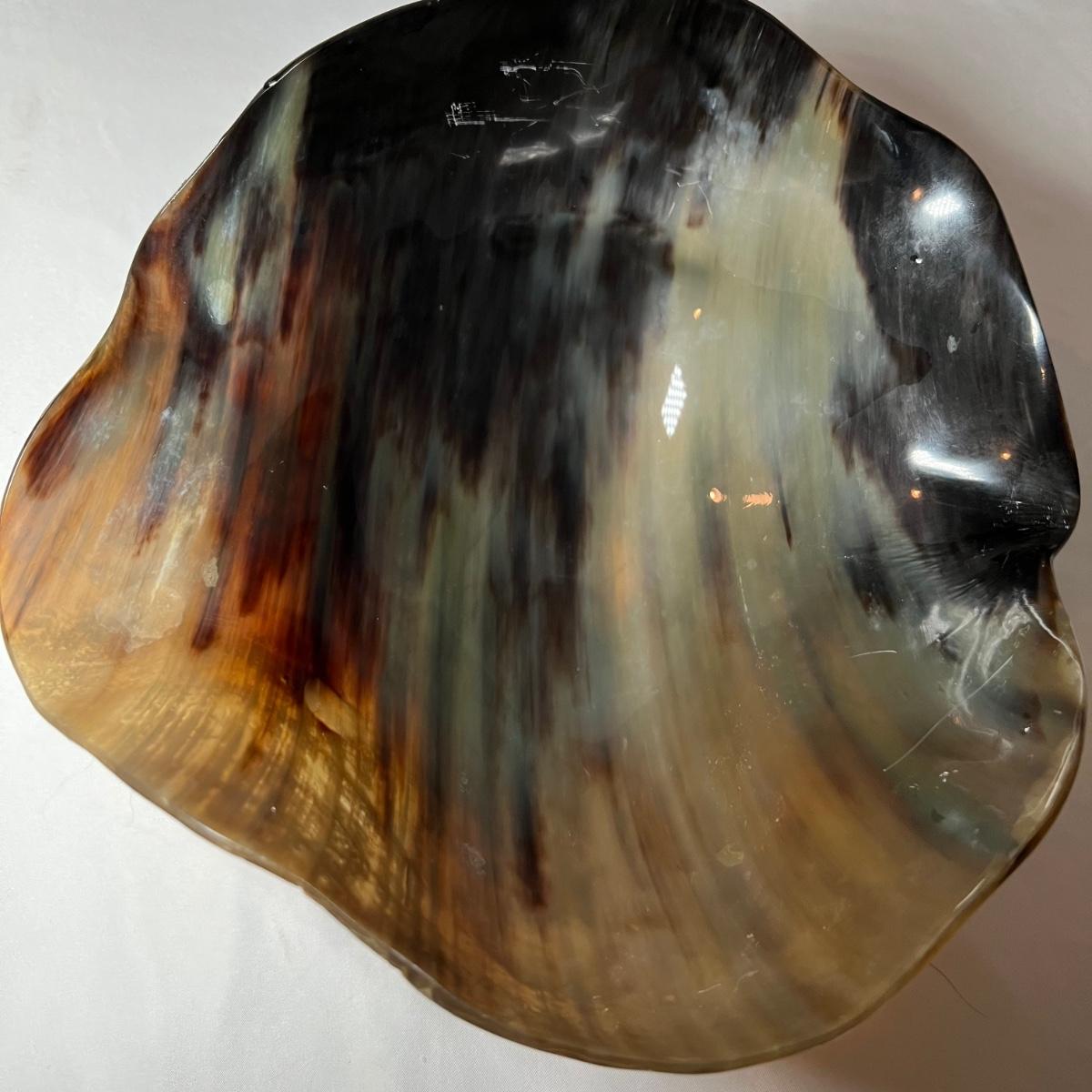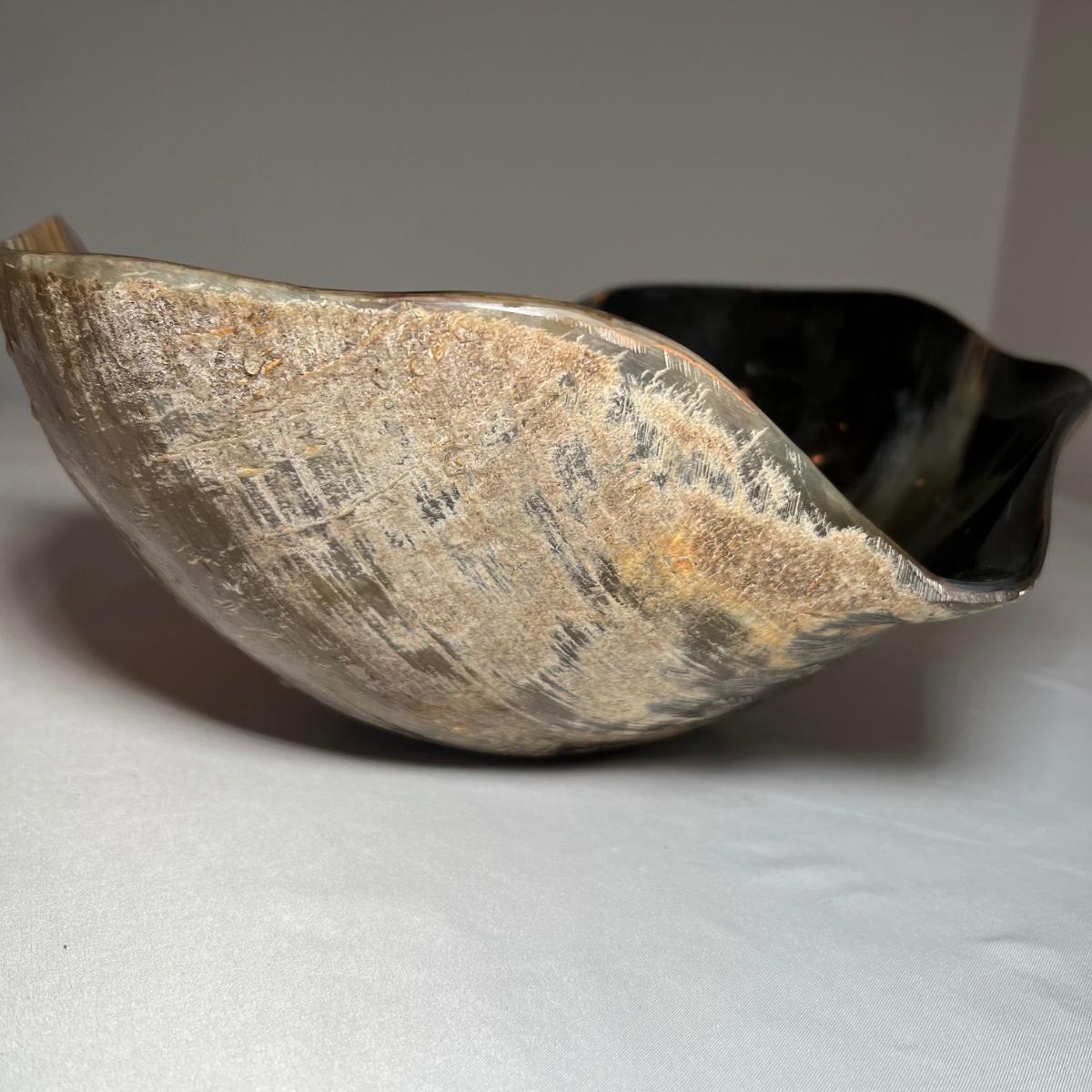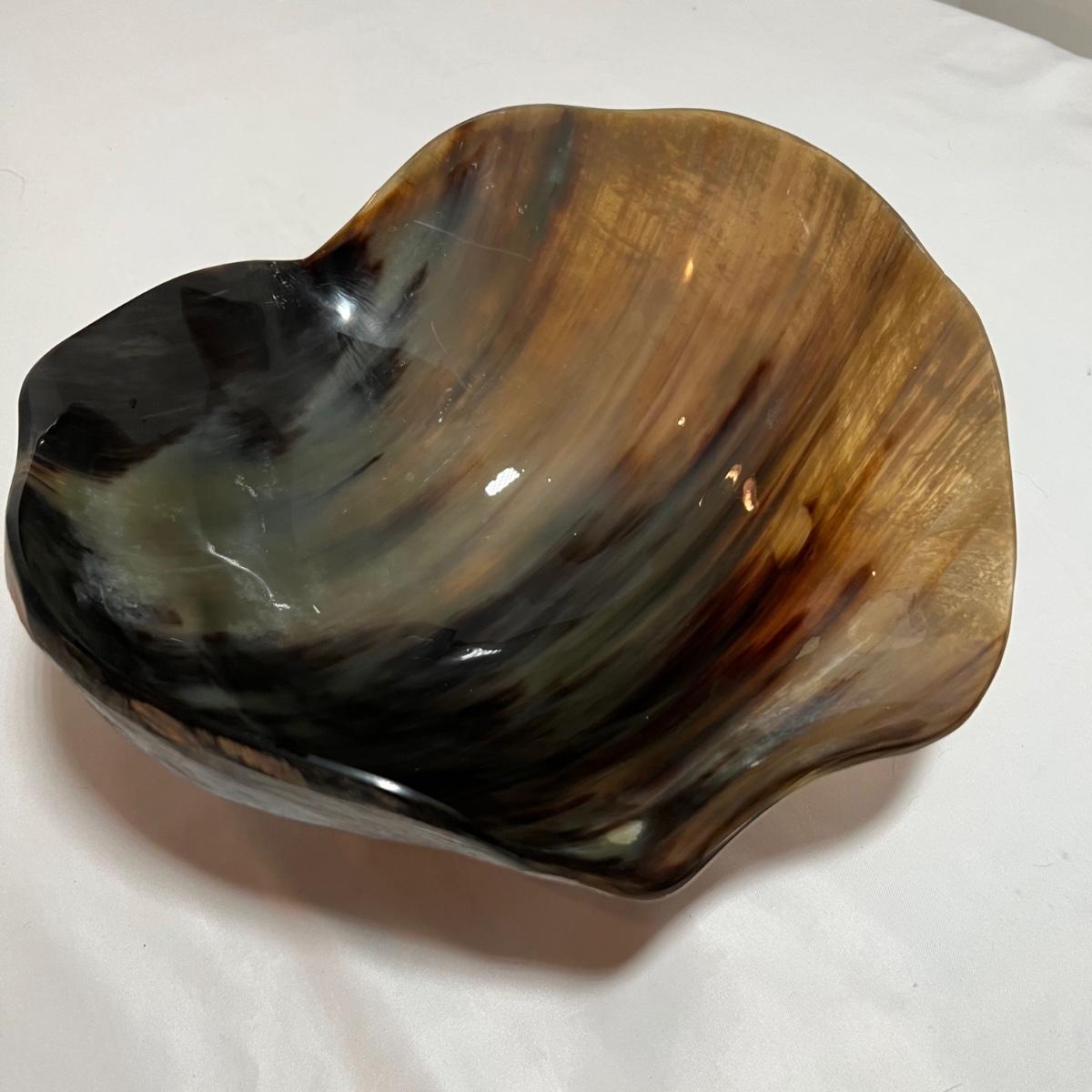 This stunning bowl appears to be polished horn. The light catches this bowl offering up a multitude of colors that are mostly shades of brown from very dark to amber. It has a few light scratches that really are only noticeable when a very bright light is shone on it, see images.