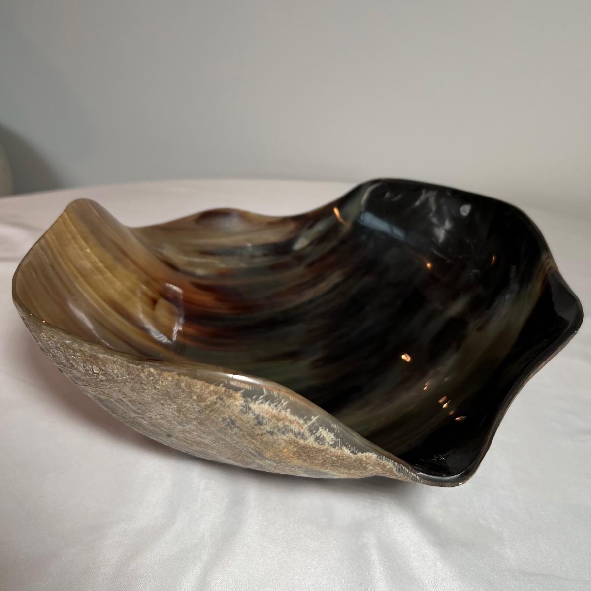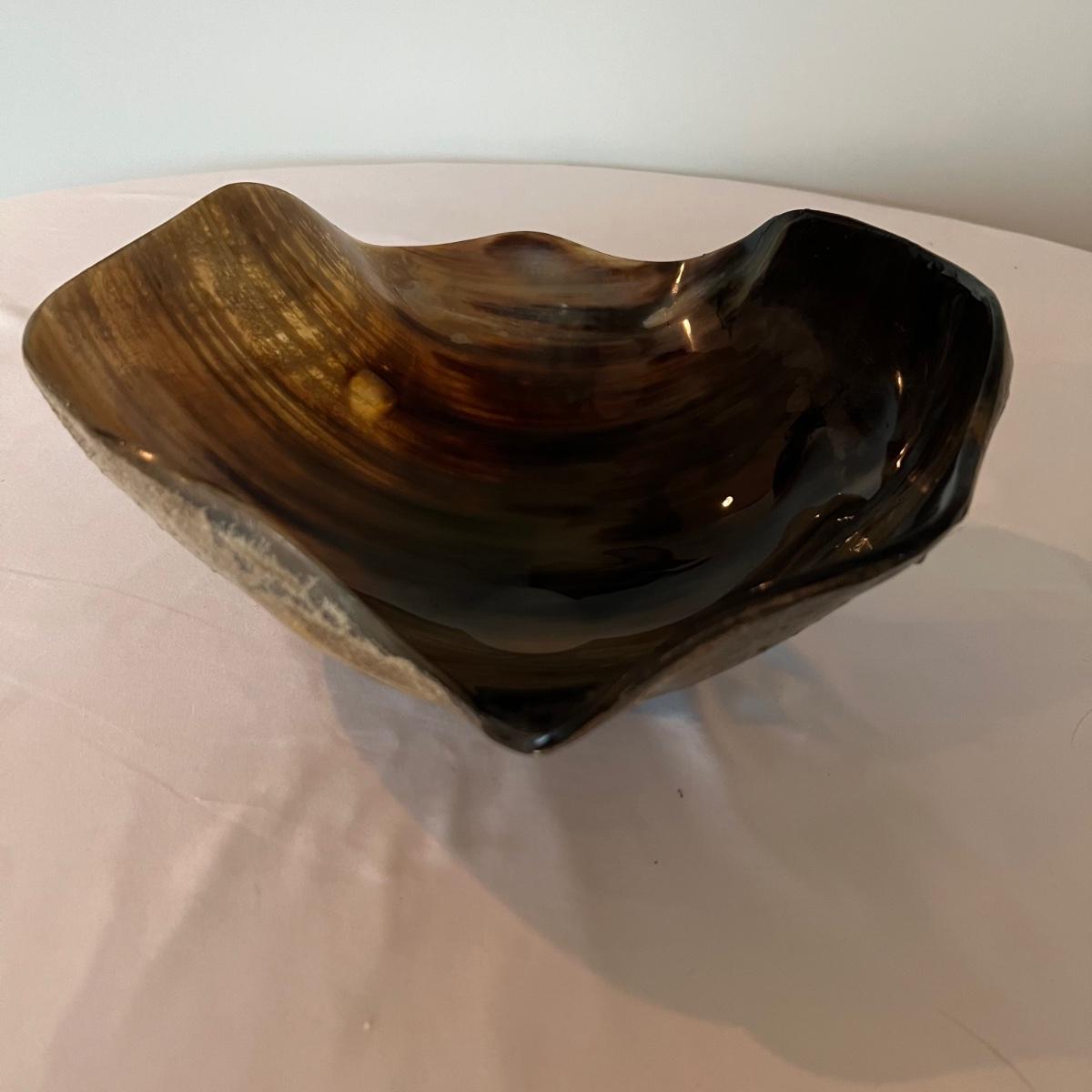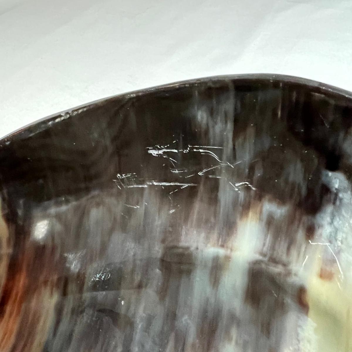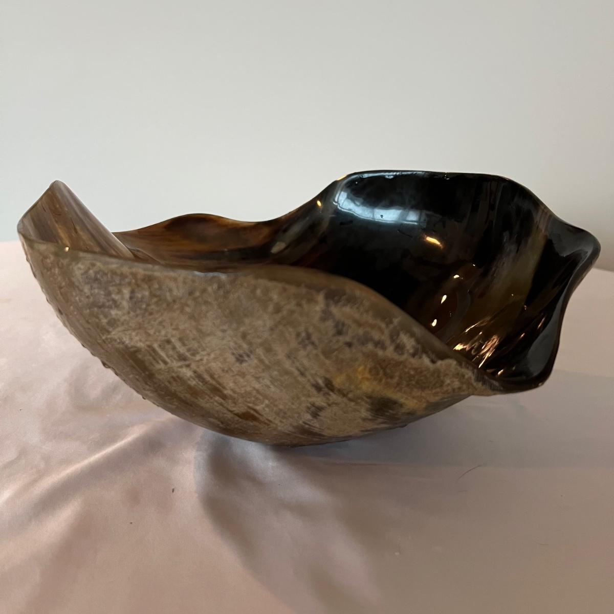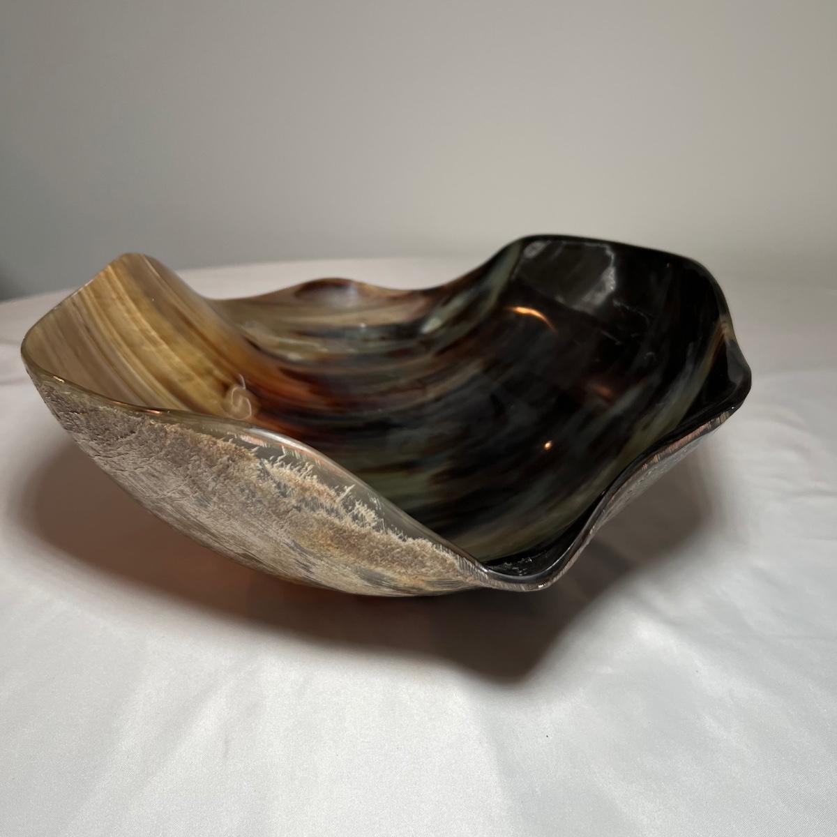 This stunning bowl appears to be polished horn. The light catches this bowl offering up a multitude of colors that are mostly shades of brown from very dark to amber. It has a few light scratches that really are only noticeable when a very bright light is shone on it, see images.