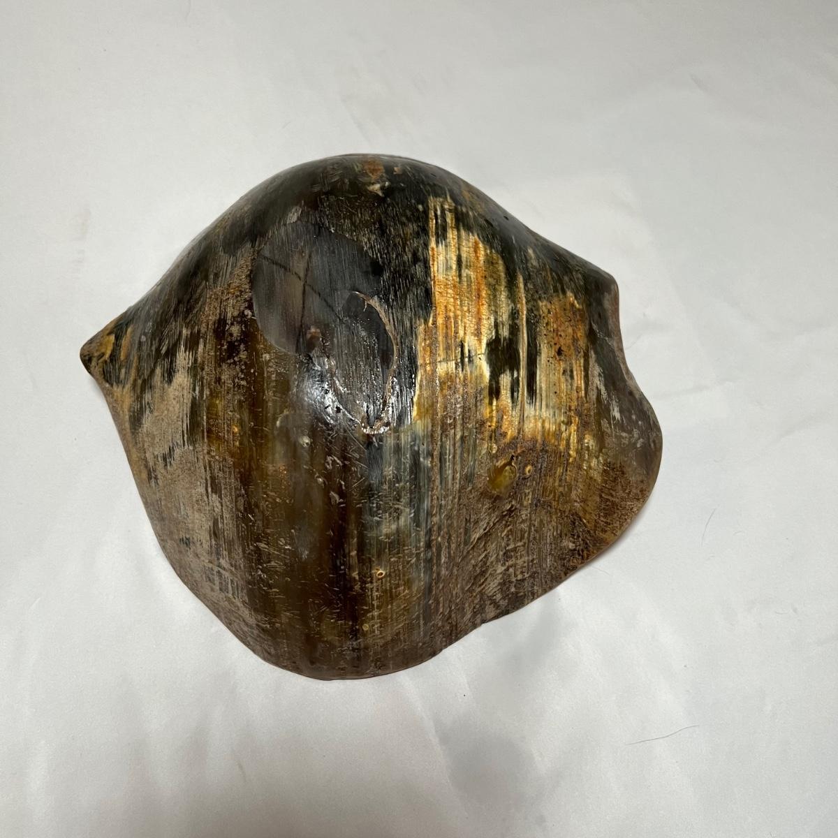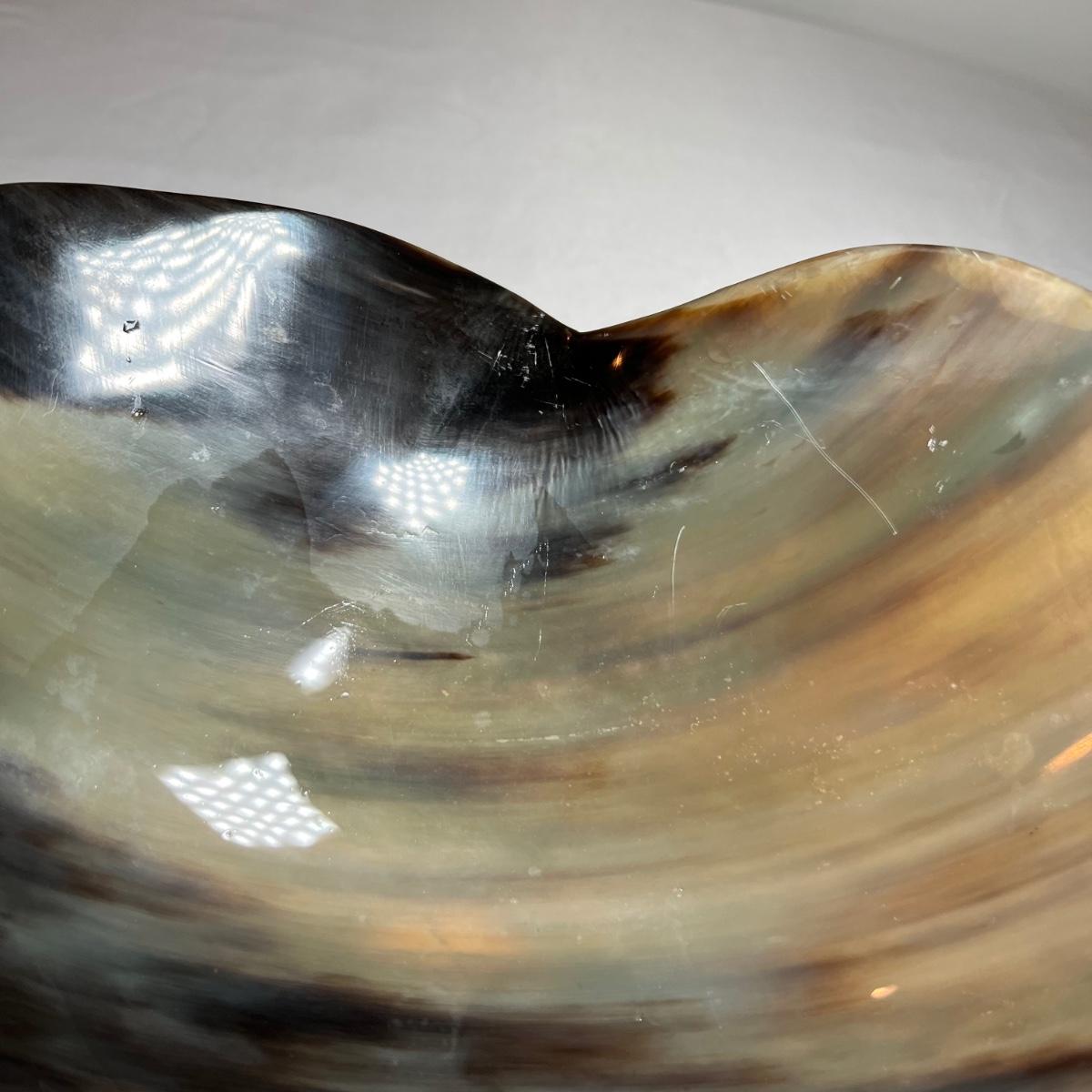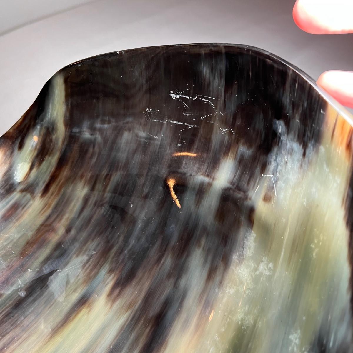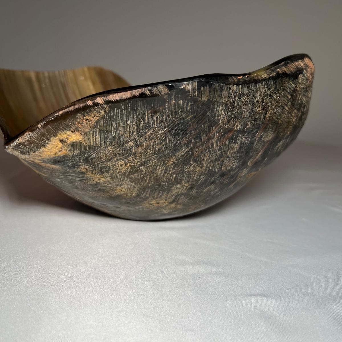 This stunning bowl appears to be polished horn. The light catches this bowl offering up a multitude of colors that are mostly shades of brown from very dark to amber. It has a few light scratches that really are only noticeable when a very bright light is shone on it, see images.