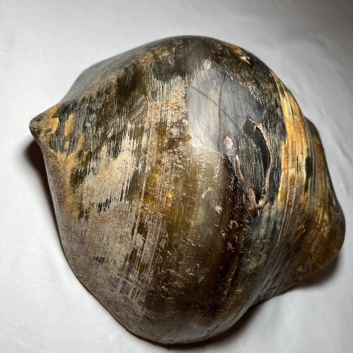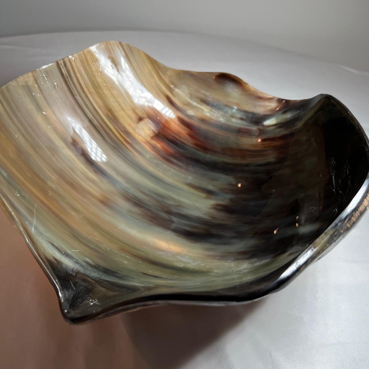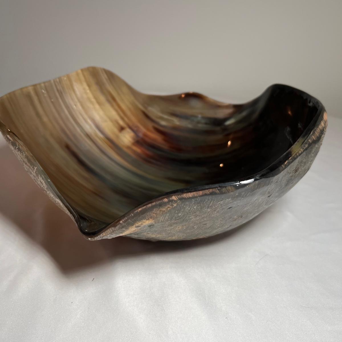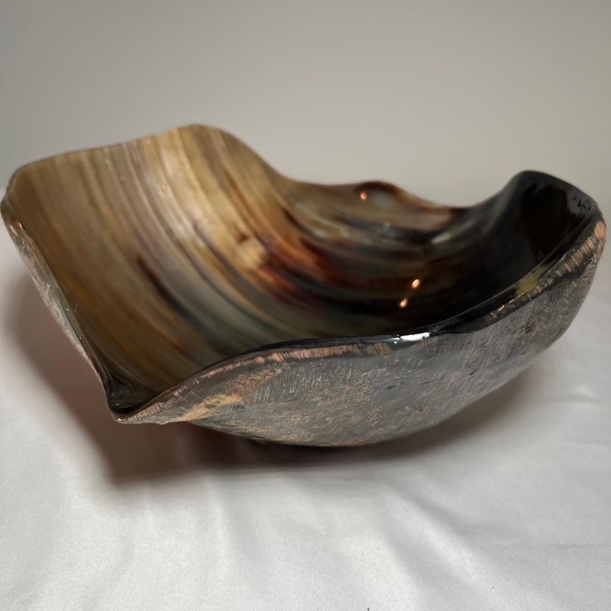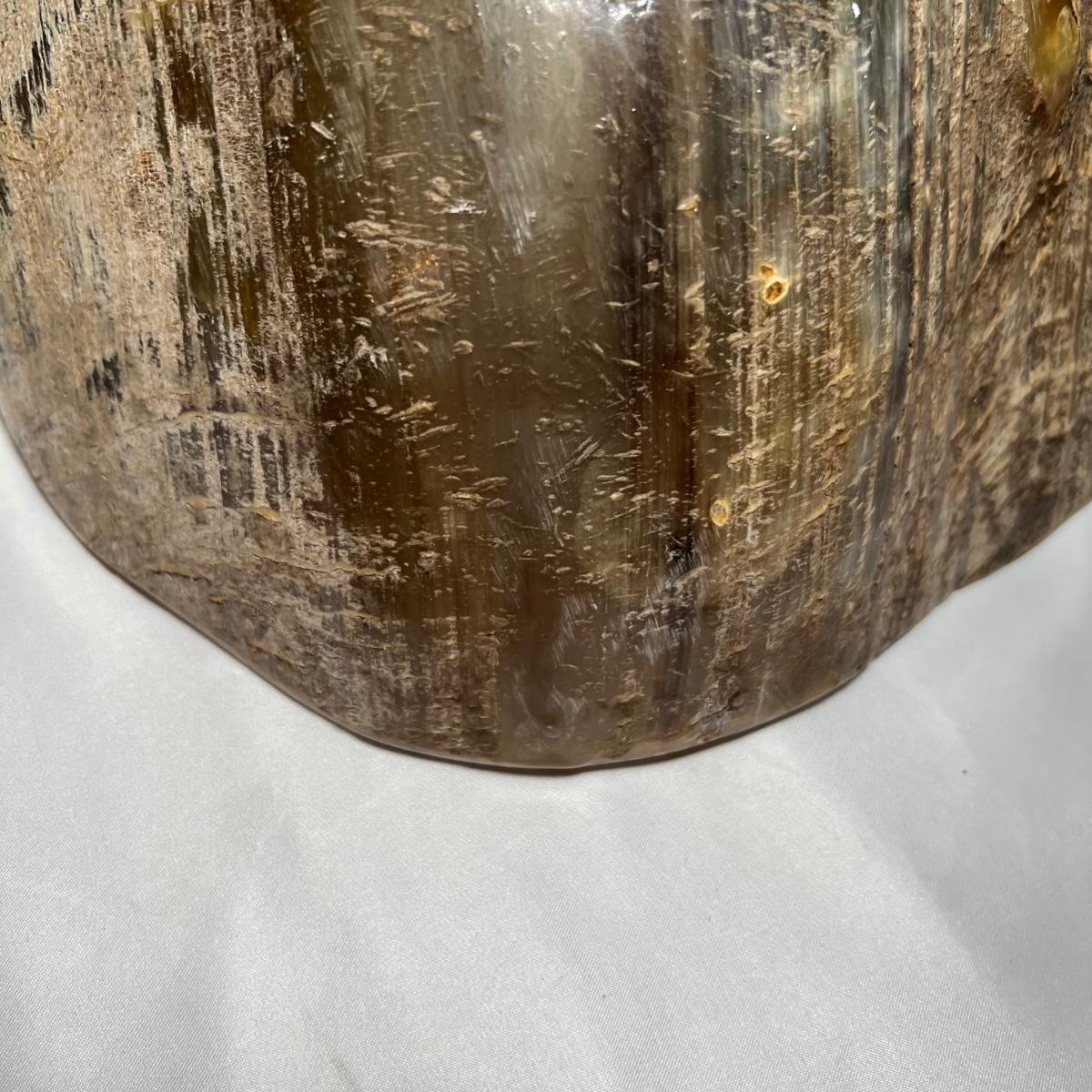 This stunning bowl appears to be polished horn. The light catches this bowl offering up a multitude of colors that are mostly shades of brown from very dark to amber. It has a few light scratches that really are only noticeable when a very bright light is shone on it, see images.