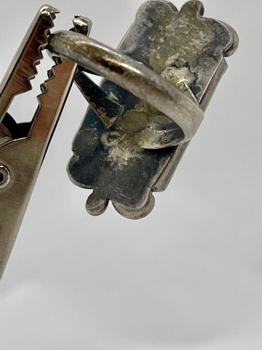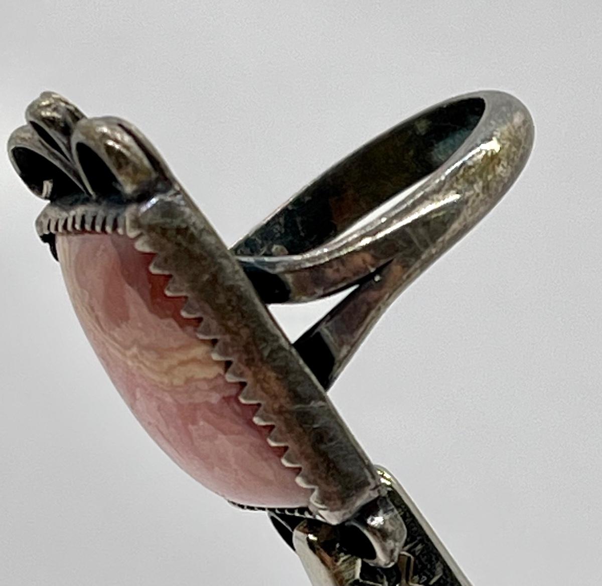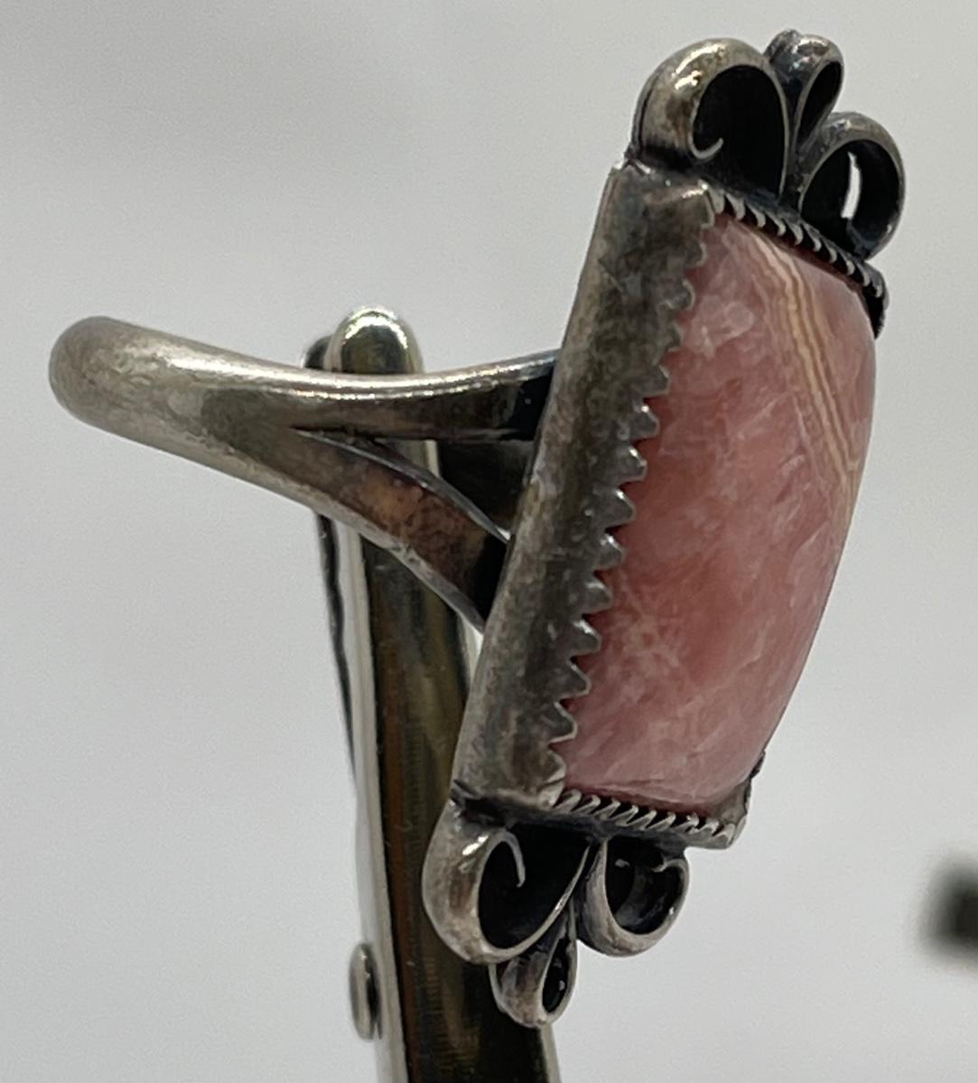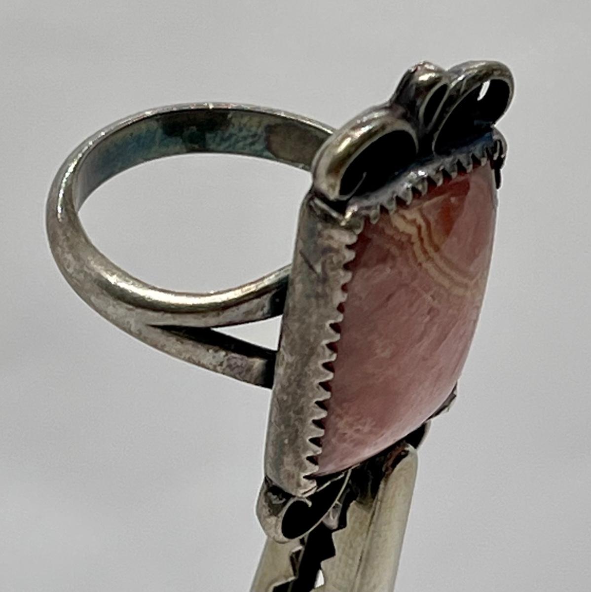 Polished Rectangle Rhodochrosite Stone Ring in Silver Tone Setting. In good condition. No hallmarks or sterling marks found.