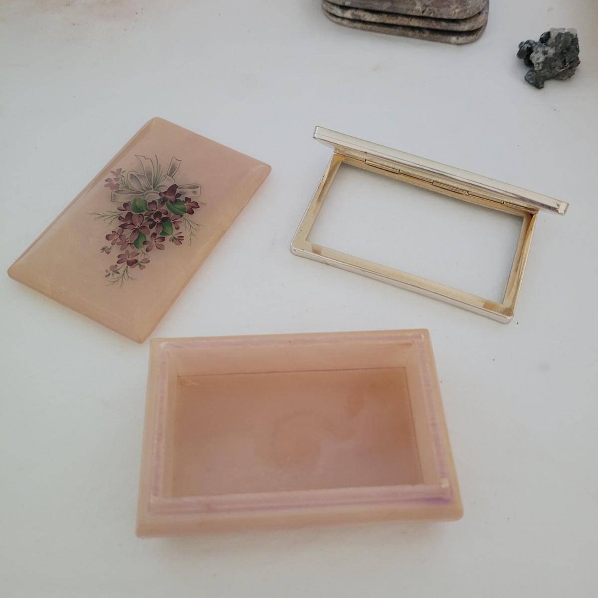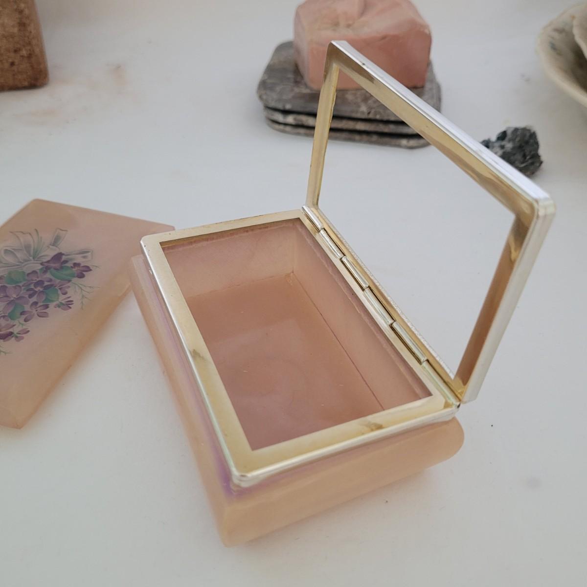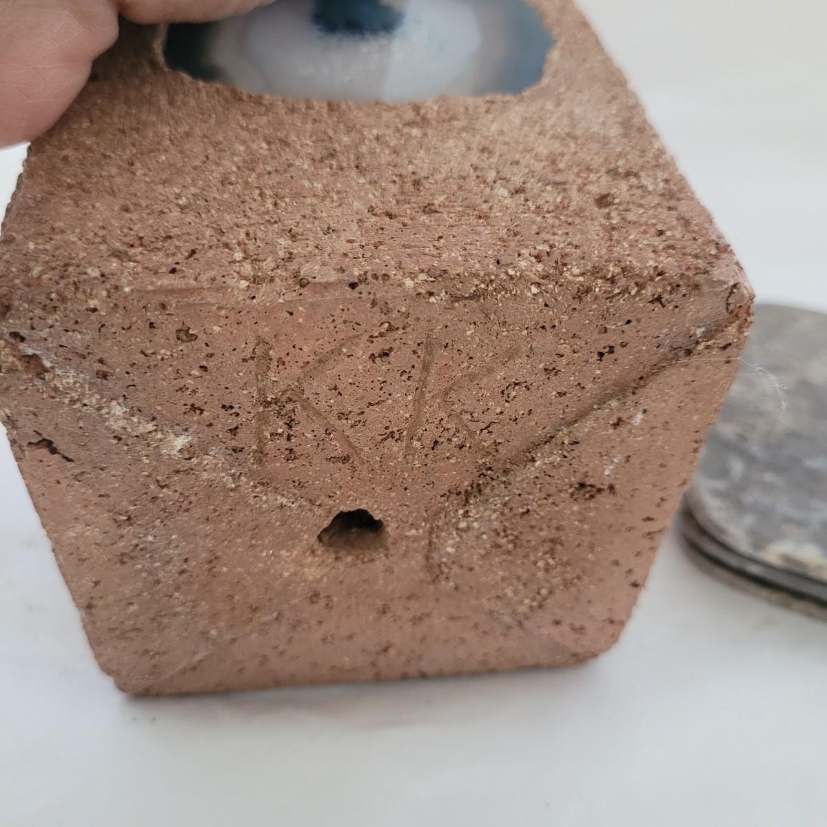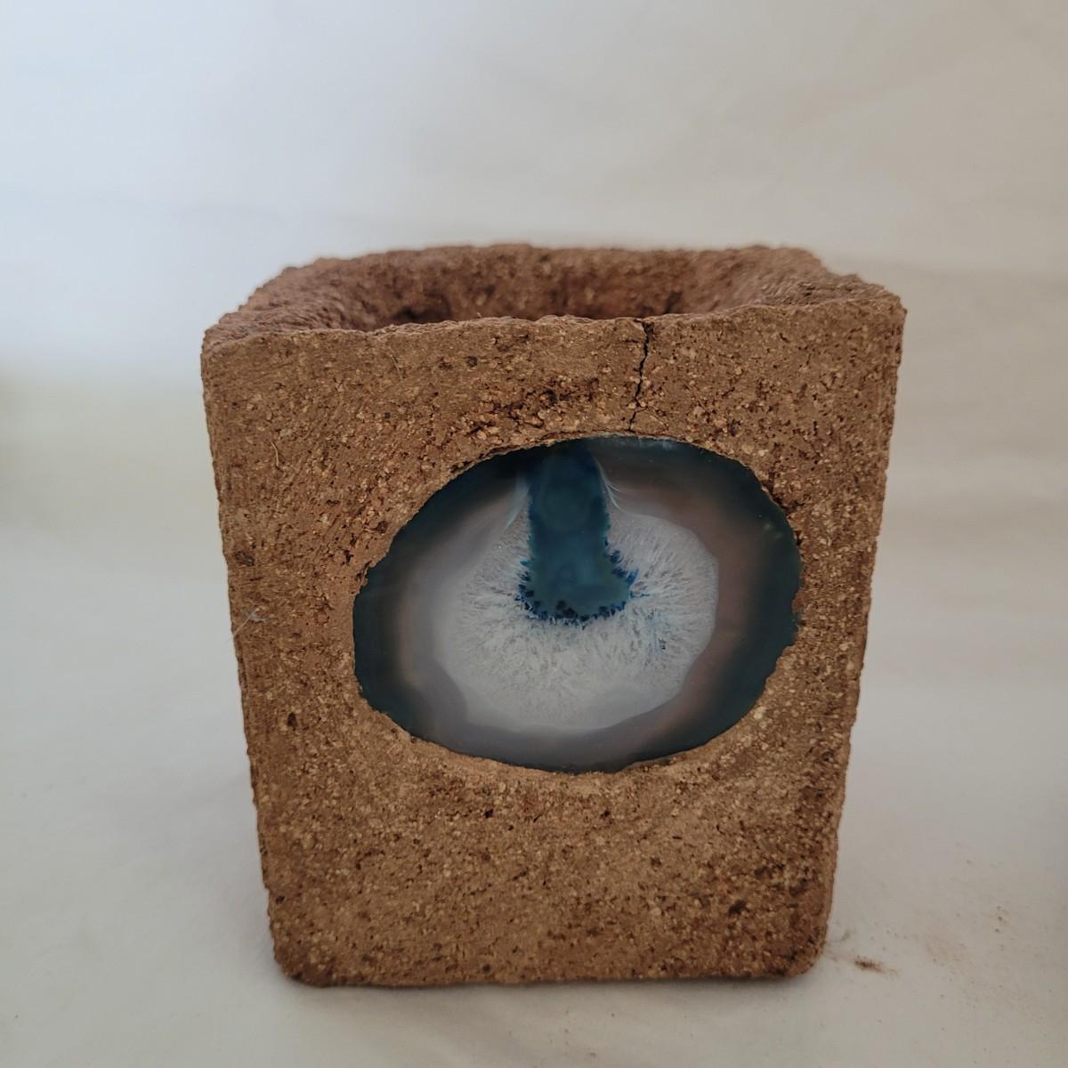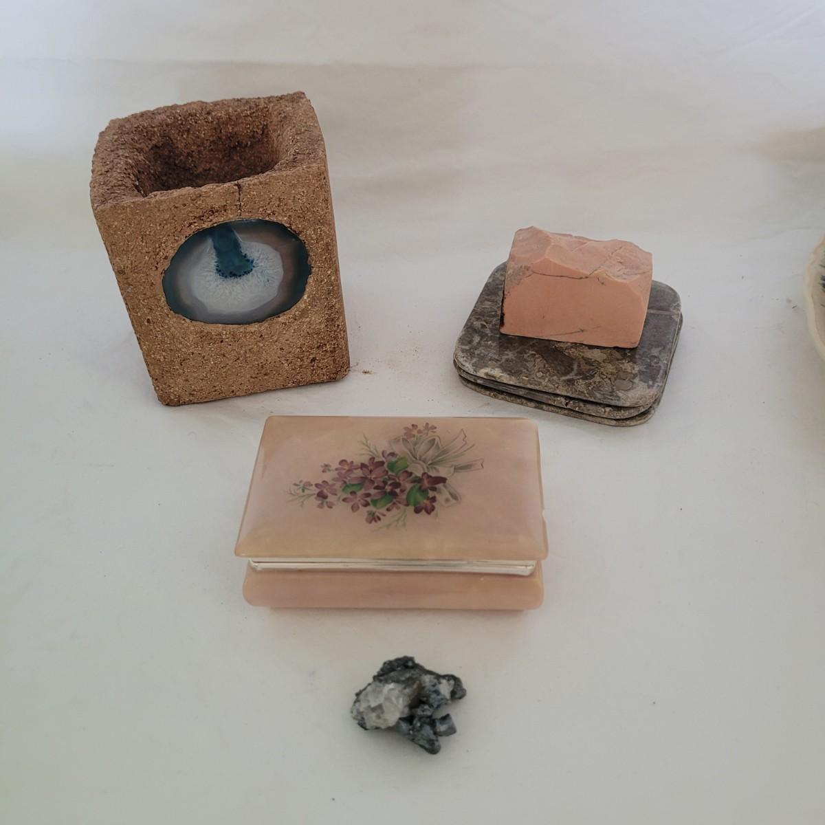 This fun collection of stones includes polished coasters, a rose quartz-like jewelry box, clay candle holder, geode and more. Candle holder measures approximately 4” x 4” x 4.5”H. Shipping available.