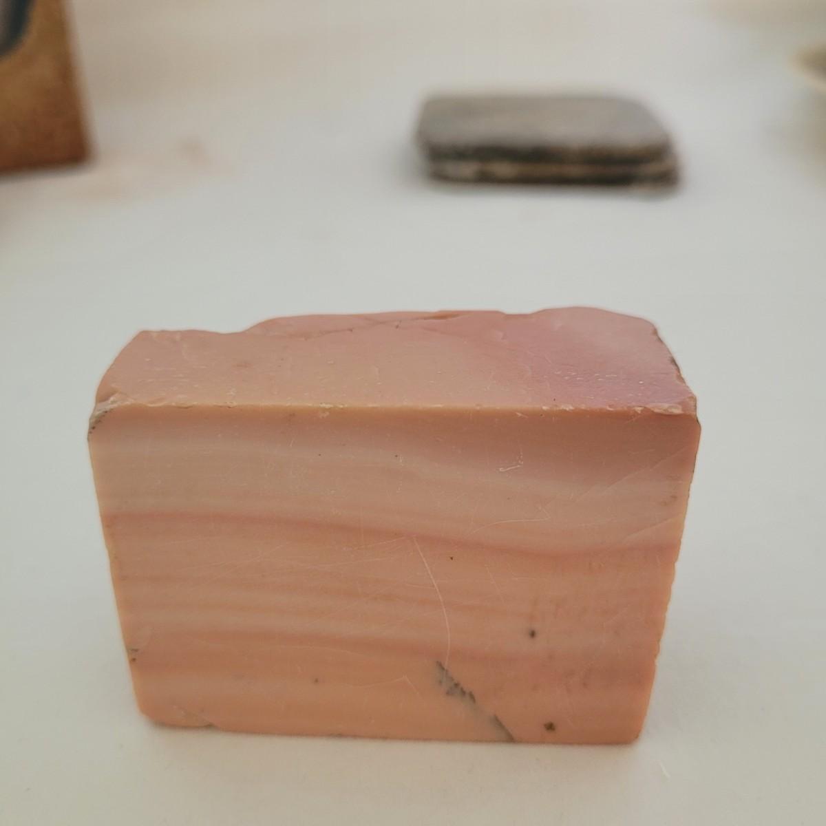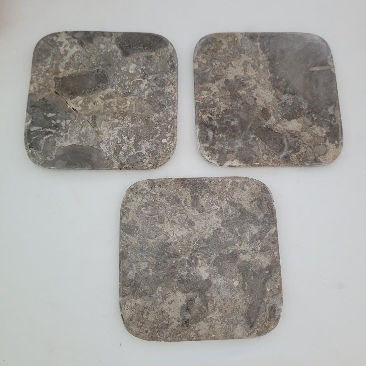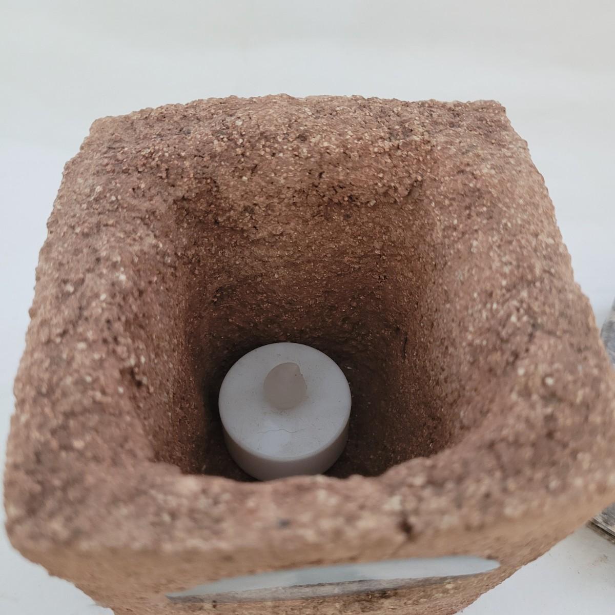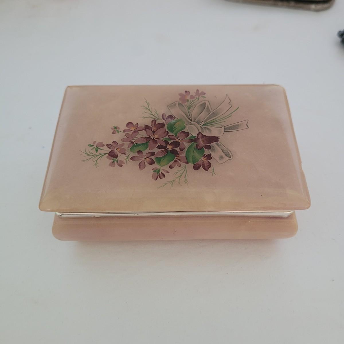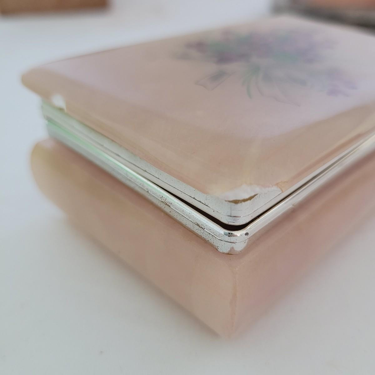 This fun collection of stones includes polished coasters, a rose quartz-like jewelry box, clay candle holder, geode and more. Candle holder measures approximately 4” x 4” x 4.5”H. Shipping available.