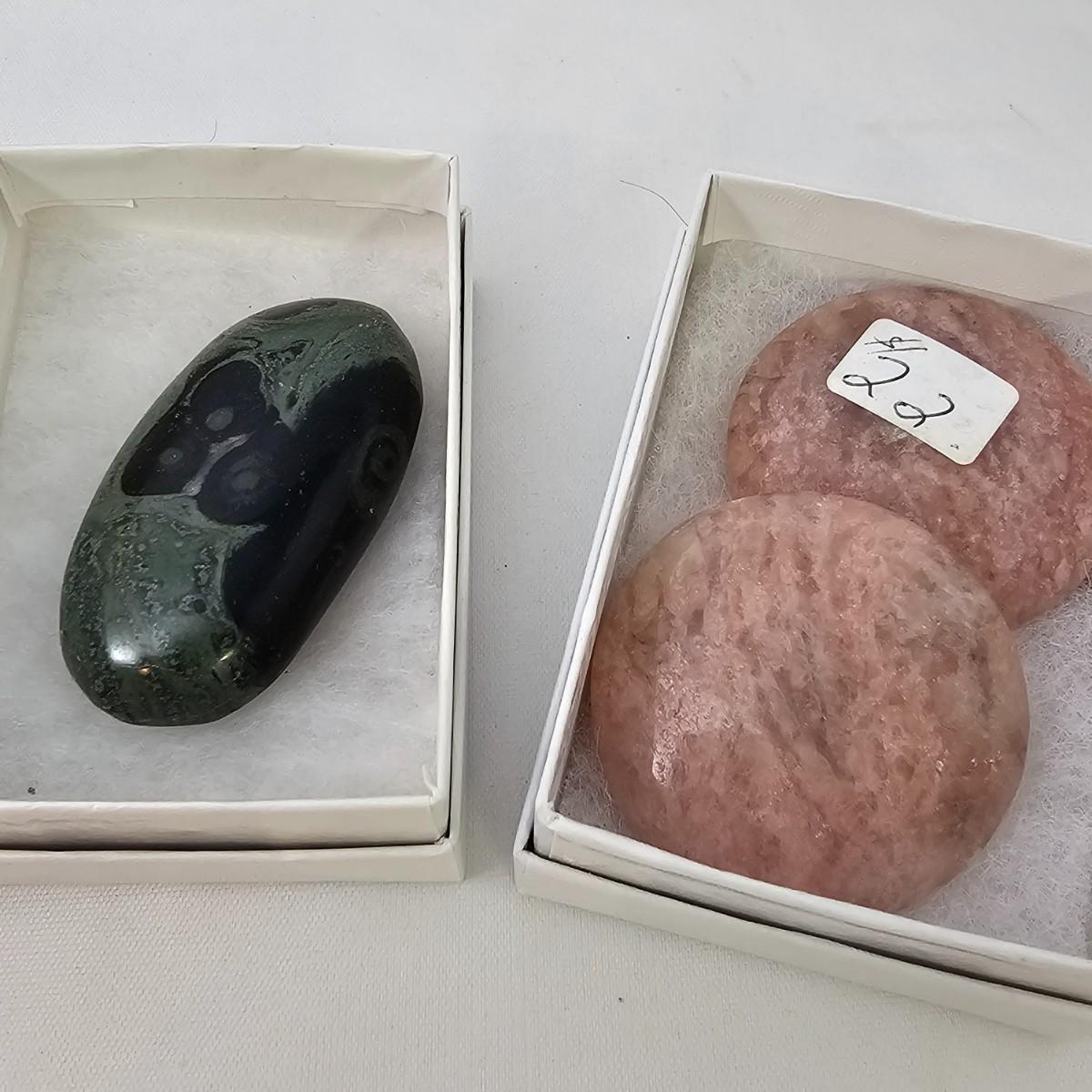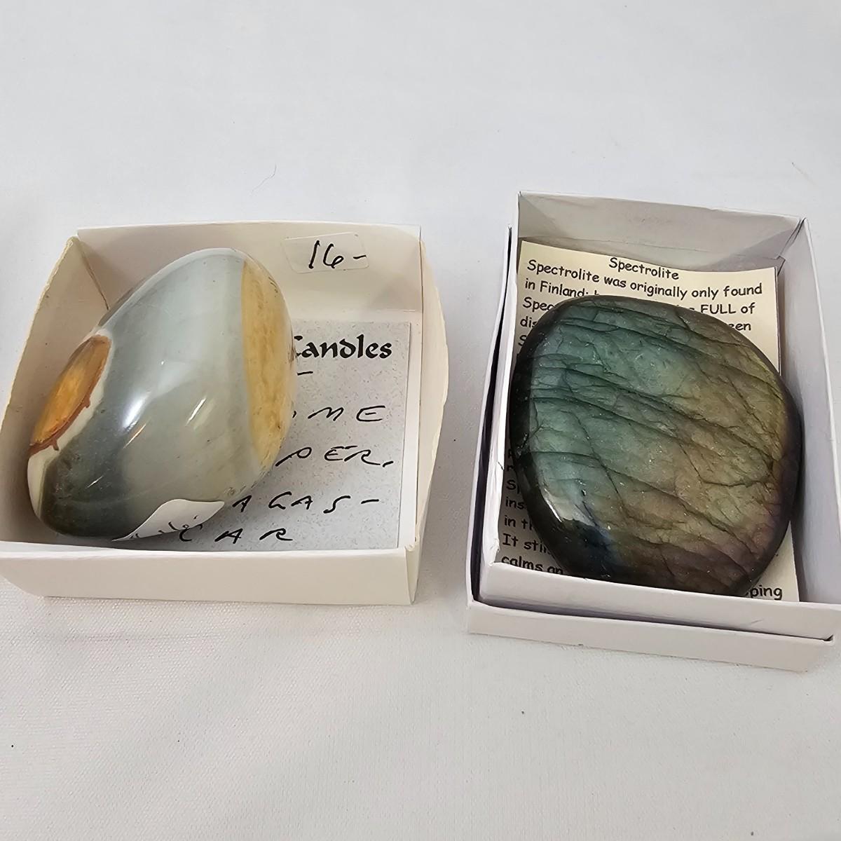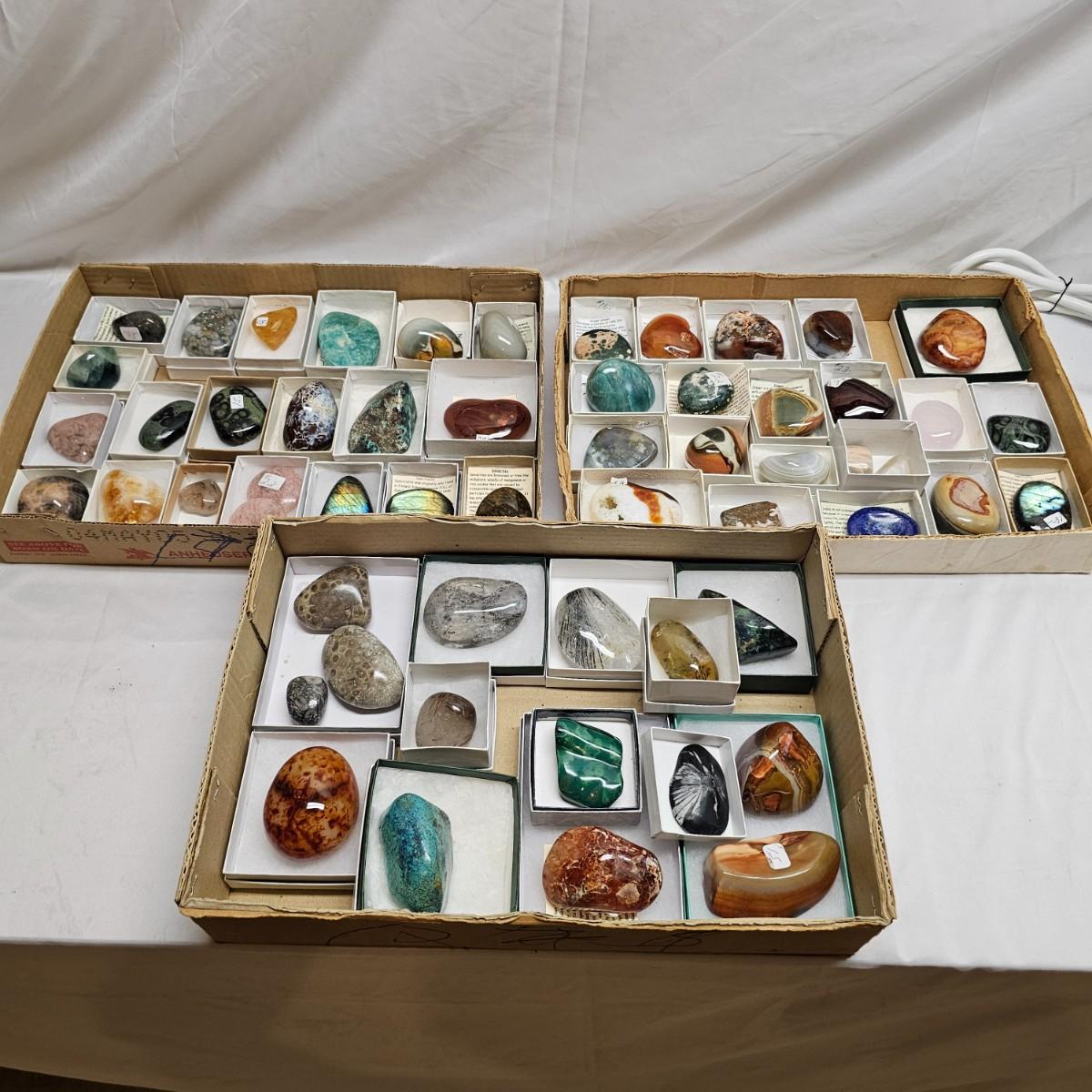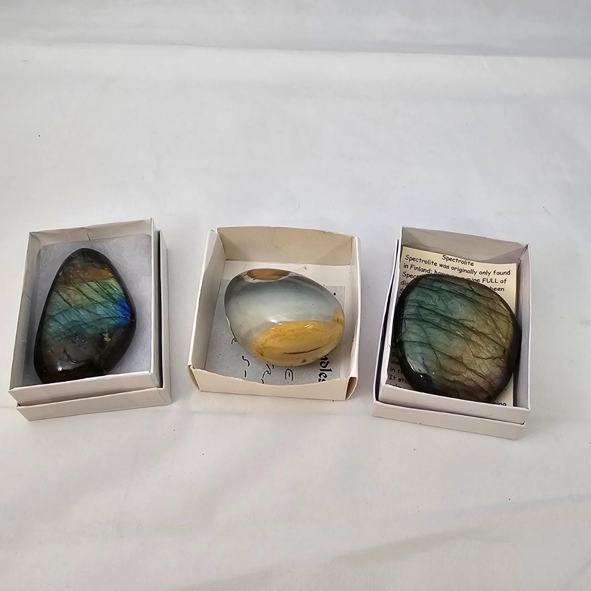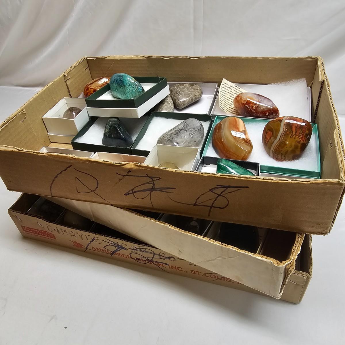More than 50 highly polished stones in various sizes and shapes. Hearts, rounds and many free form shapes as fits the stone. Stones appear to be carnelian, moonstone, lapis lazuli, rutilated quartz, spectrolite and more. All items in individual boxes, some doubled up. See photos for details. Shipping available. Please note that any price tag seen on an item was not put there by Sterling Transitions and does not reflect the current value of the item. All sales are final. No returns or refunds. Please bid accordingly.