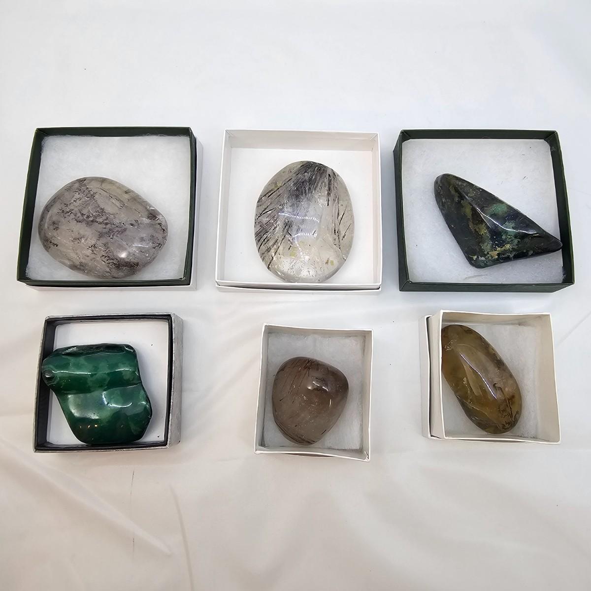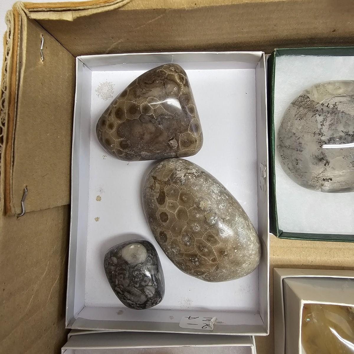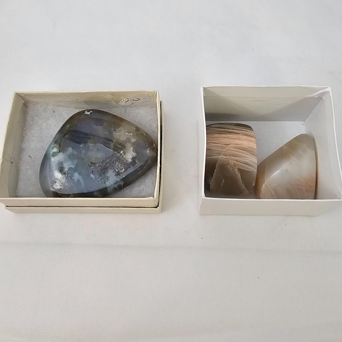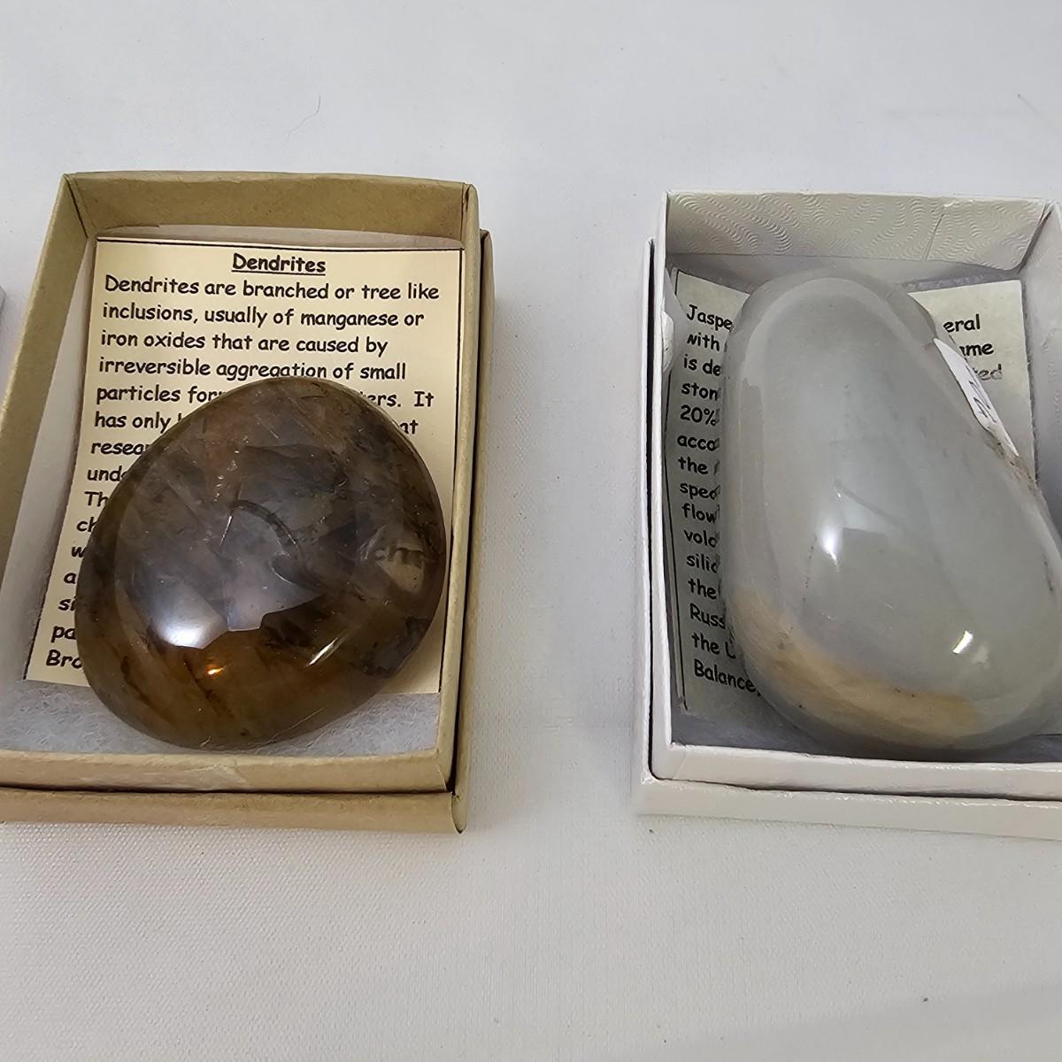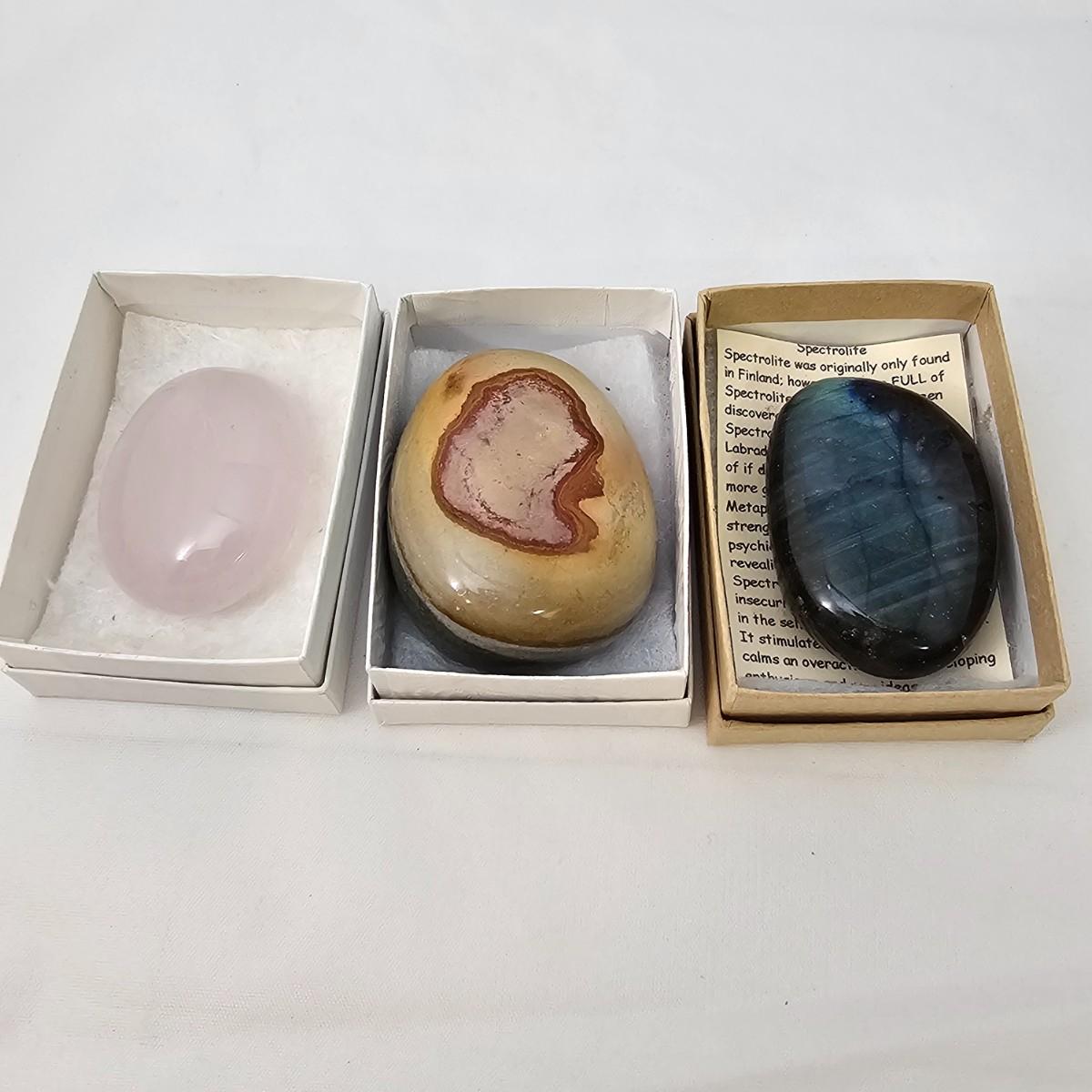 More than 50 highly polished stones in various sizes and shapes. Hearts, rounds and many free form shapes as fits the stone. Stones appear to be carnelian, moonstone, lapis lazuli, rutilated quartz, spectrolite and more. All items in individual boxes, some doubled up. See photos for details. Shipping available. Please note that any price tag seen on an item was not put there by Sterling Transitions and does not reflect the current value of the item. All sales are final. No returns or refunds. Please bid accordingly.