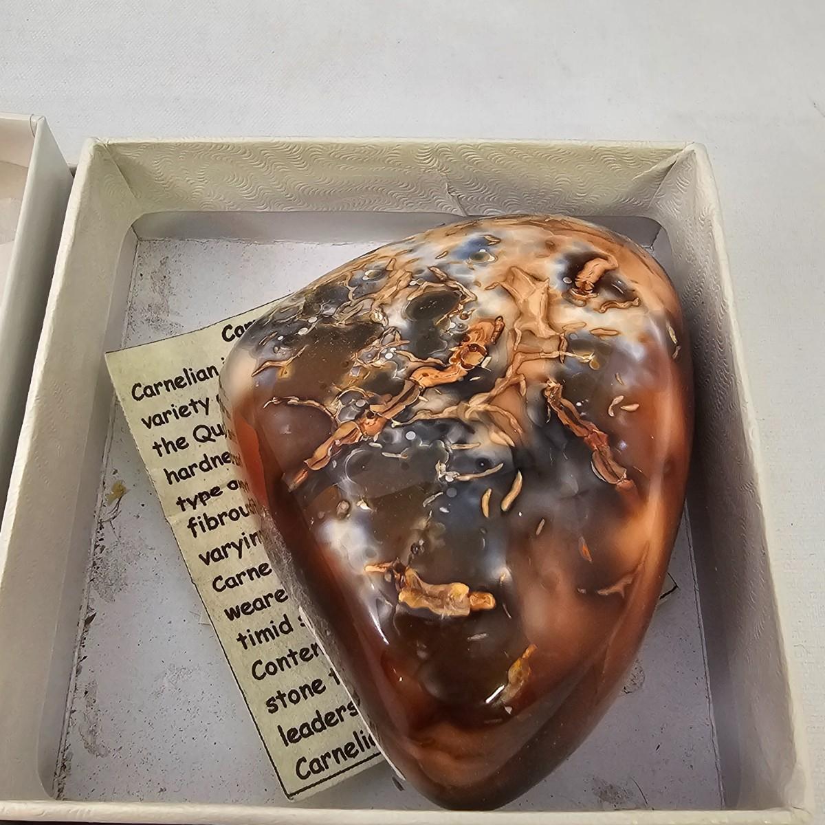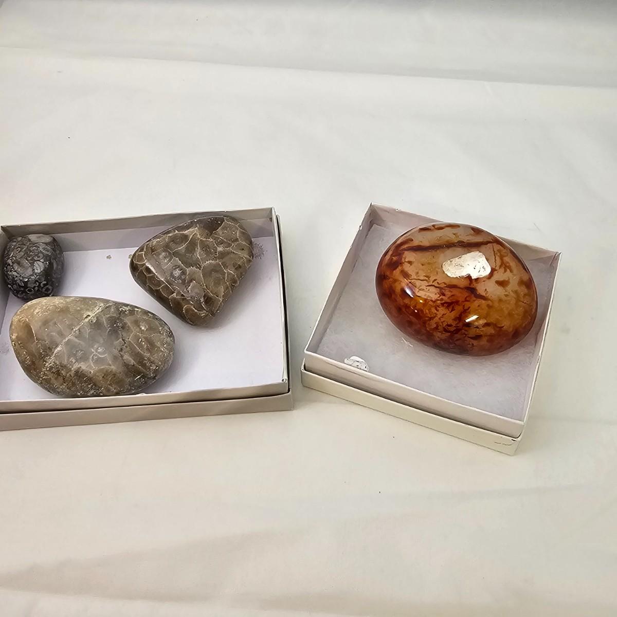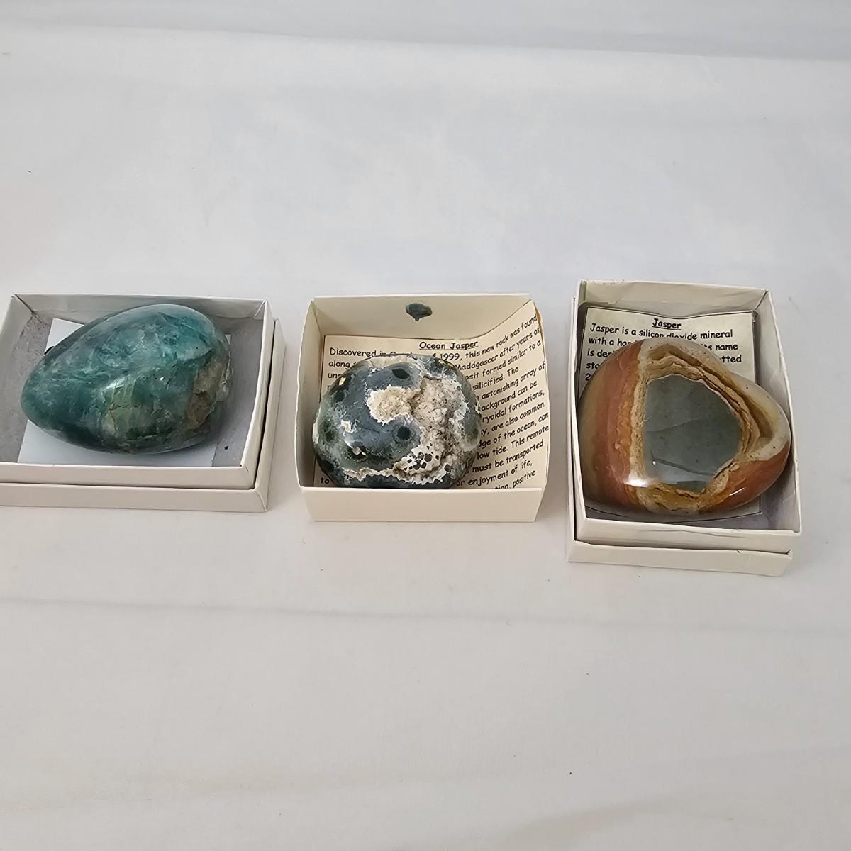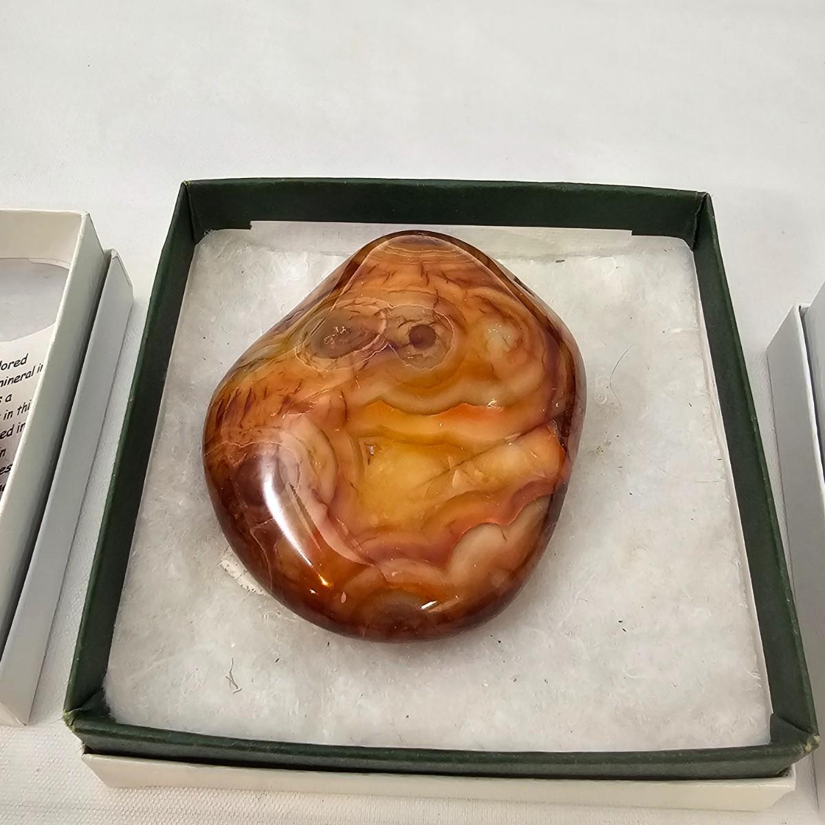 More than 50 highly polished stones in various sizes and shapes. Hearts, rounds and many free form shapes as fits the stone. Stones appear to be carnelian, moonstone, lapis lazuli, rutilated quartz, spectrolite and more. All items in individual boxes, some doubled up. See photos for details. Shipping available. Please note that any price tag seen on an item was not put there by Sterling Transitions and does not reflect the current value of the item. All sales are final. No returns or refunds. Please bid accordingly.