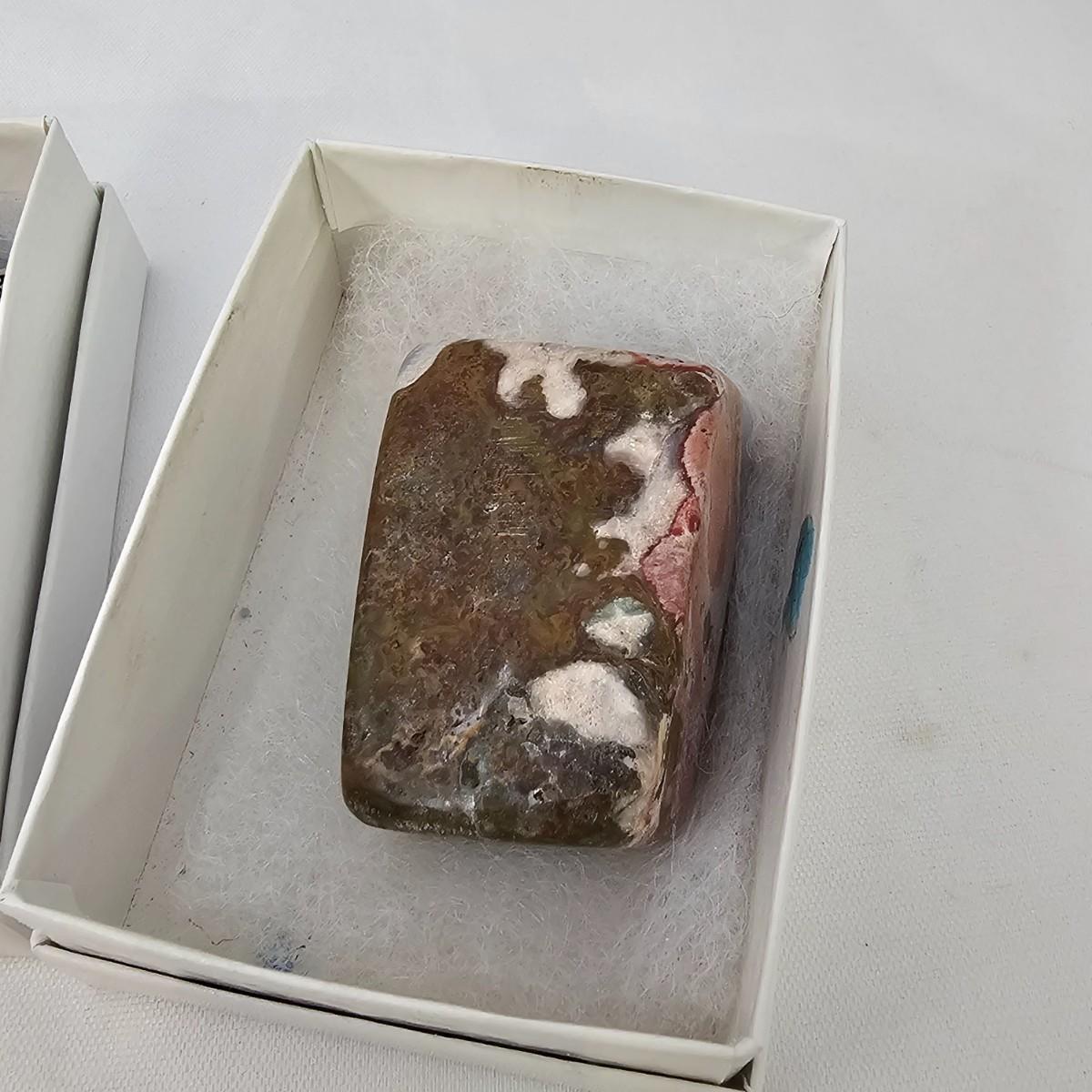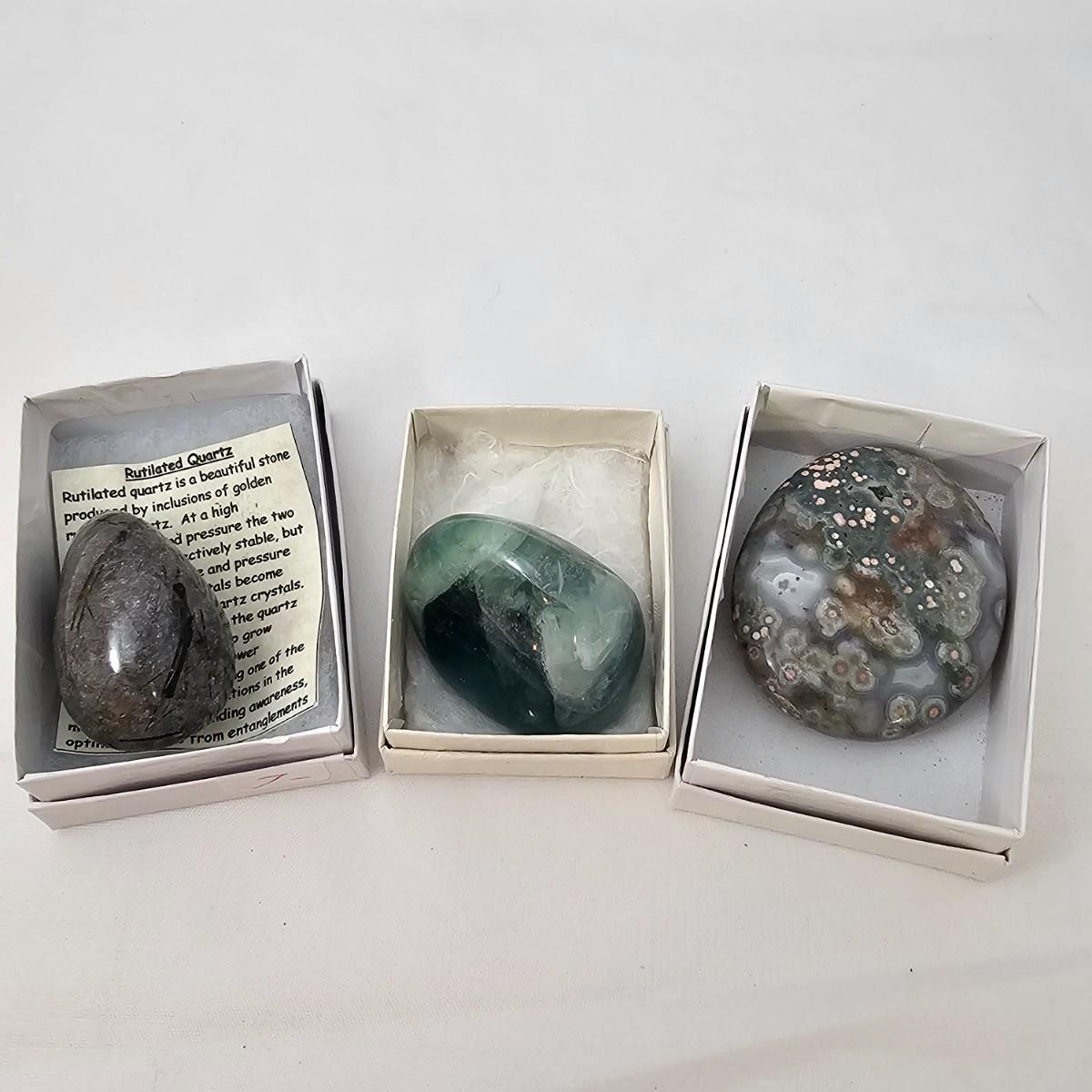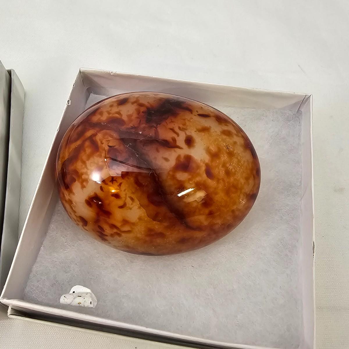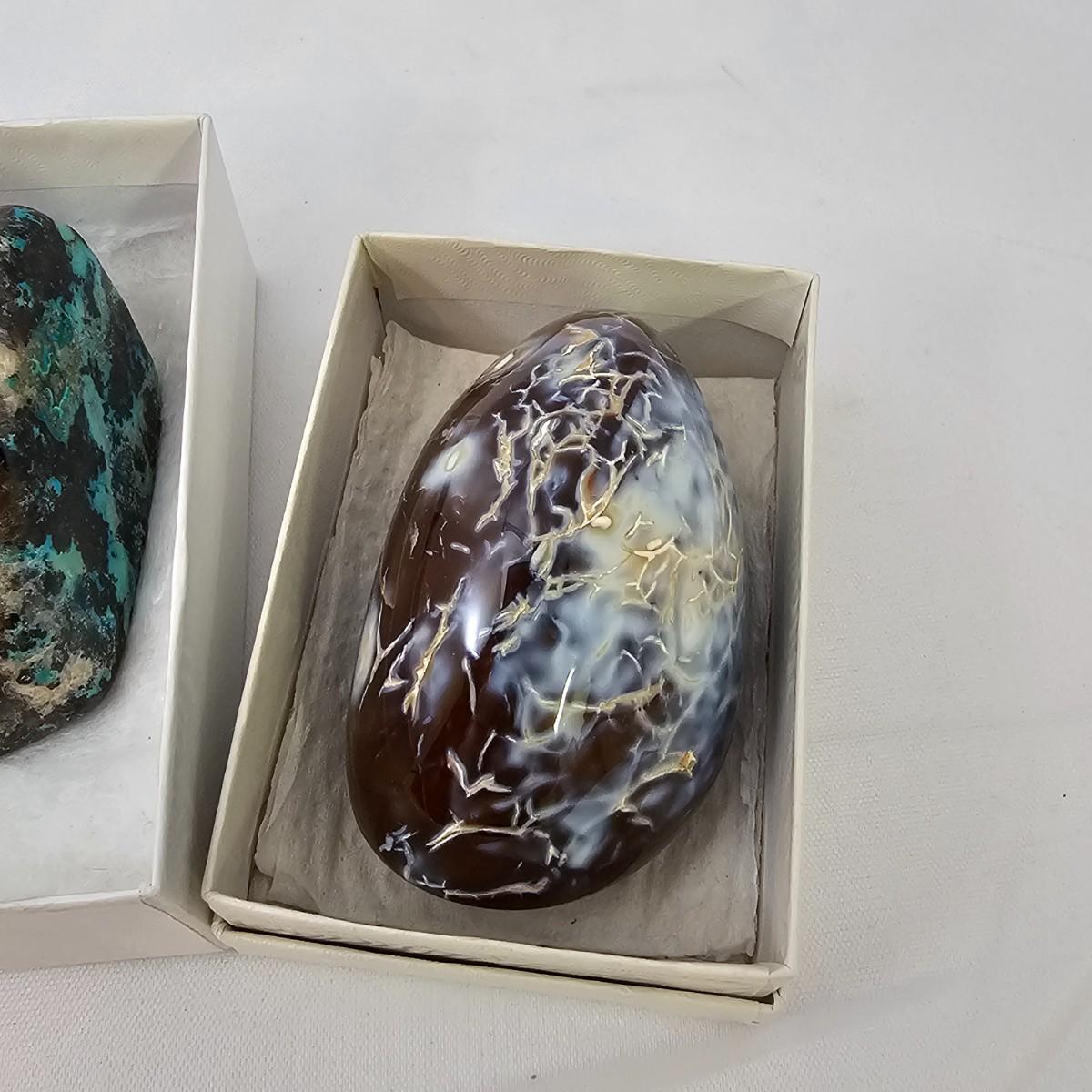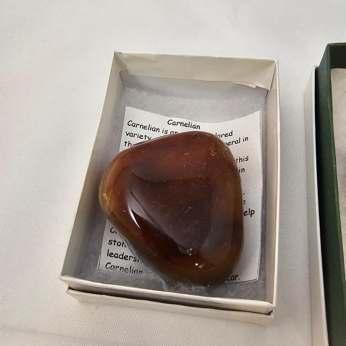 More than 50 highly polished stones in various sizes and shapes. Hearts, rounds and many free form shapes as fits the stone. Stones appear to be carnelian, moonstone, lapis lazuli, rutilated quartz, spectrolite and more. All items in individual boxes, some doubled up. See photos for details. Shipping available. Please note that any price tag seen on an item was not put there by Sterling Transitions and does not reflect the current value of the item. All sales are final. No returns or refunds. Please bid accordingly.