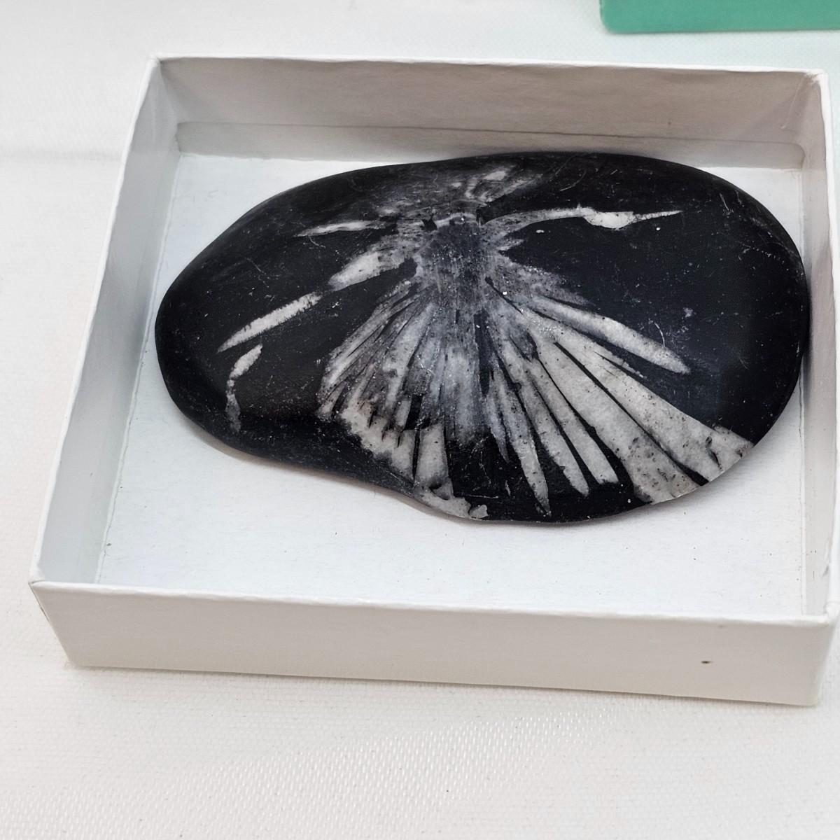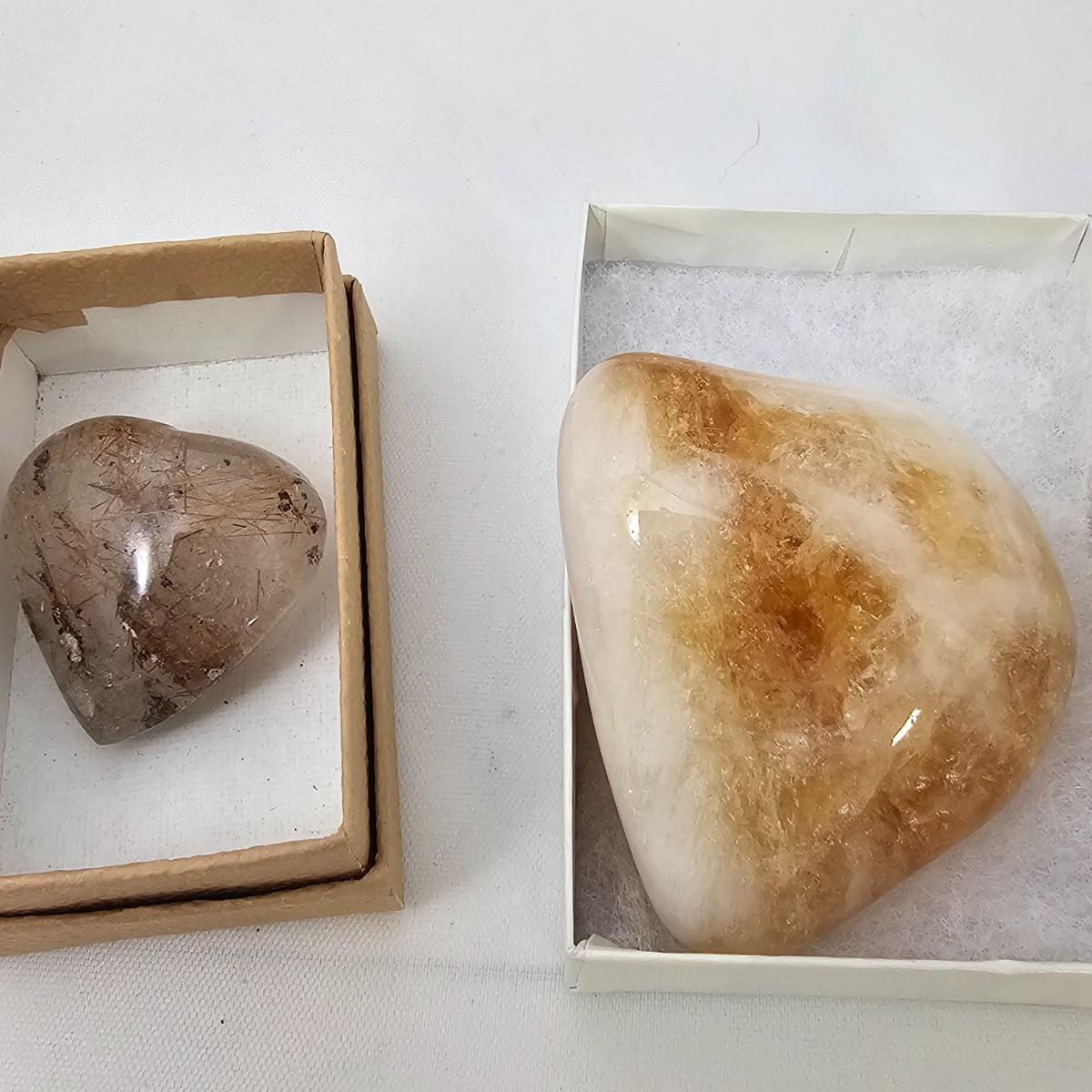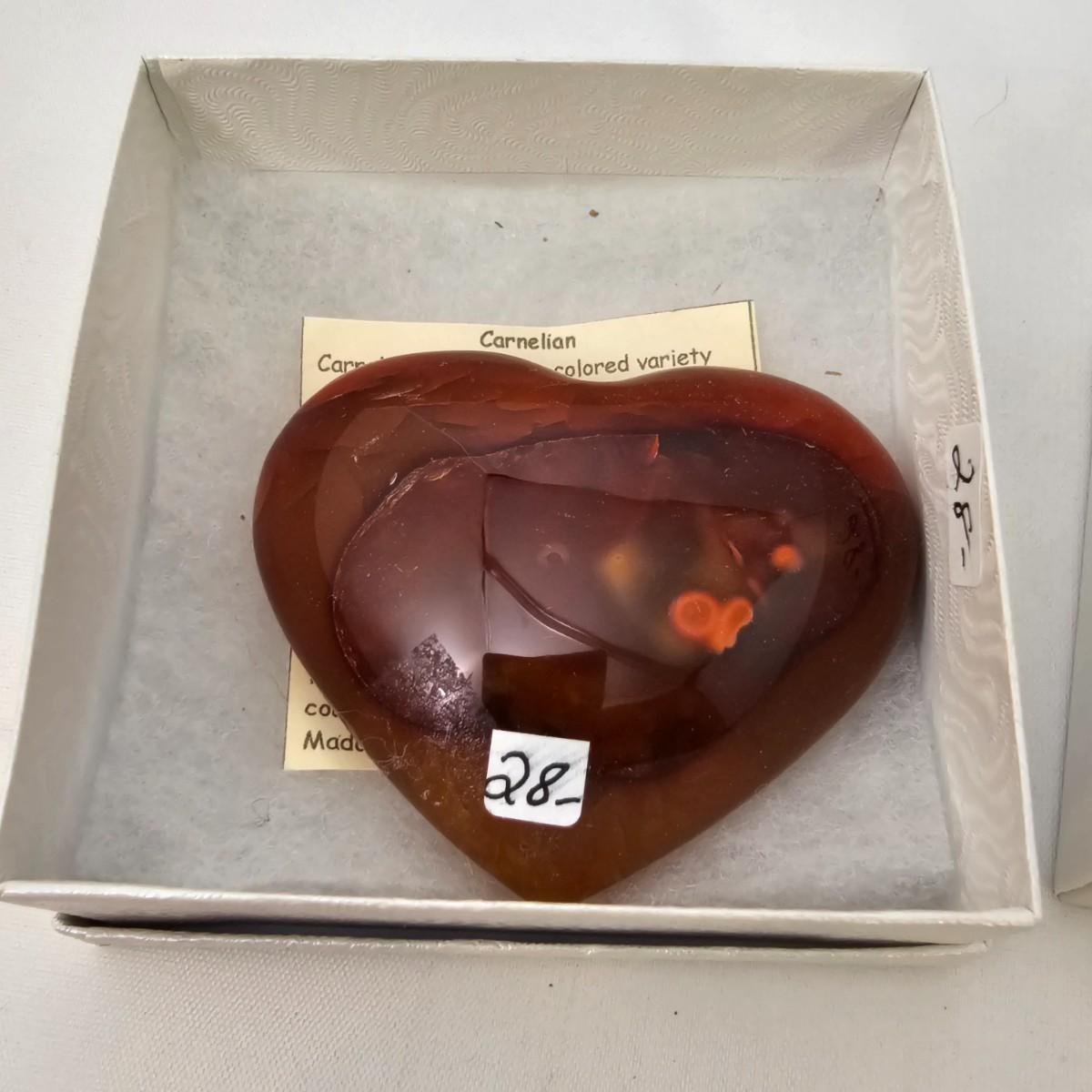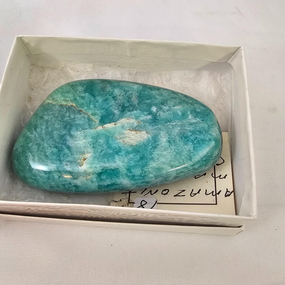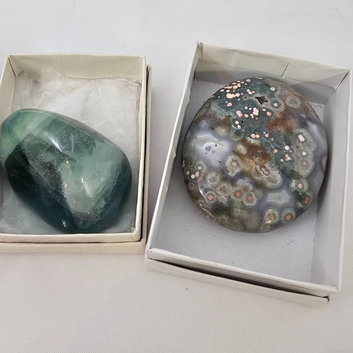 More than 50 highly polished stones in various sizes and shapes. Hearts, rounds and many free form shapes as fits the stone. Stones appear to be carnelian, moonstone, lapis lazuli, rutilated quartz, spectrolite and more. All items in individual boxes, some doubled up. See photos for details. Shipping available. Please note that any price tag seen on an item was not put there by Sterling Transitions and does not reflect the current value of the item. All sales are final. No returns or refunds. Please bid accordingly.