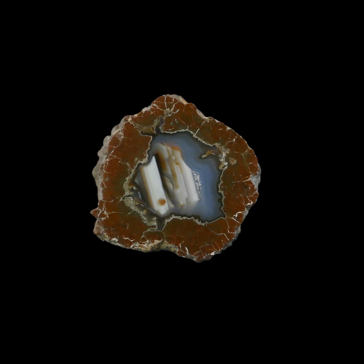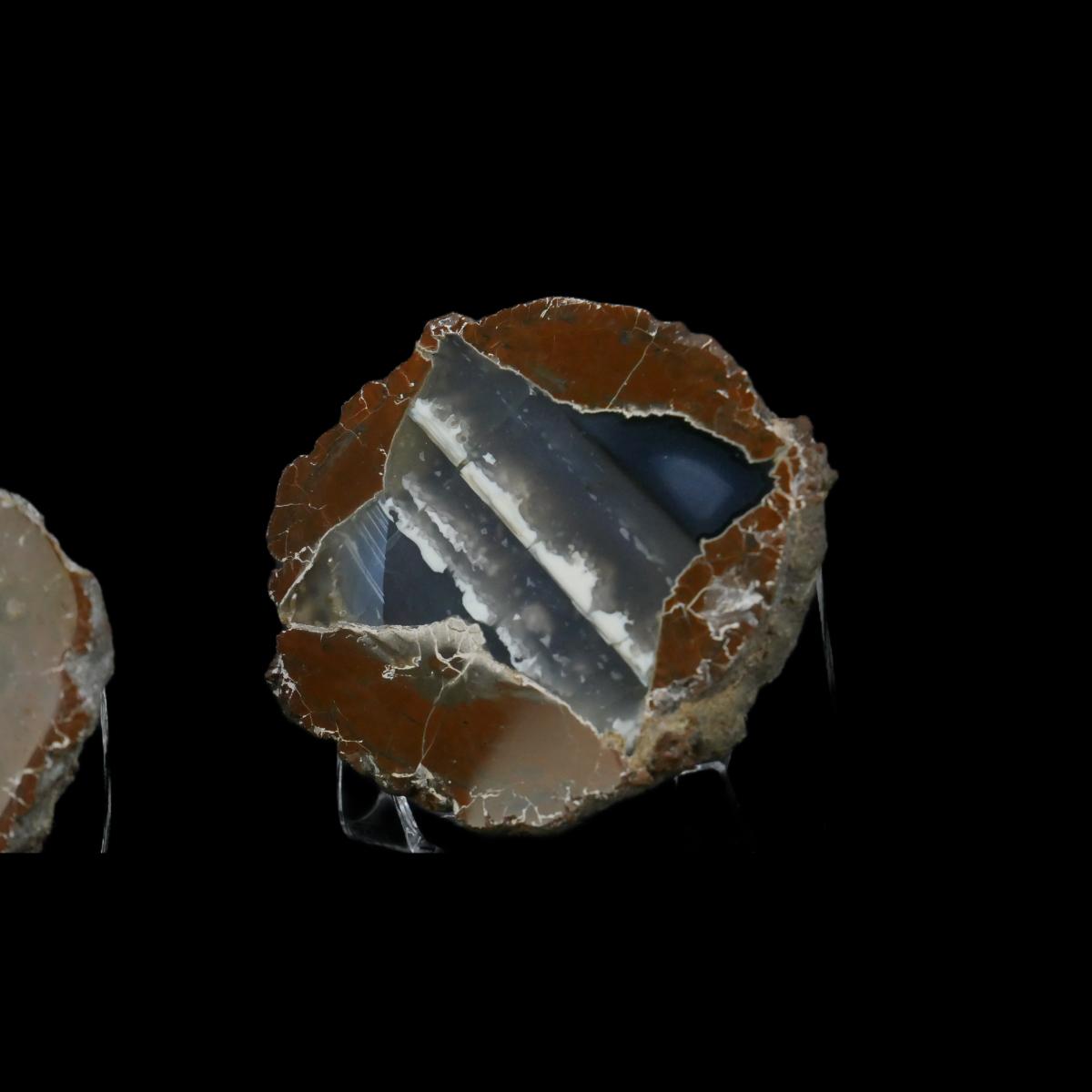 Three gorgeous thunderegg halves, each polished on one side. Similar to a filled geode, thundereggs are formed with rhyolitic volcanic ash layers. Brilliant light blue, cream, and brown colors. Two have natural formation of silver glitter. Absolutely mesmerizing! Superb condition! Stands not included. Largest is 3.5" in length. Lot weighs 1 lb 4 oz/574g. (R19)