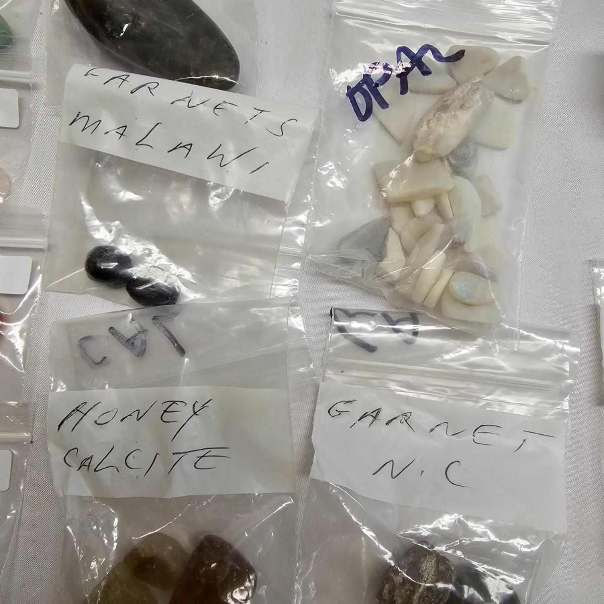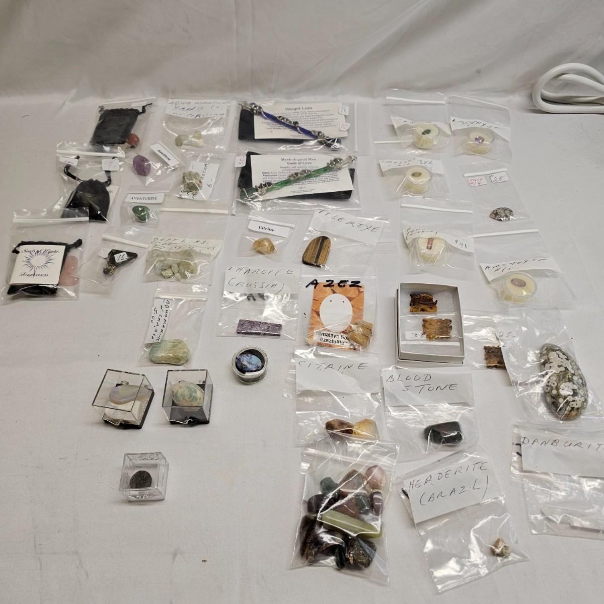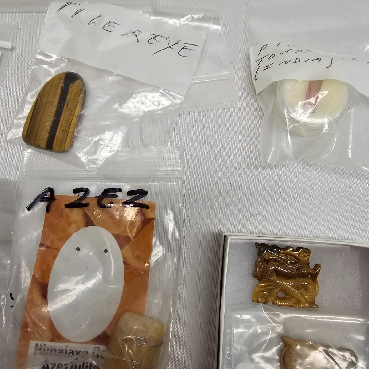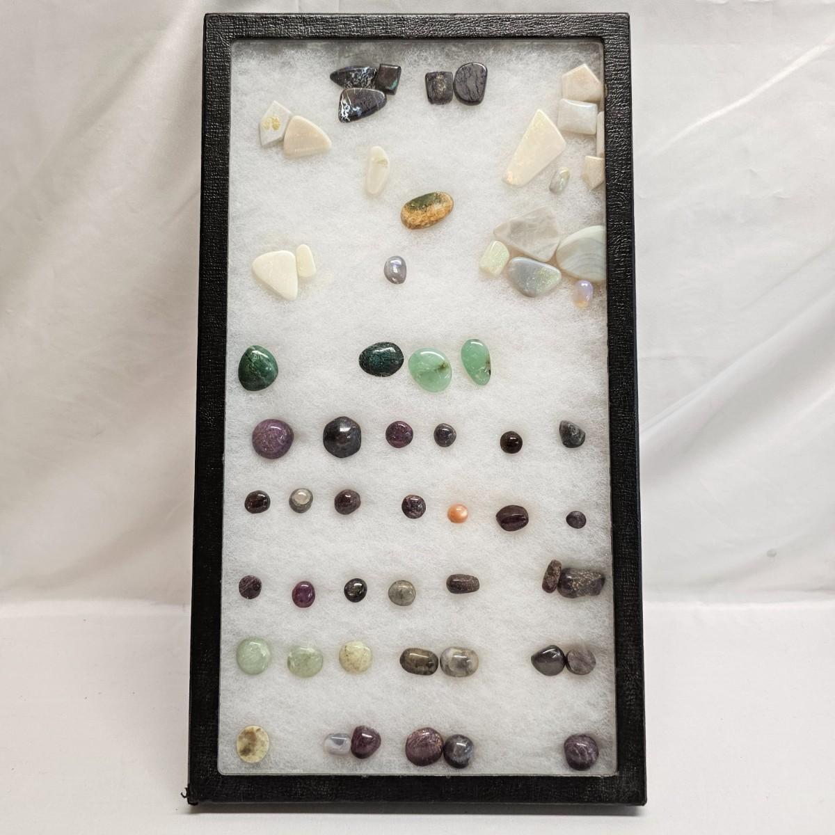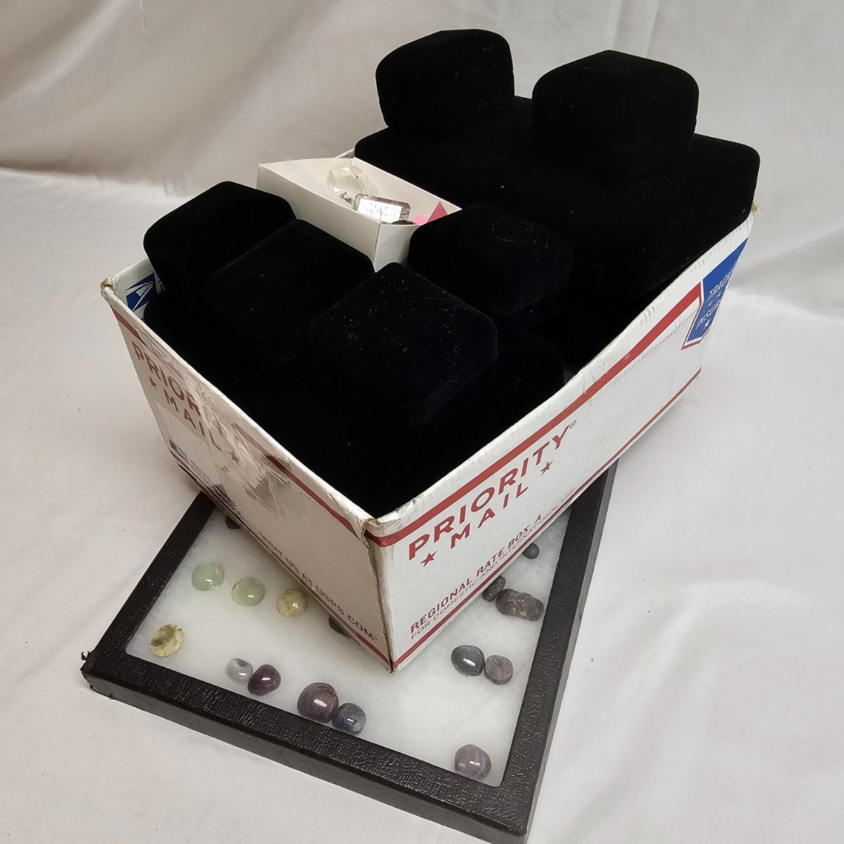 Finished cabochons, faceted stones, free form and more in this batch. Items appear to be opal, garnet, angelite, aquamarine, sodalite, rhodonite, tiger eye, rhodochrosite and more. Some in large flat display, some in bags, some in individual holders. Also, nine jewelry boxes: three are 4.5" x 7" x 1"H for necklaces and six ring boxes are 2" x 2.5" x 1"H. See photos for details. Shipping available. Please note that any price tag seen on an item was not put there by Sterling Transitions and does not reflect the current value of the item. All sales are final. No returns or refunds. Please bid accordingly.
