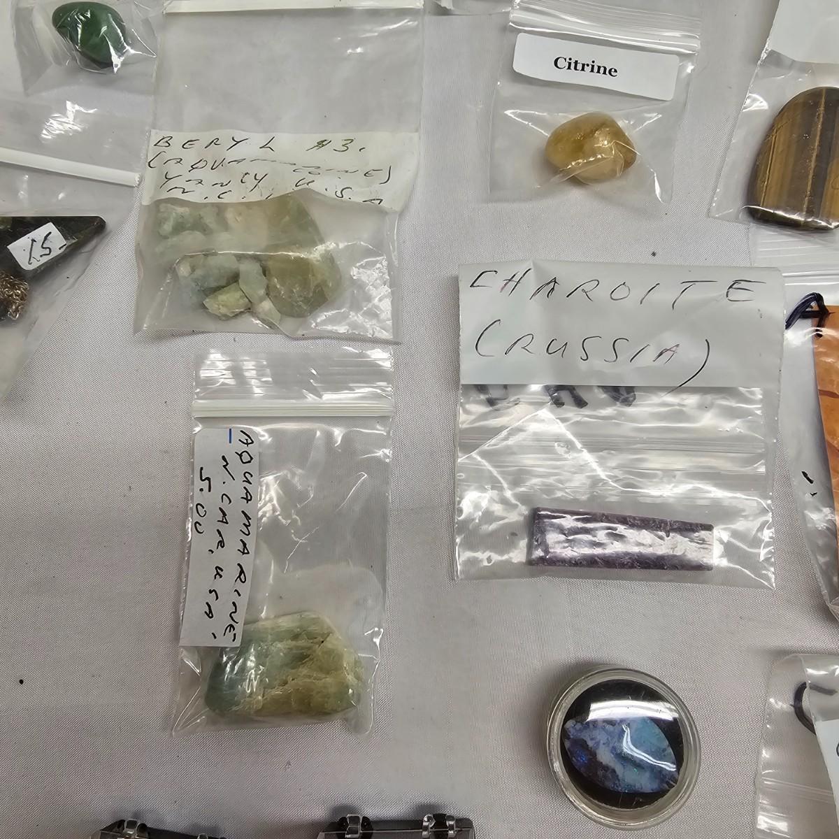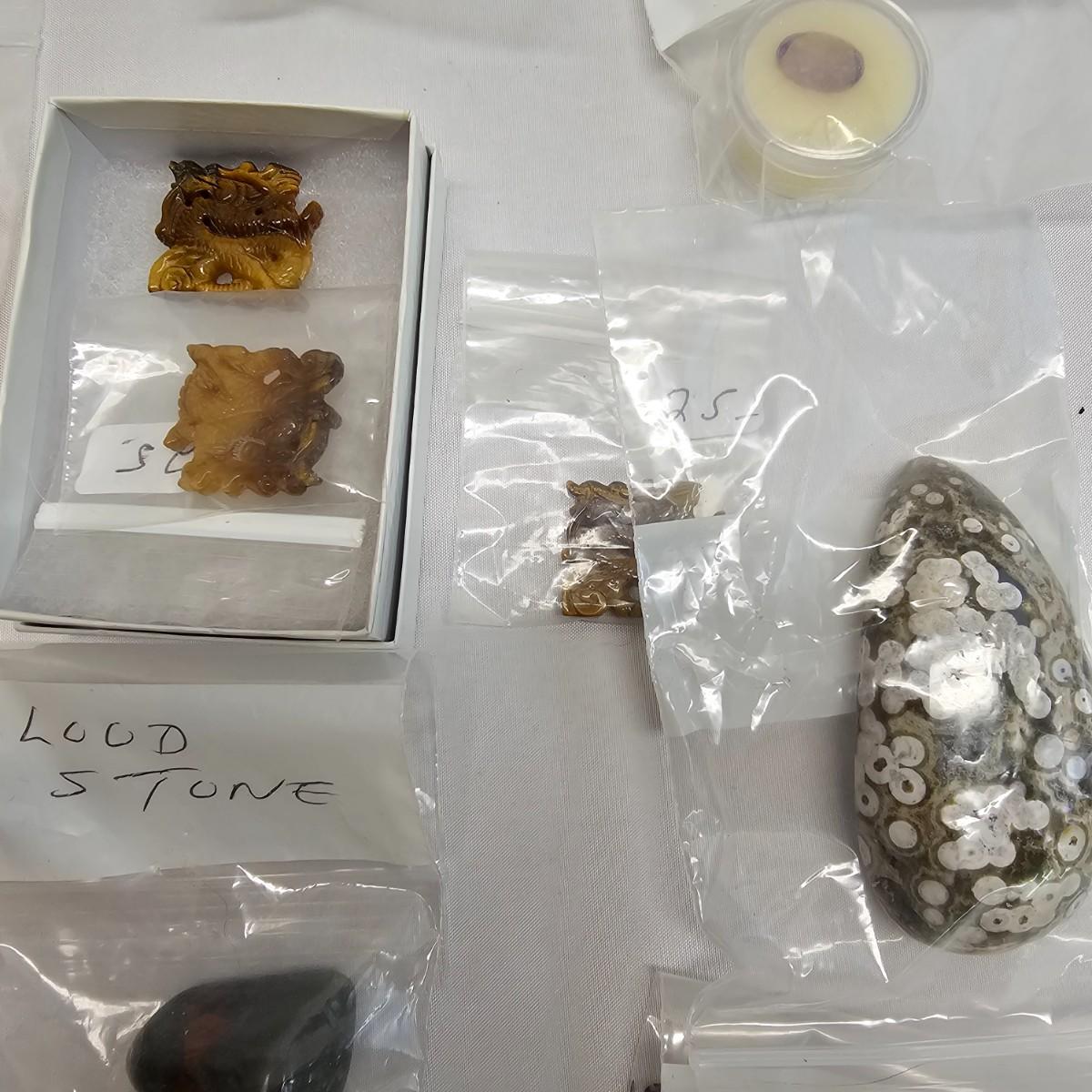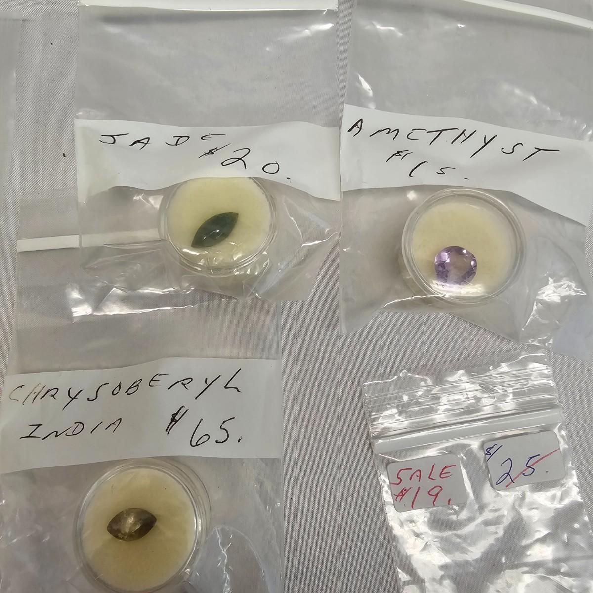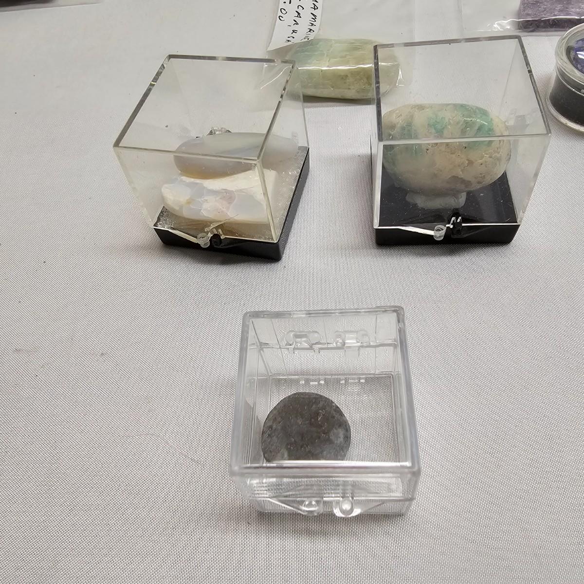 Finished cabochons, faceted stones, free form and more in this batch. Items appear to be opal, garnet, angelite, aquamarine, sodalite, rhodonite, tiger eye, rhodochrosite and more. Some in large flat display, some in bags, some in individual holders. Also, nine jewelry boxes: three are 4.5" x 7" x 1"H for necklaces and six ring boxes are 2" x 2.5" x 1"H. See photos for details. Shipping available. Please note that any price tag seen on an item was not put there by Sterling Transitions and does not reflect the current value of the item. All sales are final. No returns or refunds. Please bid accordingly.