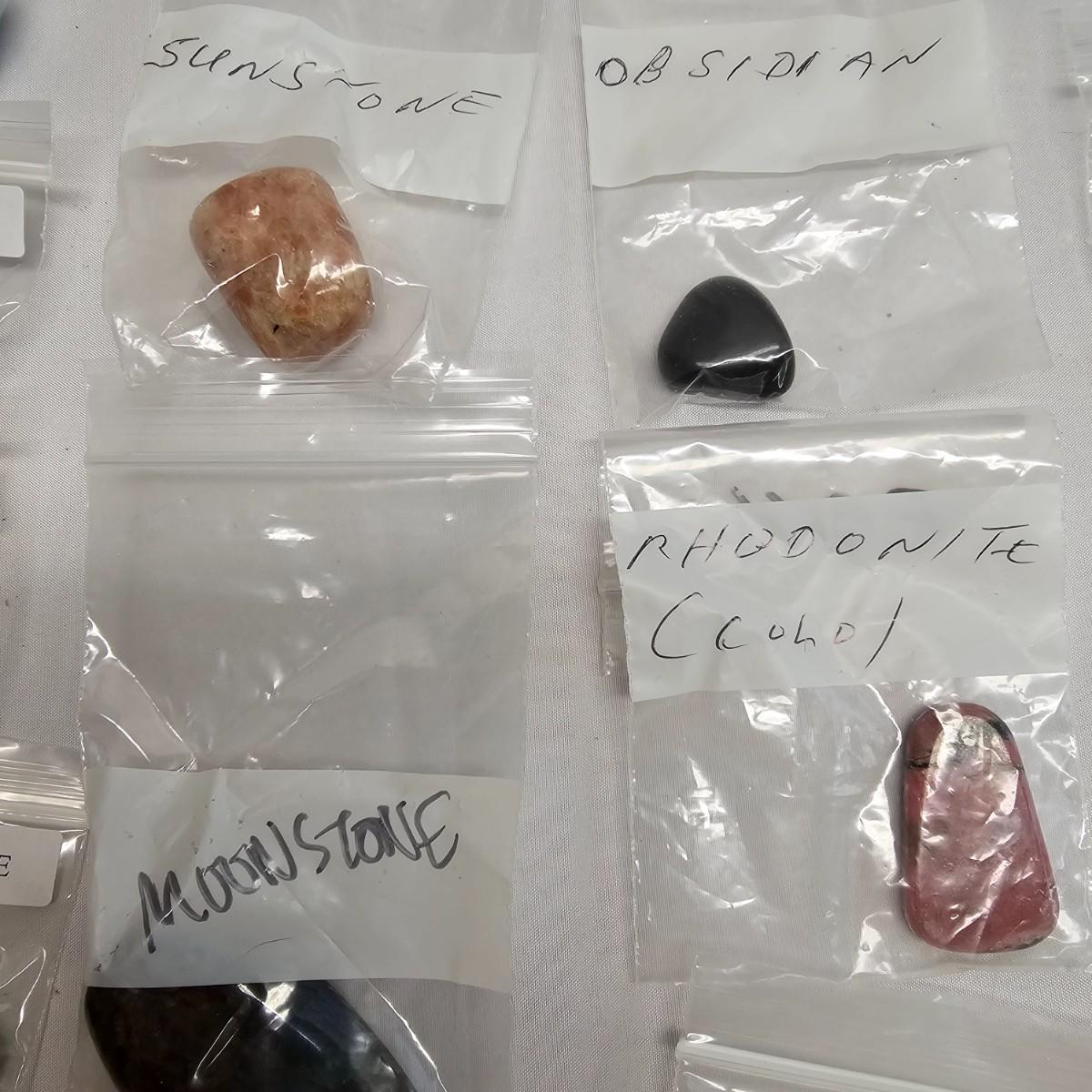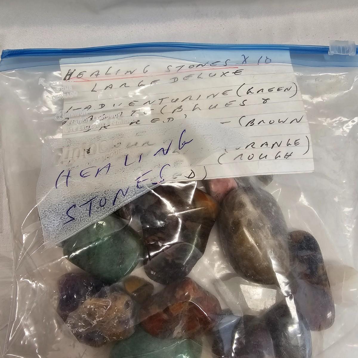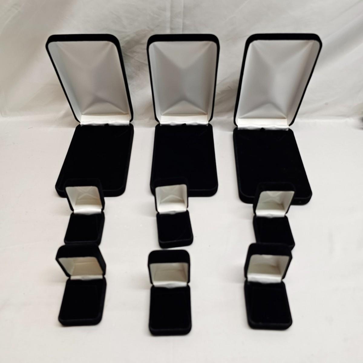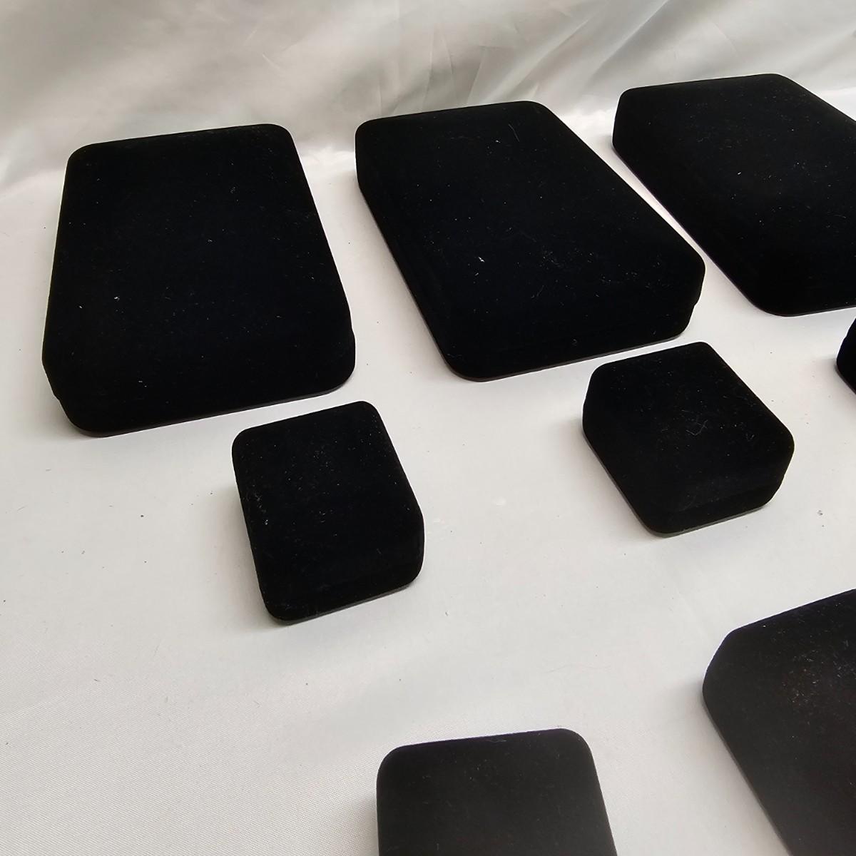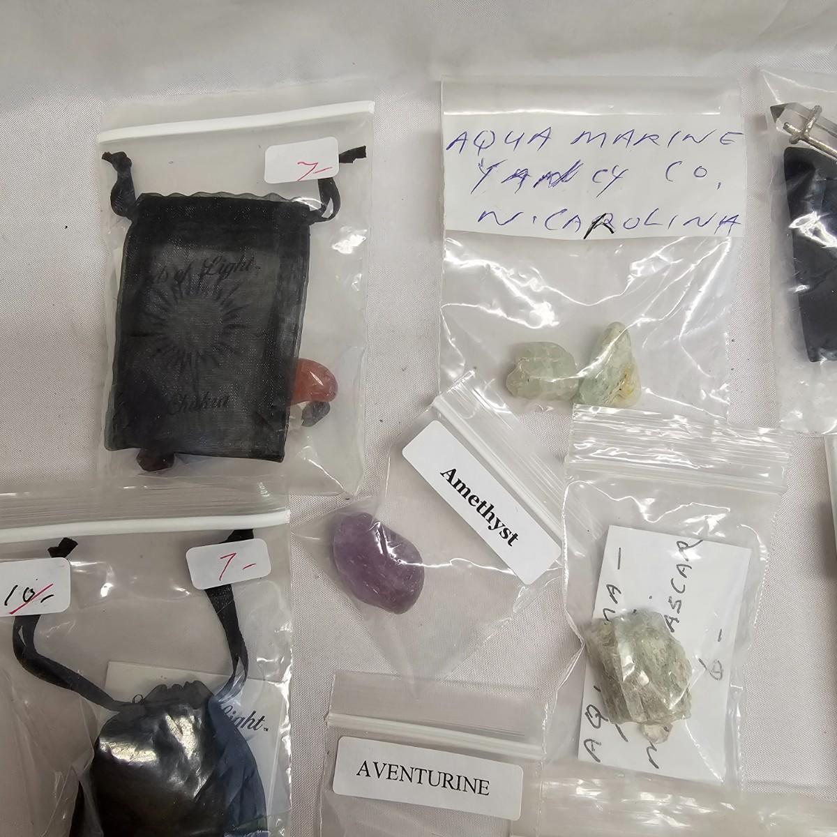 Finished cabochons, faceted stones, free form and more in this batch. Items appear to be opal, garnet, angelite, aquamarine, sodalite, rhodonite, tiger eye, rhodochrosite and more. Some in large flat display, some in bags, some in individual holders. Also, nine jewelry boxes: three are 4.5" x 7" x 1"H for necklaces and six ring boxes are 2" x 2.5" x 1"H. See photos for details. Shipping available. Please note that any price tag seen on an item was not put there by Sterling Transitions and does not reflect the current value of the item. All sales are final. No returns or refunds. Please bid accordingly.