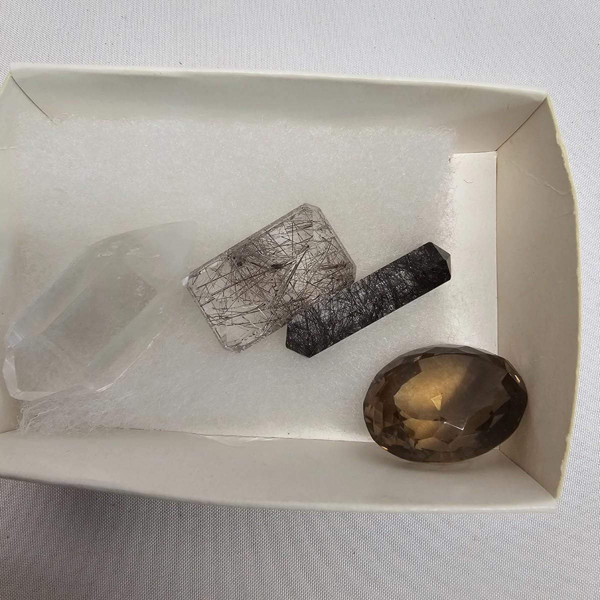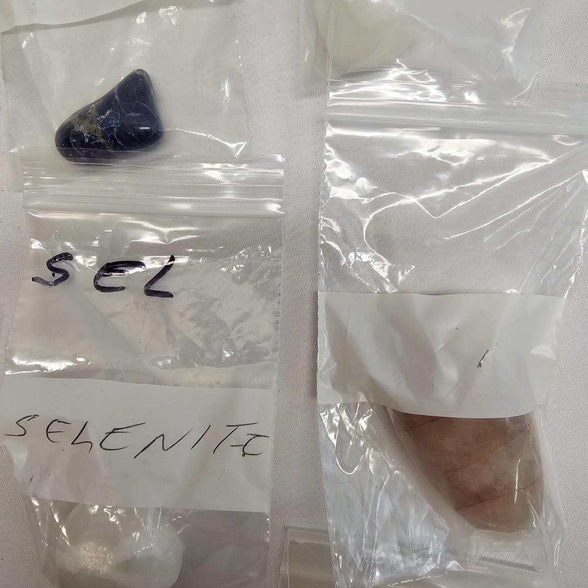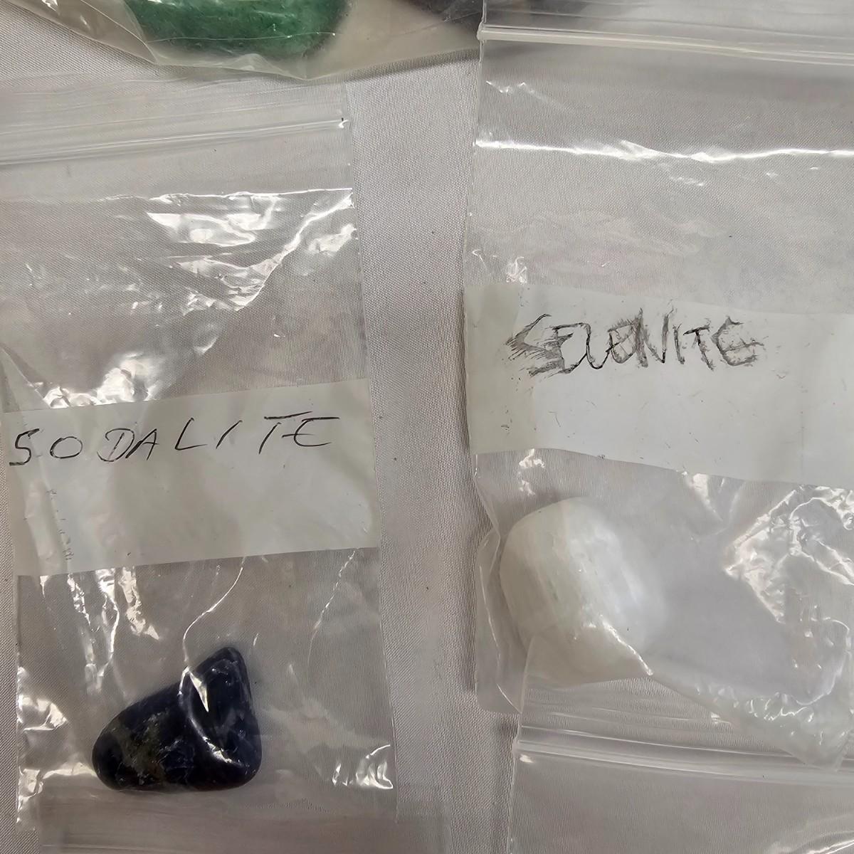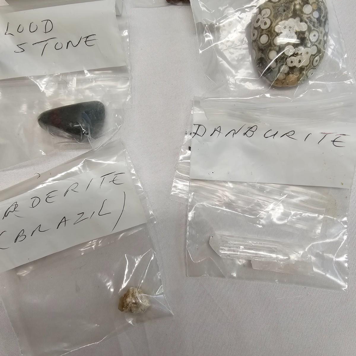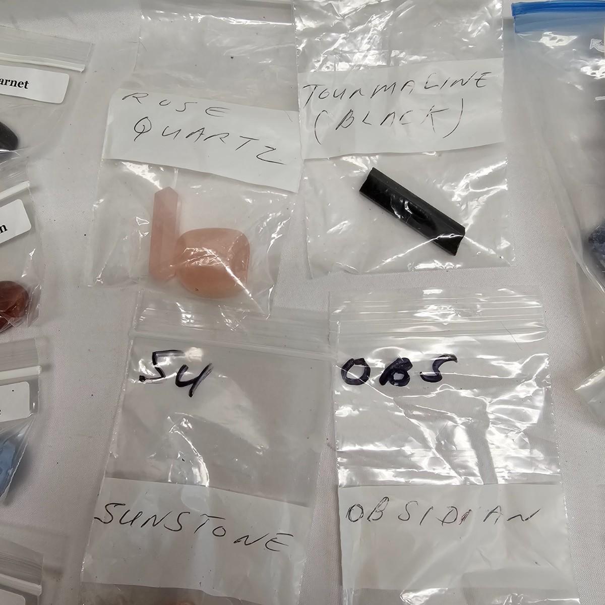 Finished cabochons, faceted stones, free form and more in this batch. Items appear to be opal, garnet, angelite, aquamarine, sodalite, rhodonite, tiger eye, rhodochrosite and more. Some in large flat display, some in bags, some in individual holders. Also, nine jewelry boxes: three are 4.5" x 7" x 1"H for necklaces and six ring boxes are 2" x 2.5" x 1"H. See photos for details. Shipping available. Please note that any price tag seen on an item was not put there by Sterling Transitions and does not reflect the current value of the item. All sales are final. No returns or refunds. Please bid accordingly.