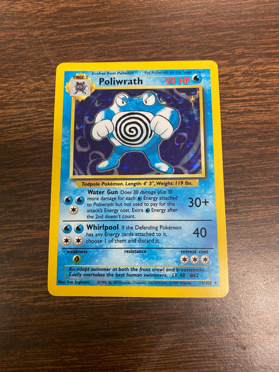 Poliwrath Pokemon card from the Base Set. Features 90 HP and displays attacks Water Gun (30+) and Whirlpool (40). Marked as card number 13/102. Condition is light play, with minor cosmetic wear visible. Authentic backed design shown. A sought-after card in the original Base Set lineup.