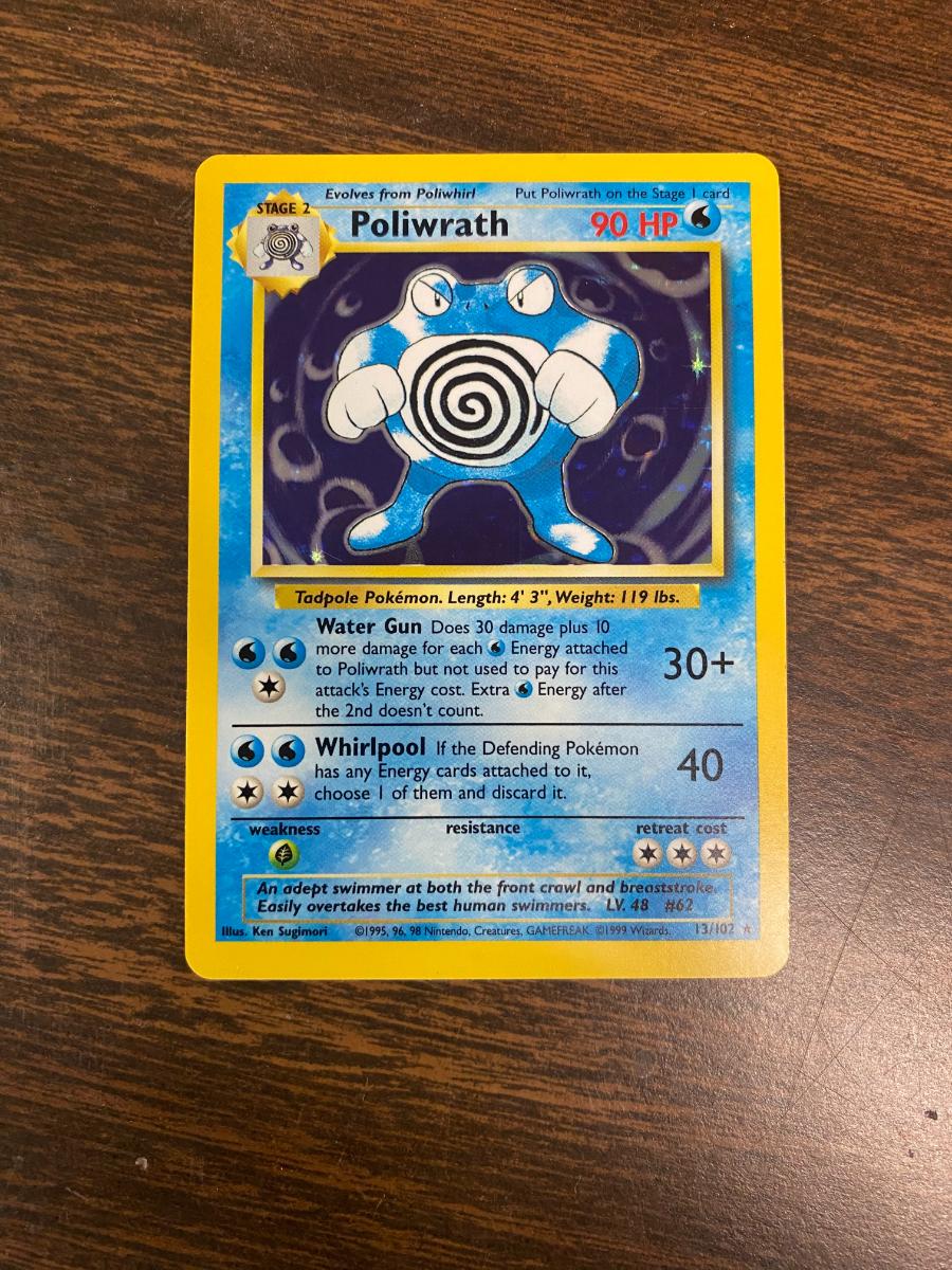 Poliwrath holographic card from the Pokemon TCG, 1st Edition. Card number 13/102 from the Base Set. Showing light play with minor wear visible on edges and corners. Ideal for collectors seeking early Pokemon trading cards. Proper care is recommended for preservation.