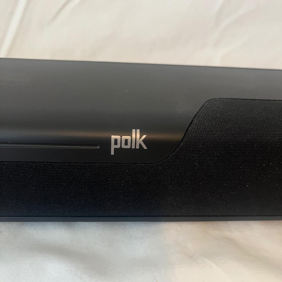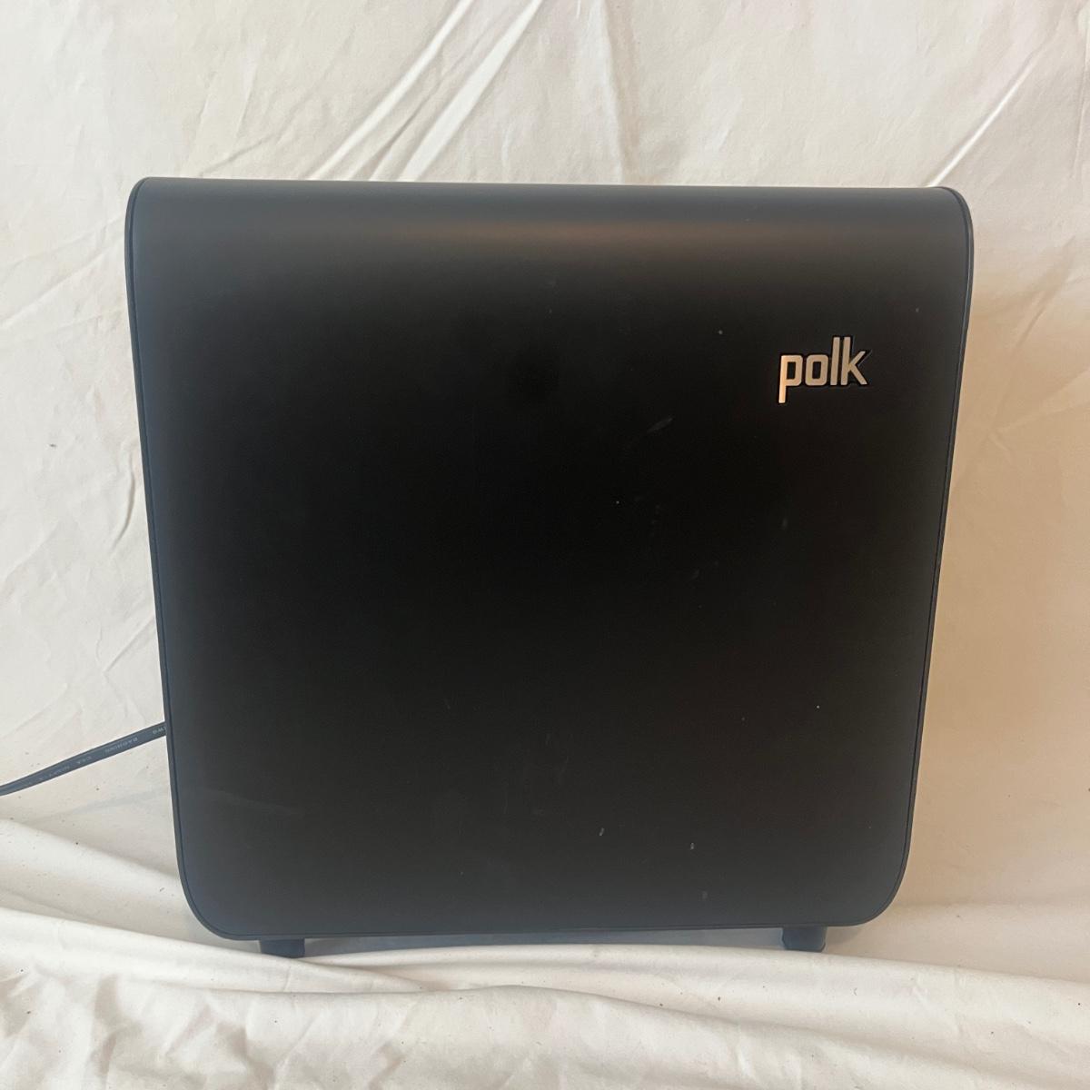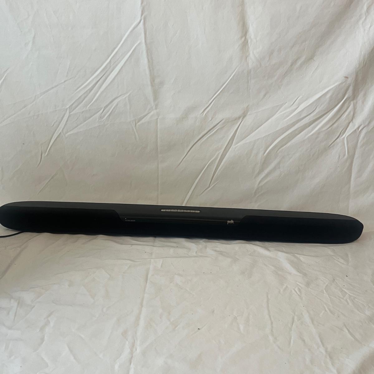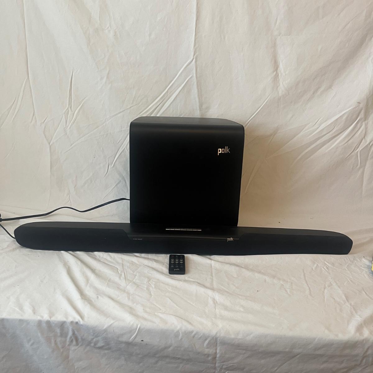 Lot includes a Polk sound bar and subwoofer and remote. All items powered on when plugged in. Sound bar measures 34” x 3” x 2”H.