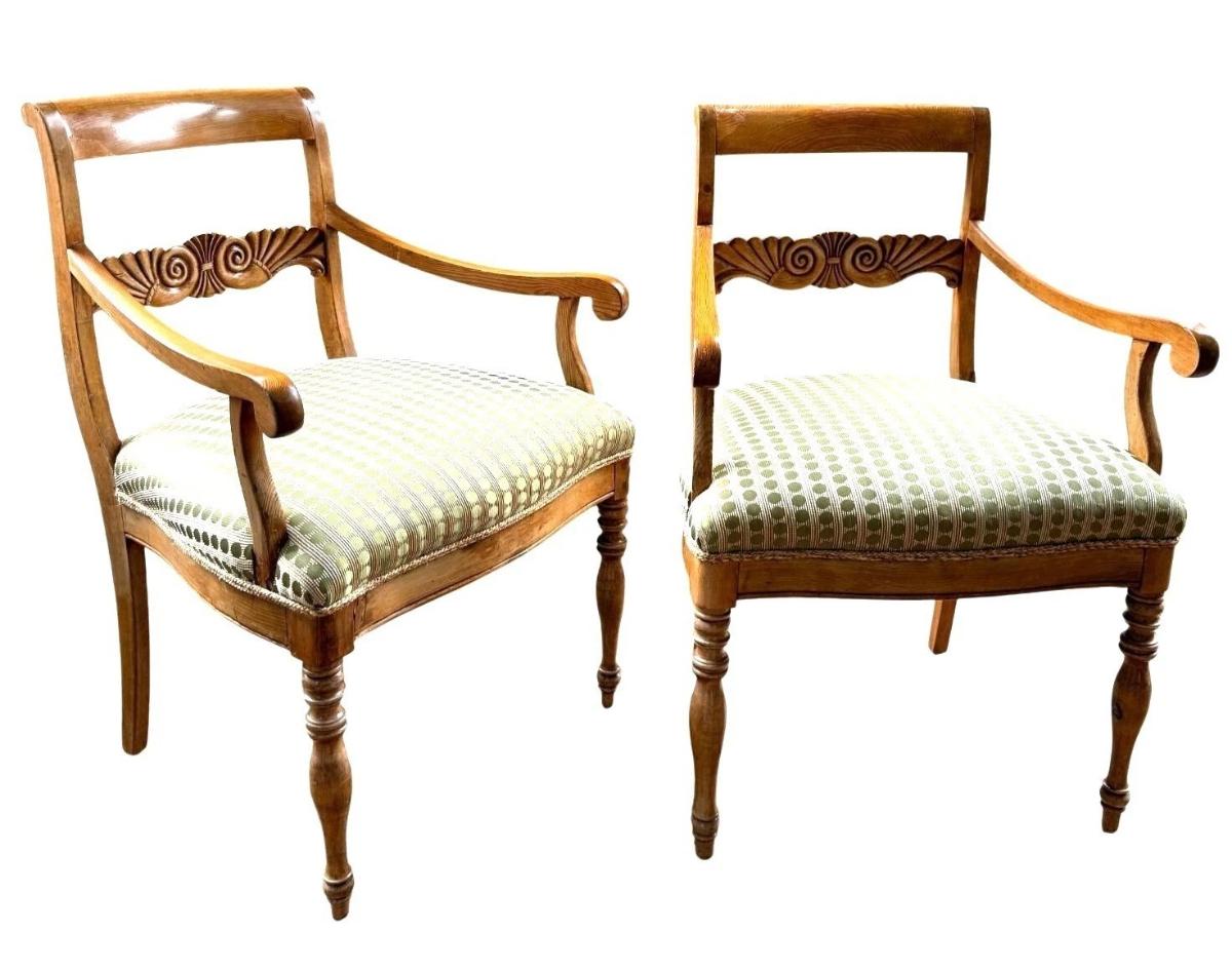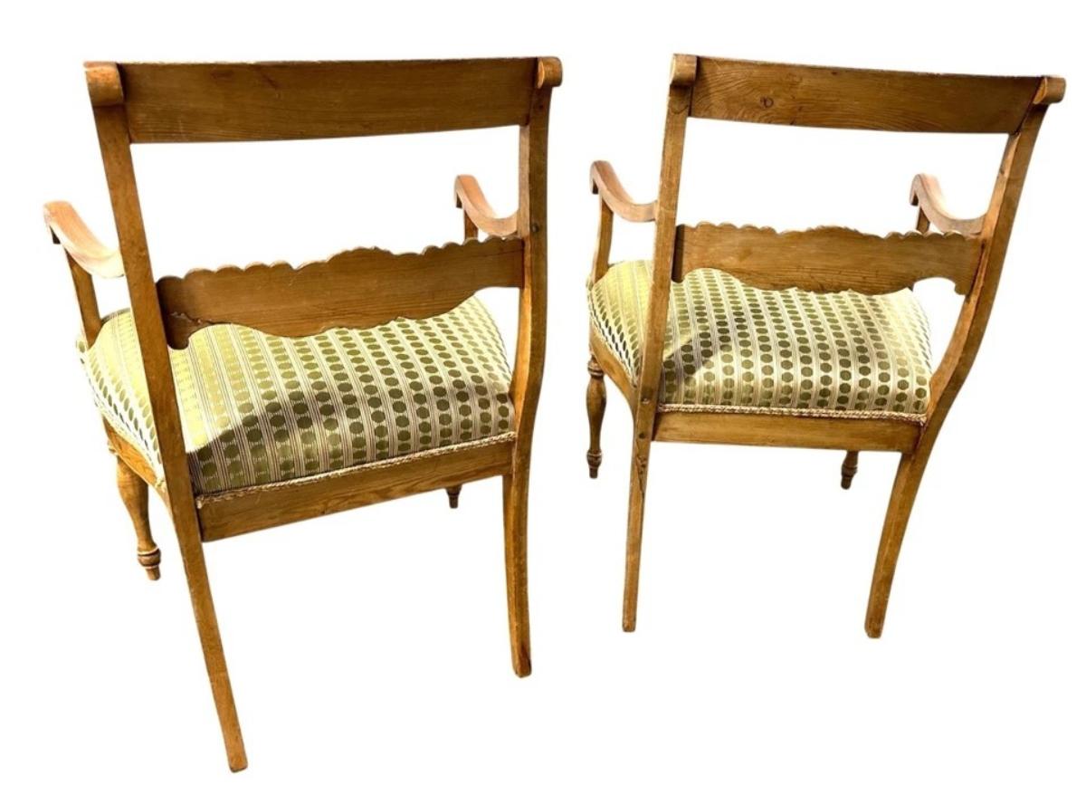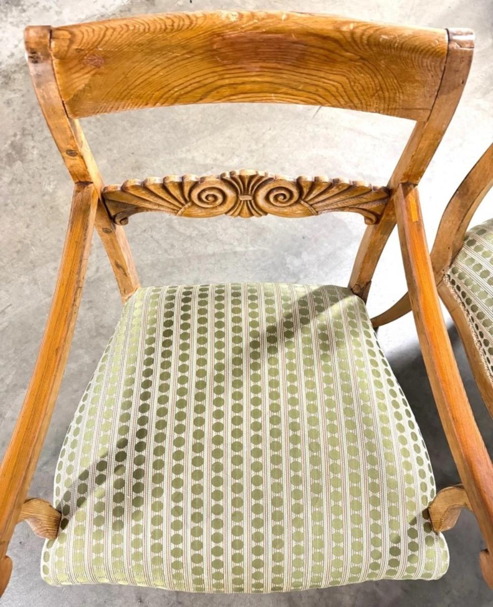 These chairs are antique - they have splitting in the wood seams, nicks, scuffs and fading of the wood stain. One of the chairs has a portion of the back glued together. Fabric in great newly reupholstered condition