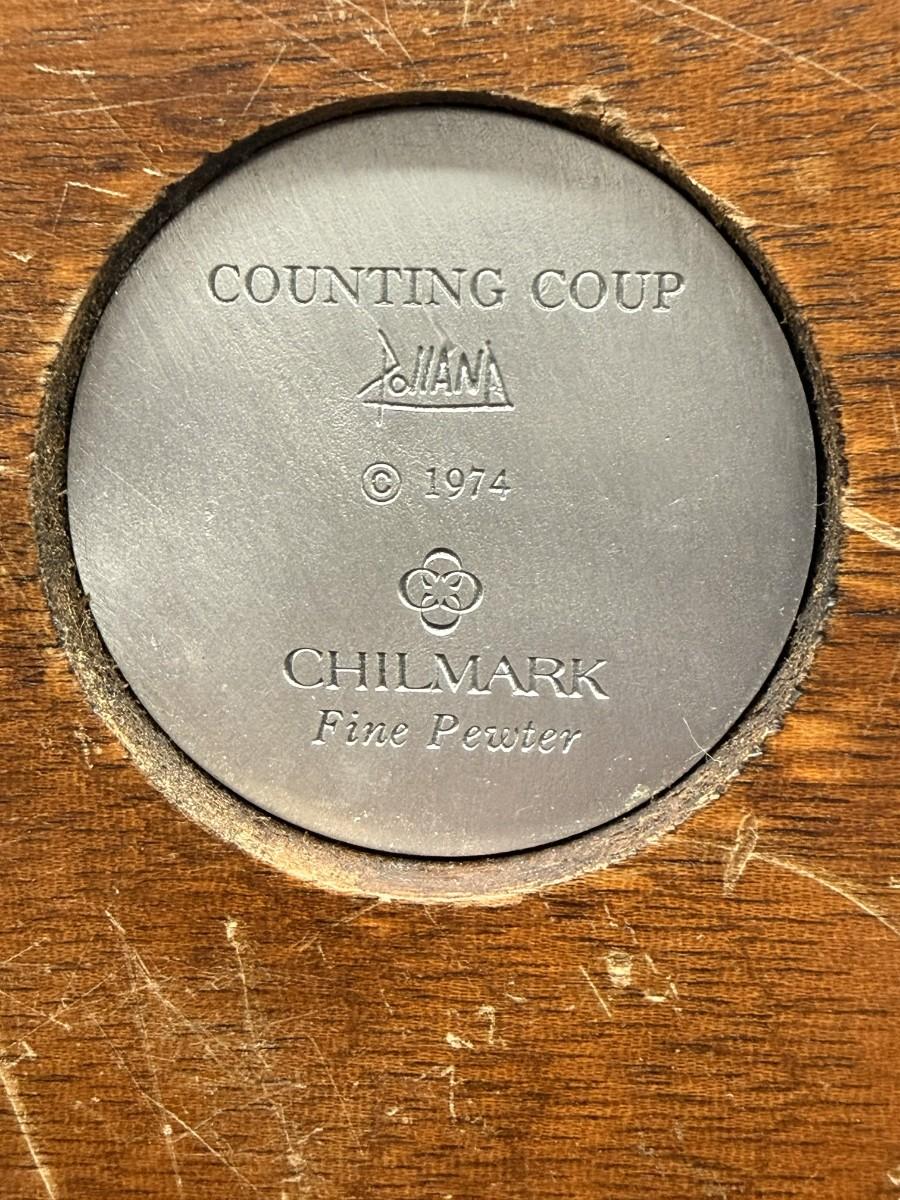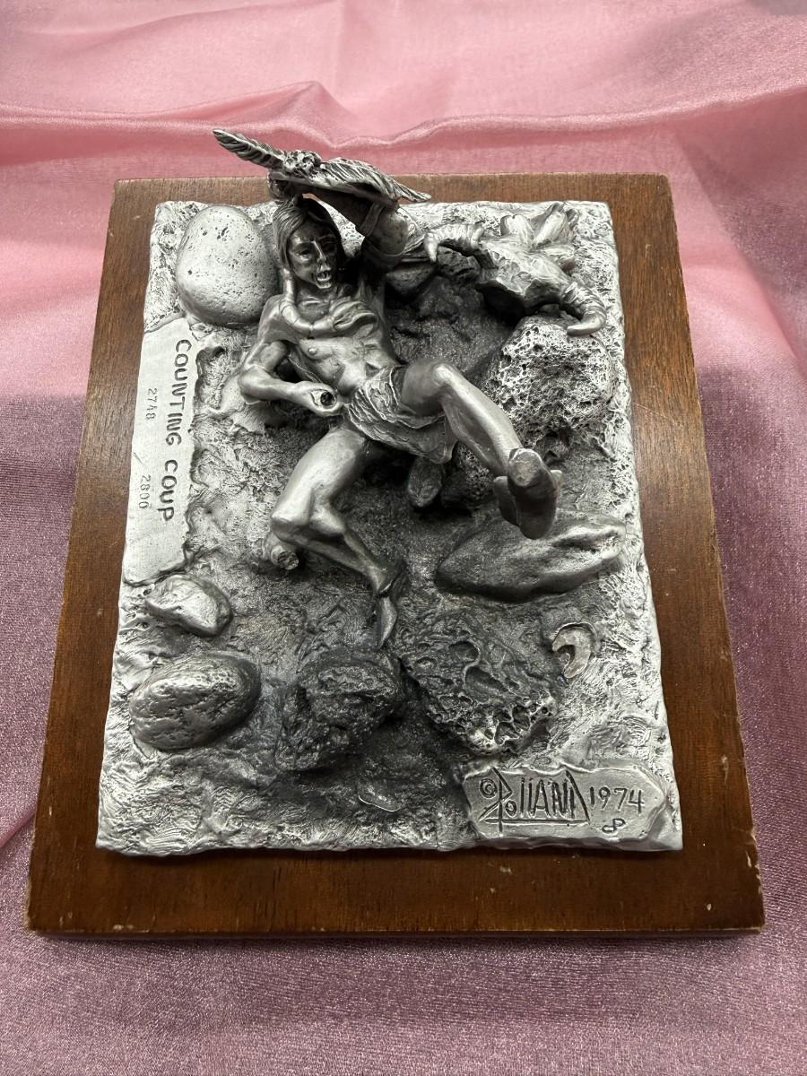 Pewter Sculpture dated 1974 depicts Native American with shield.