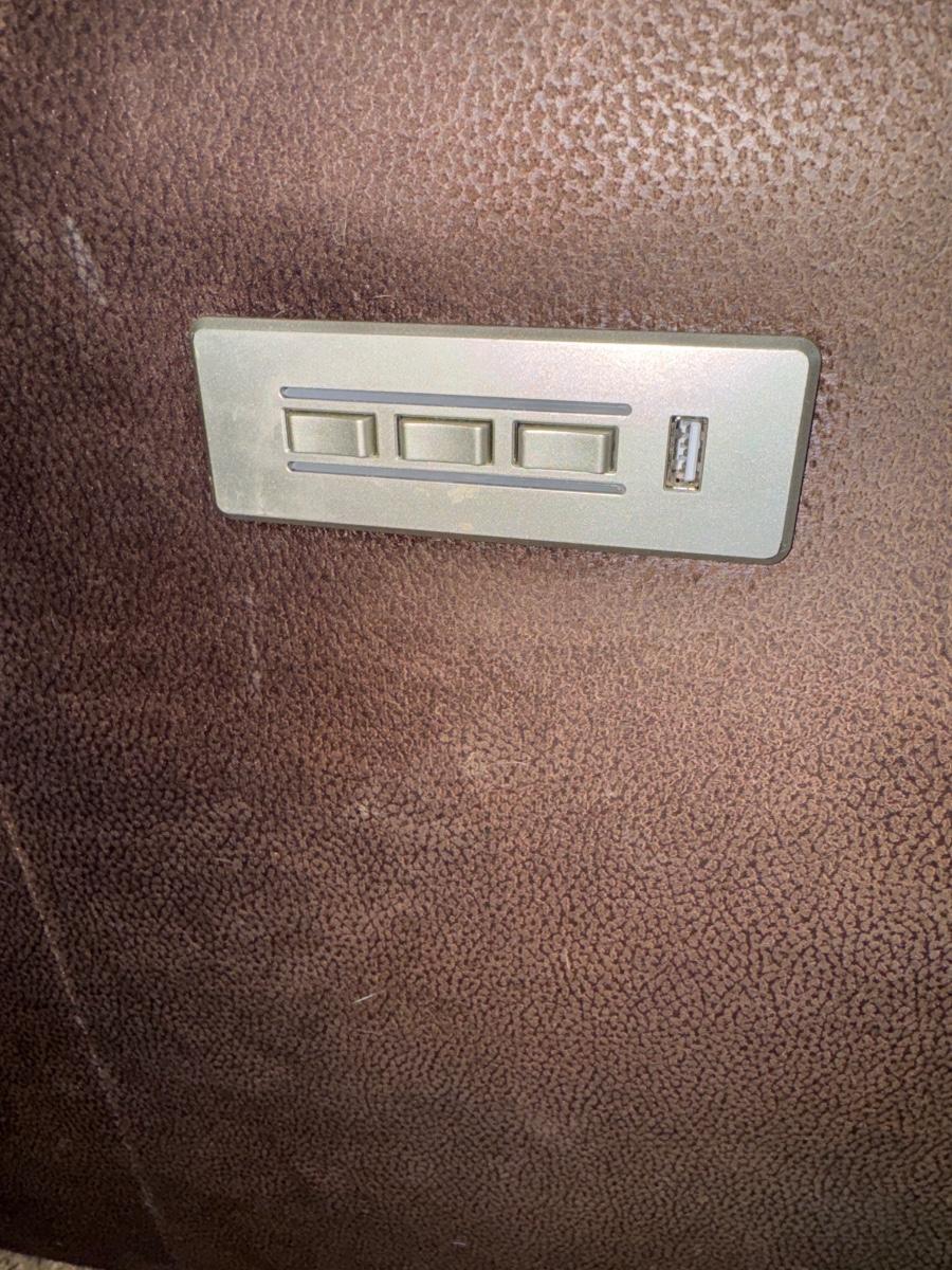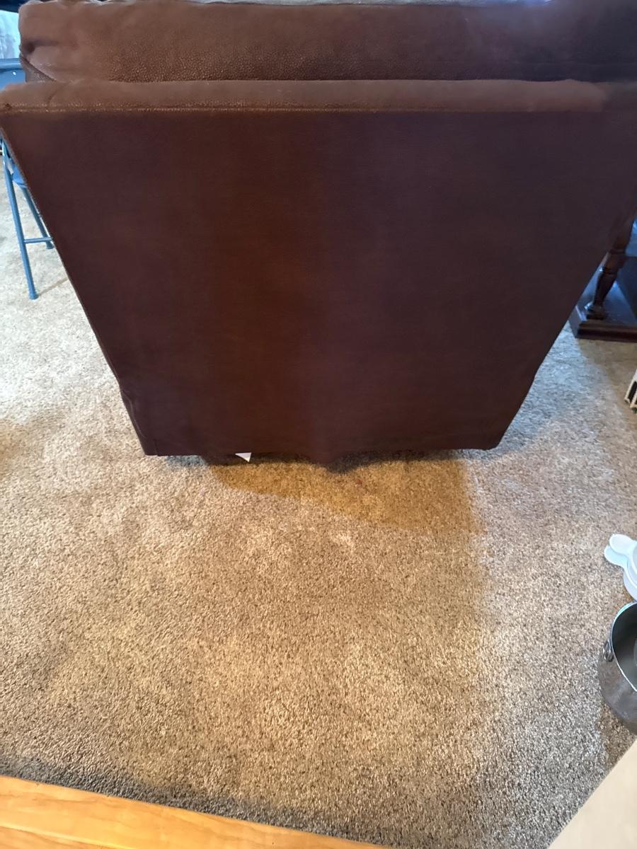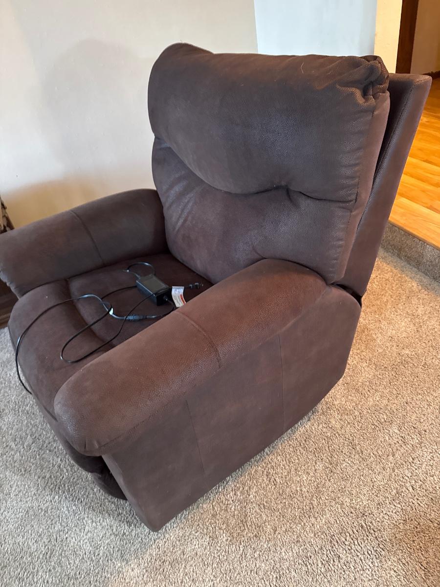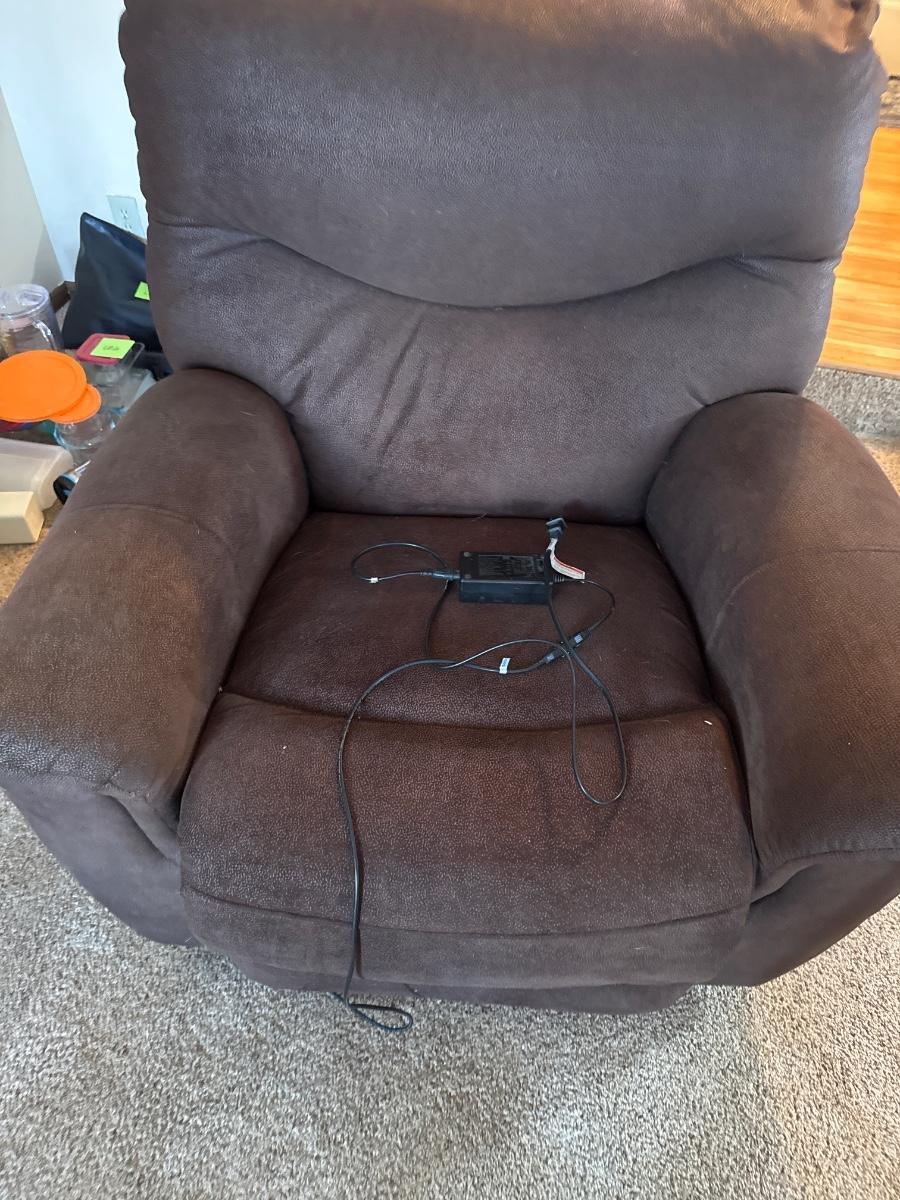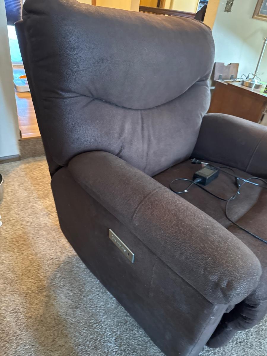Polyester, fiber, power chair. Tested all buttons and the chair works great!