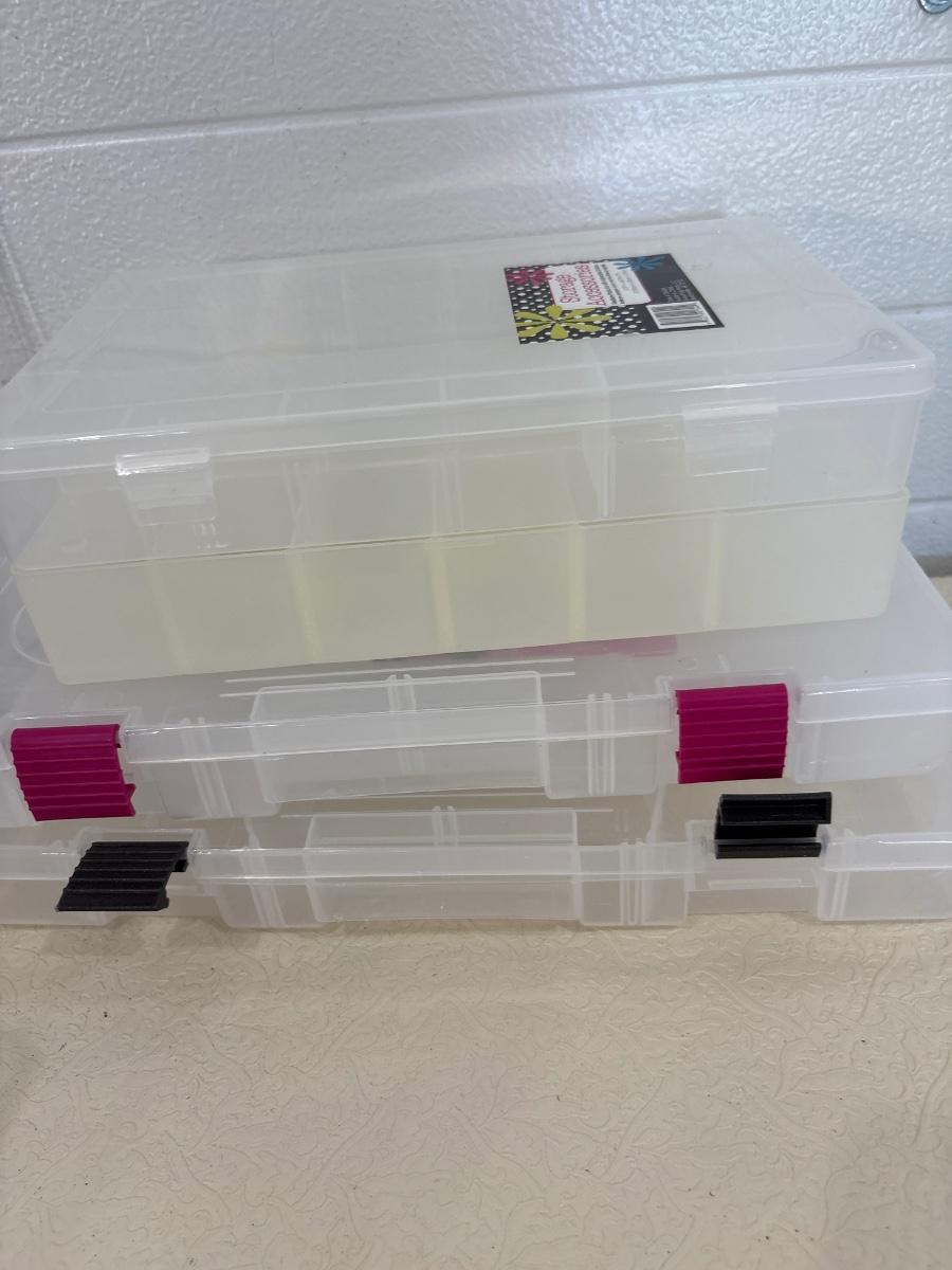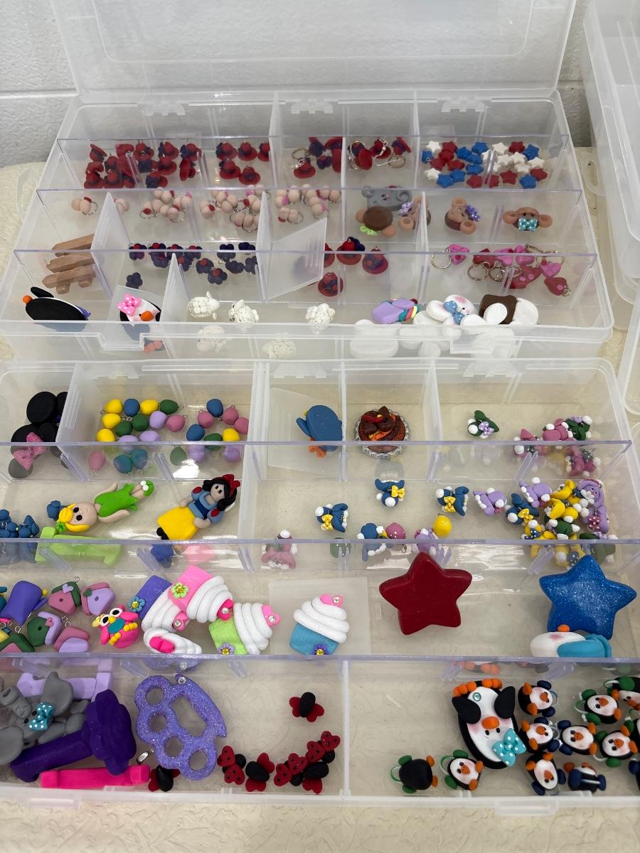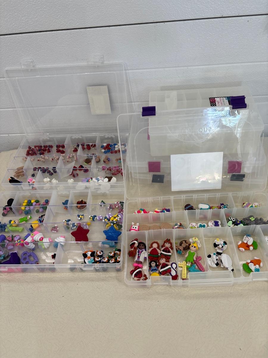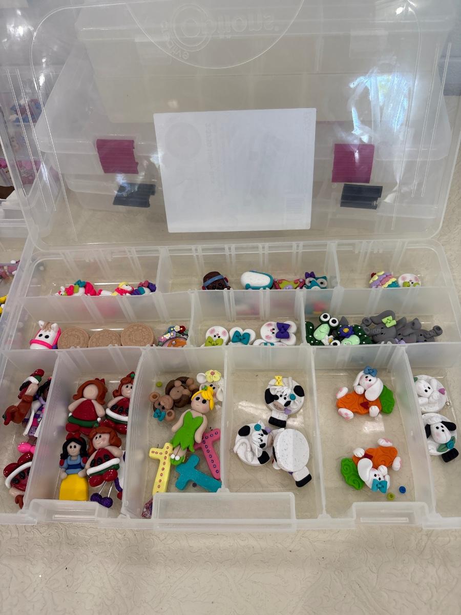 Four crafting totes without littles; three crafting totes with little polymer clay figurines handmade.