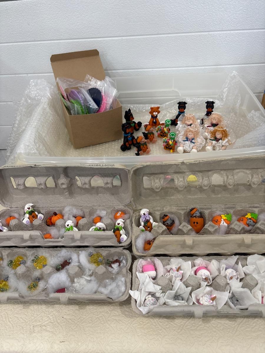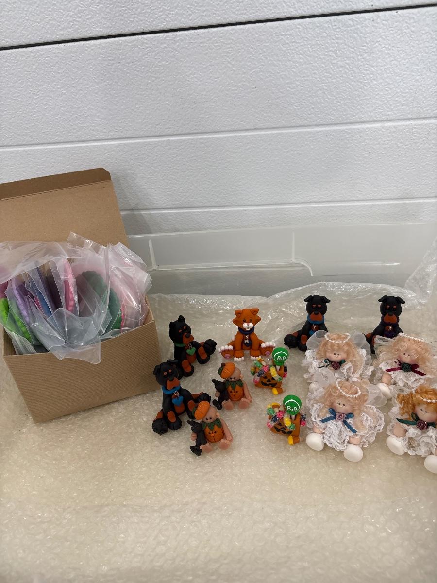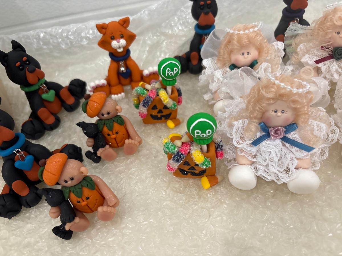 Assortment of polymer, ornaments, including dogs, angels and pumpkin in the tote.