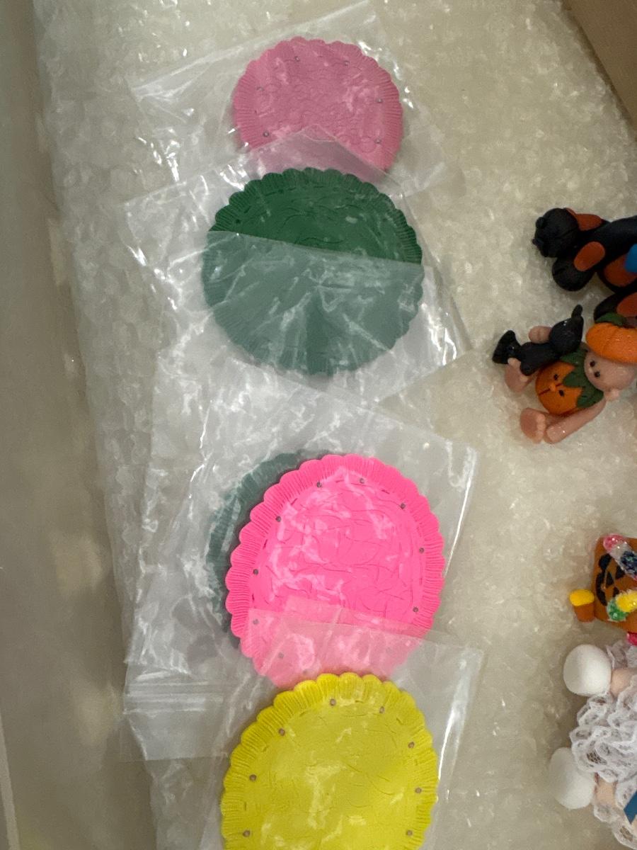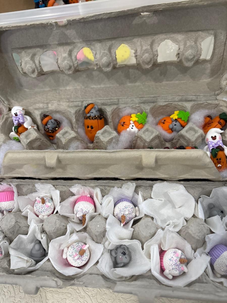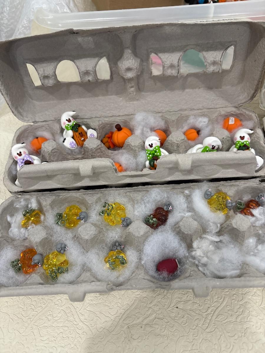 Assortment of polymer, ornaments, including dogs, angels and pumpkin in the tote.