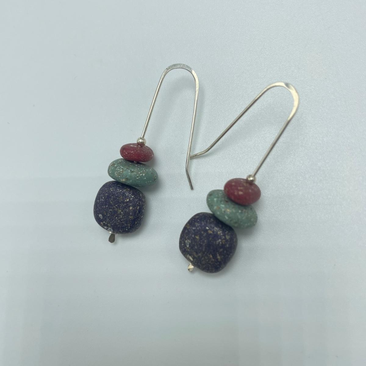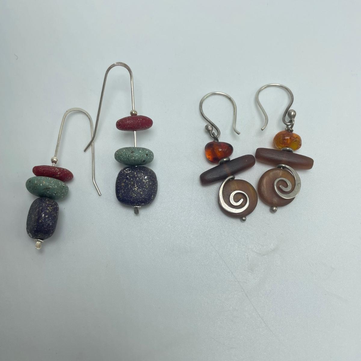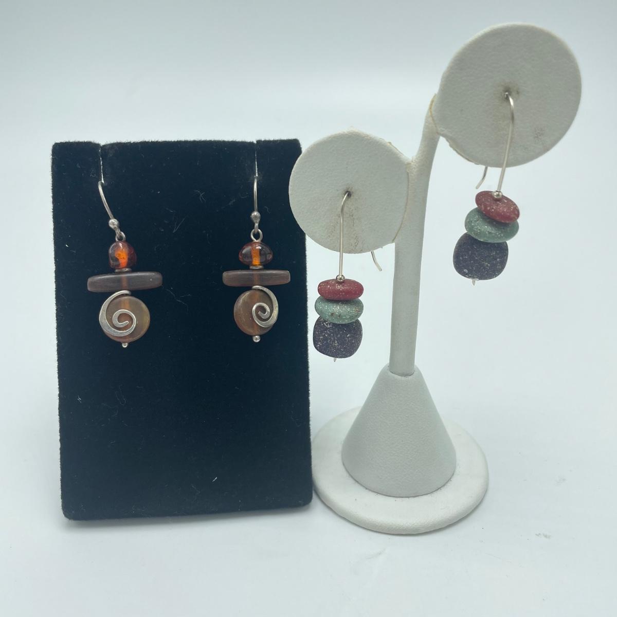 Tamera Wells, Southern Highland's Craft Guild jeweler earrings with stacked polymer pebble earrings. Lot also contains another pair of French hook earrings with what appears to be an amber pebble stacked on resin beads with silver accents. See images. Shipping available.