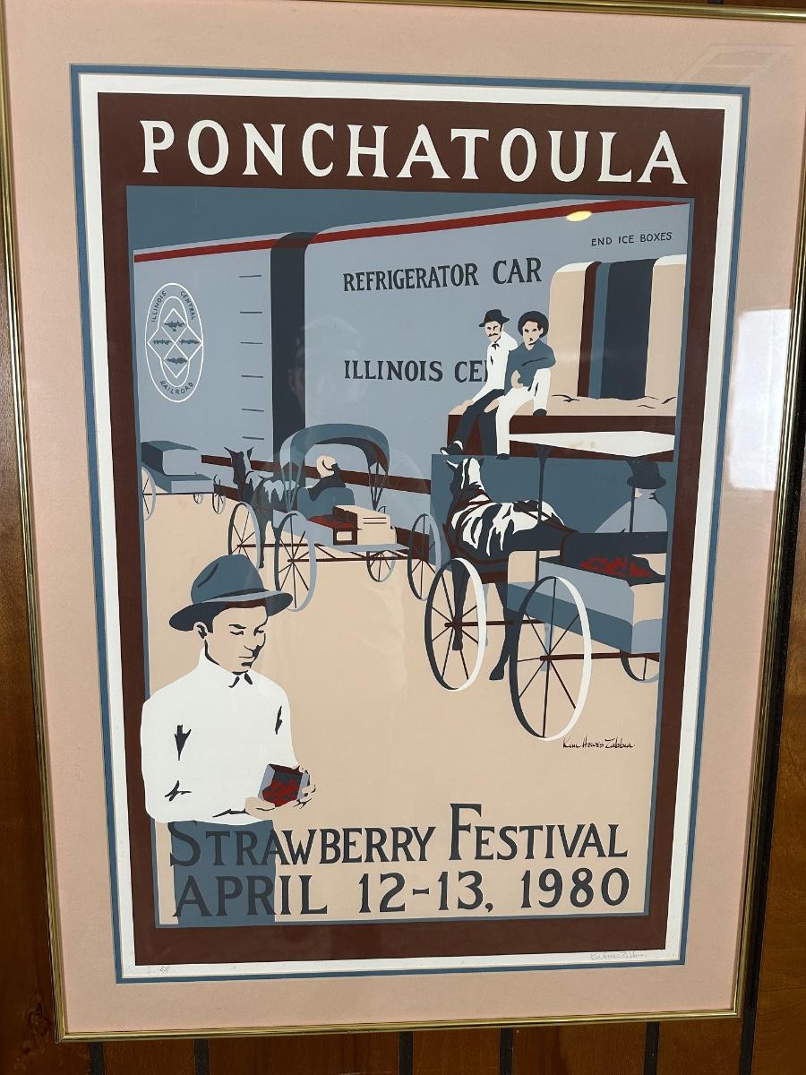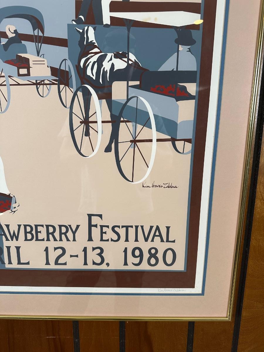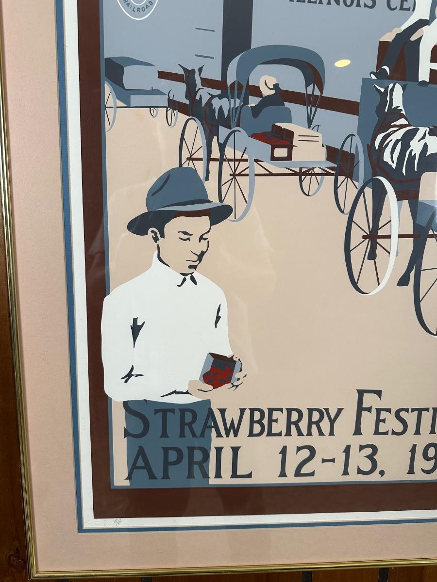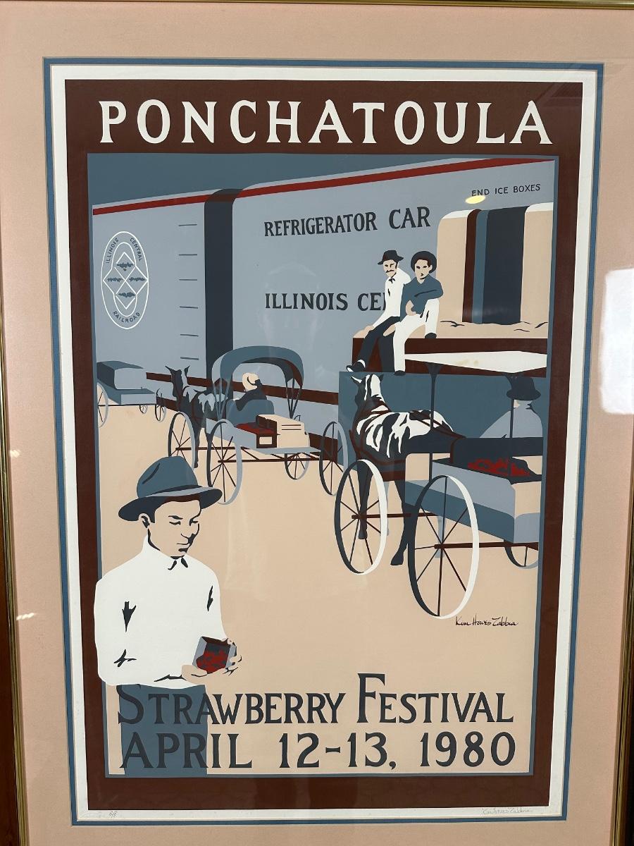 Framed limited-edition art print commemorating the Ponchatoula Strawberry Festival, April 12–13, 1980. Features vintage railroad strawberry transport scene. Signed by artist Kim Hovey Zabbia and hand-numbered
